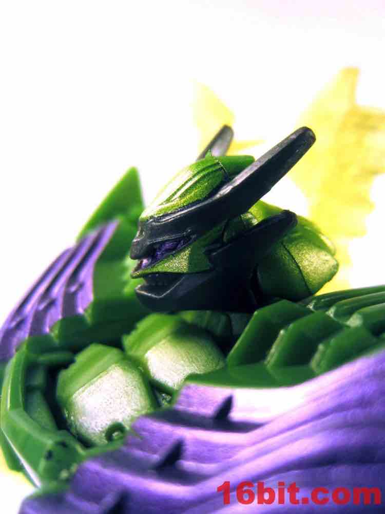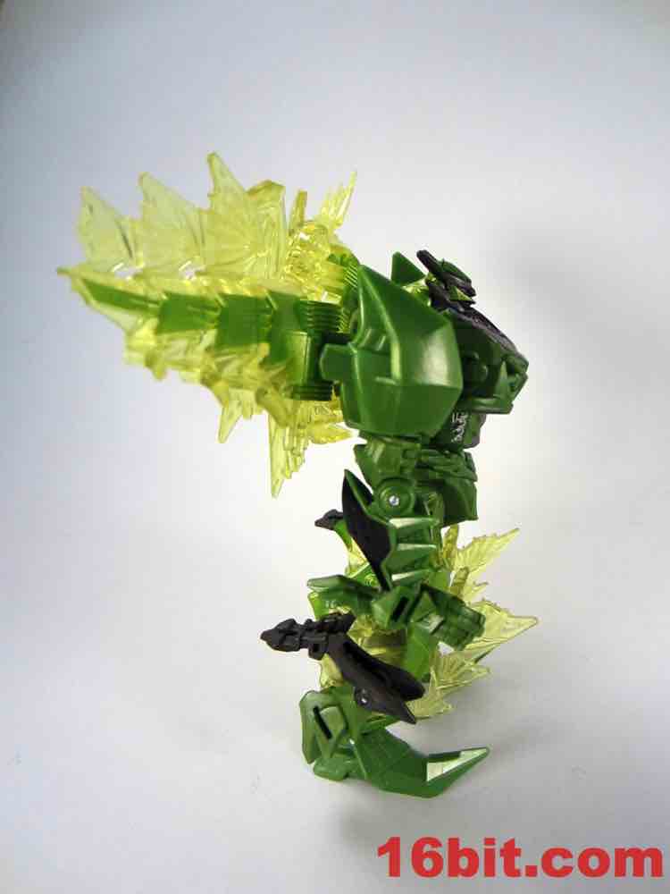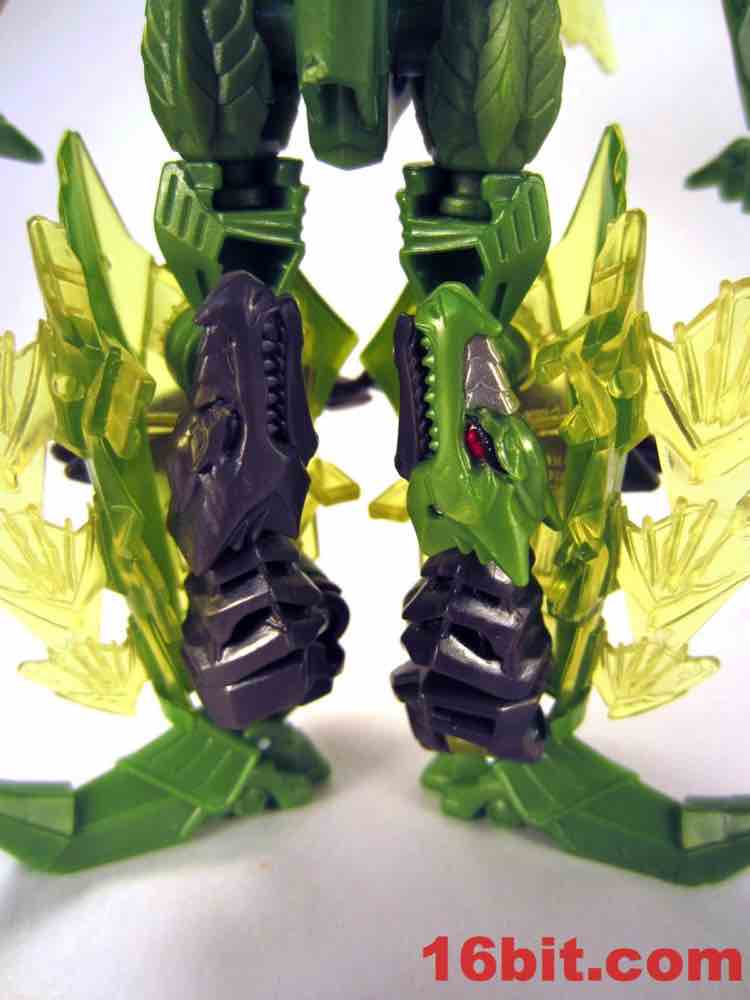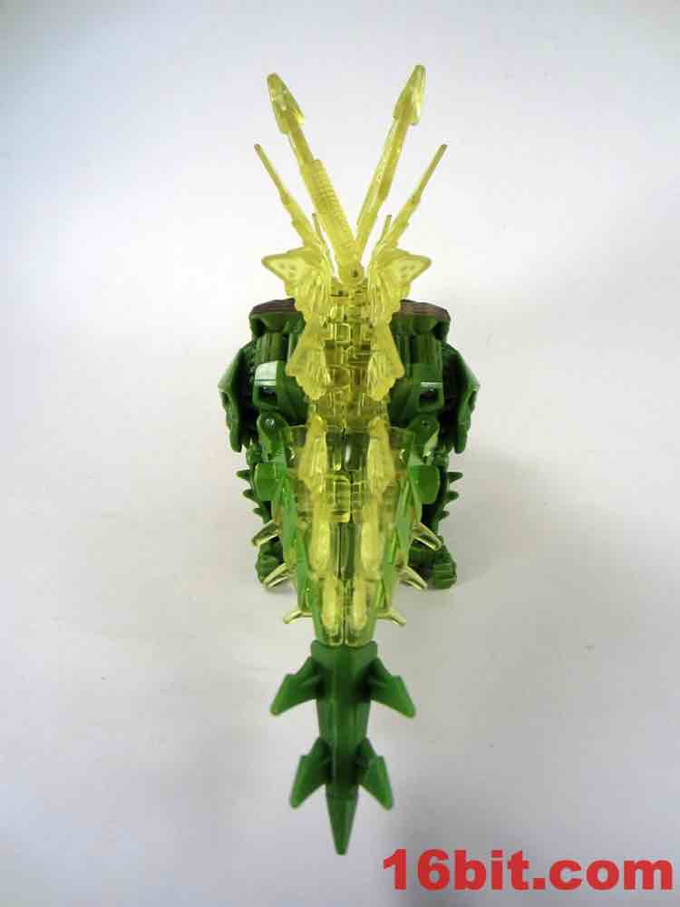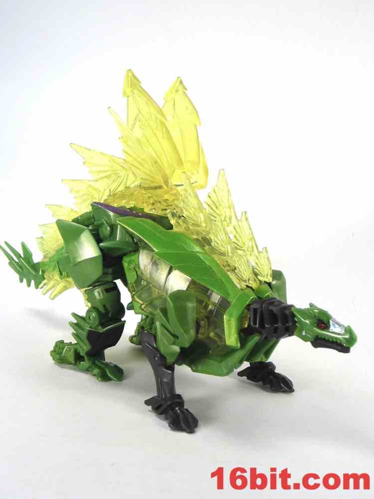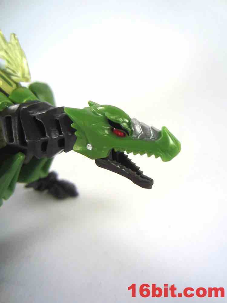 Anyway. Packaged in dinosaur mode, the nearly 8-inch creature is quite a departure from previous Snarl toys to the point where, other than for trademark purposes, one has to wonder why the name was even brought back. The figure is green with translucent plates, including a folding "axe head" piece that supposedly should fit in a groove on his back. Oddly, the hole is too tight for it, resulting in the piece popping out - I didn't have this problem with the aforementioned gold version. Everything else fits in place nicely so you've got a mostly stable and solid figure that doesn't quite tab together at the mid-back region. It's neat to look at, though, and the head has an opening jaw. Of course, even weirder is in the transformation in that a second head becomes visible for reasons unknown.