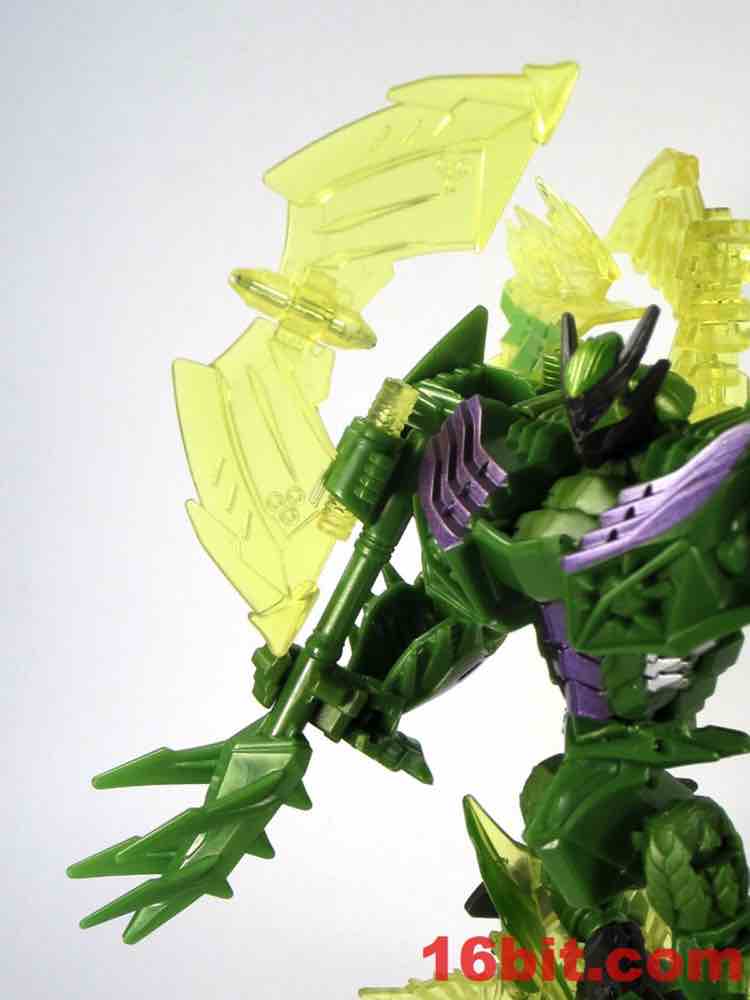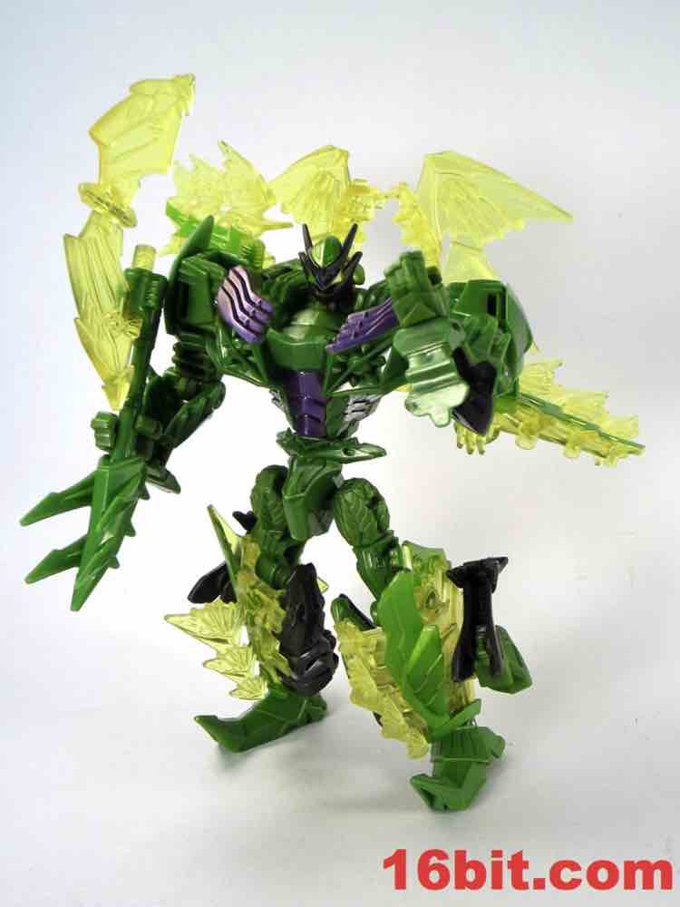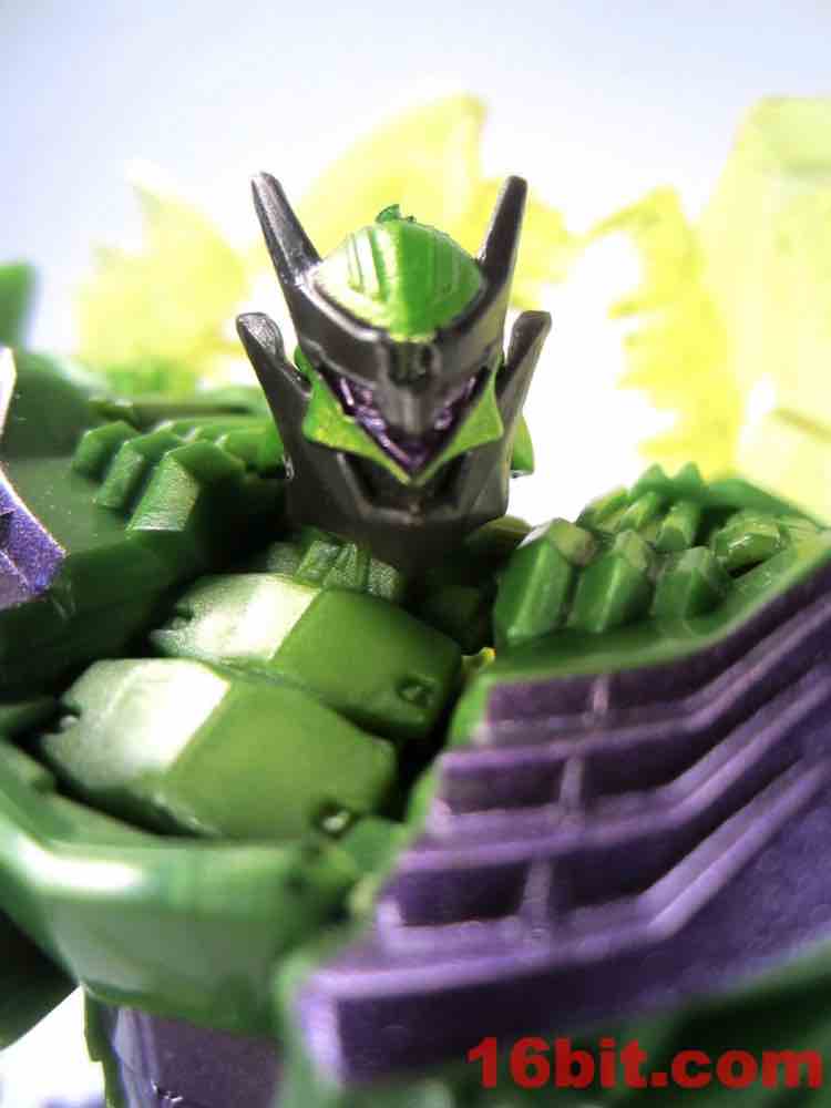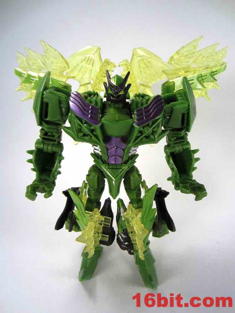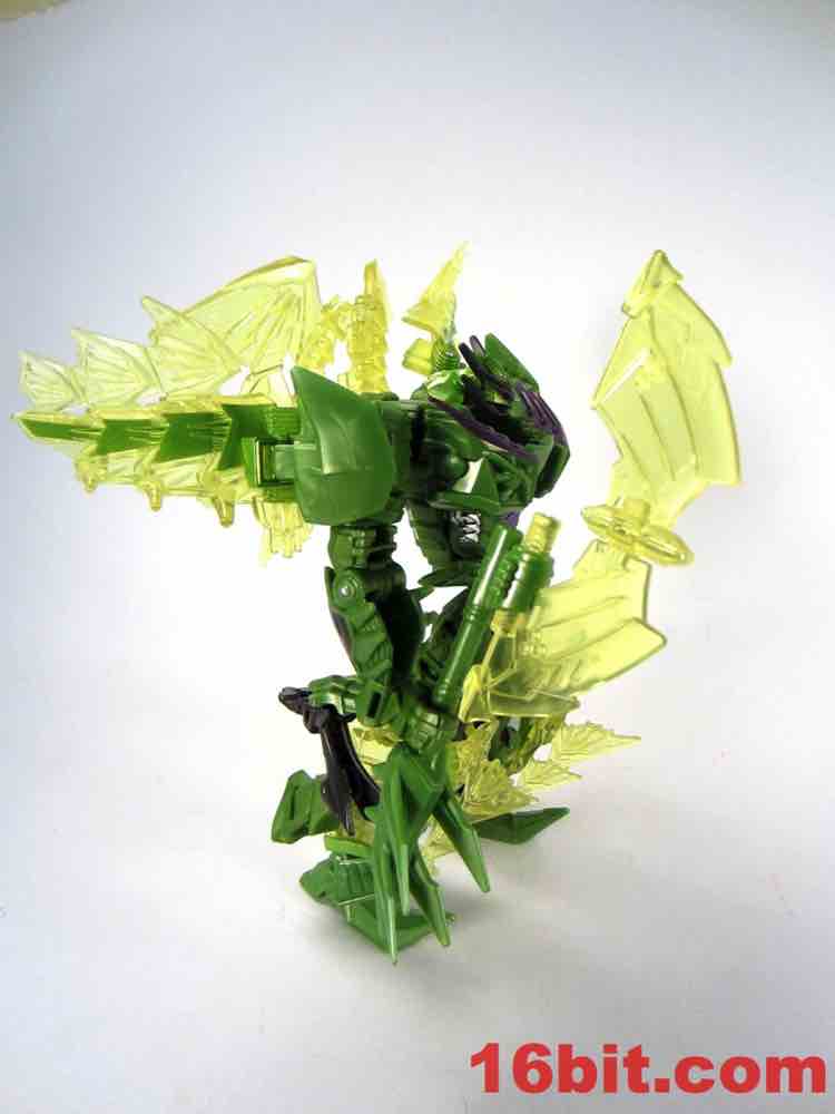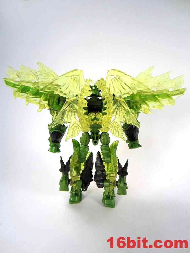 Anyway. Packaged in dinosaur mode, the nearly 8-inch creature is quite a departure from previous Snarl toys to the point where, other than for trademark purposes, one has to wonder why the name was even brought back. The figure is green with translucent plates, including a folding "axe head" piece that supposedly should fit in a groove on his back. Oddly, the hole is too tight for it, resulting in the piece popping out - I didn't have this problem with the aforementioned gold version. Everything else fits in place nicely so you've got a mostly stable and solid figure that doesn't quite tab together at the mid-back region. It's neat to look at, though, and the head has an opening jaw. Of course, even weirder is in the transformation in that a second head becomes visible for reasons unknown.