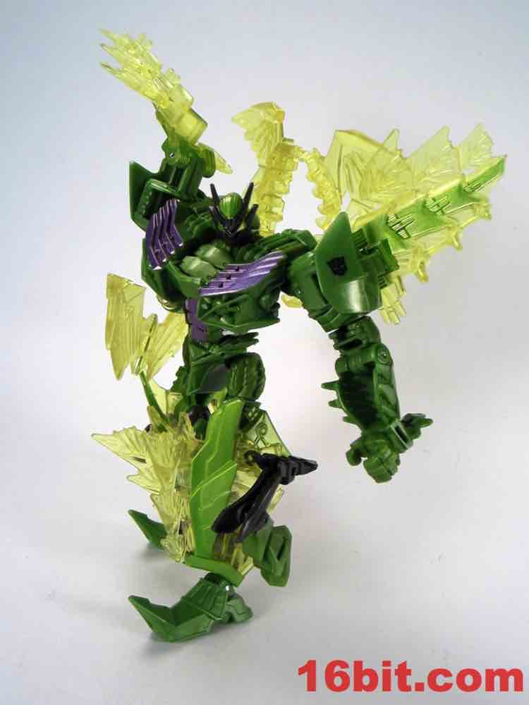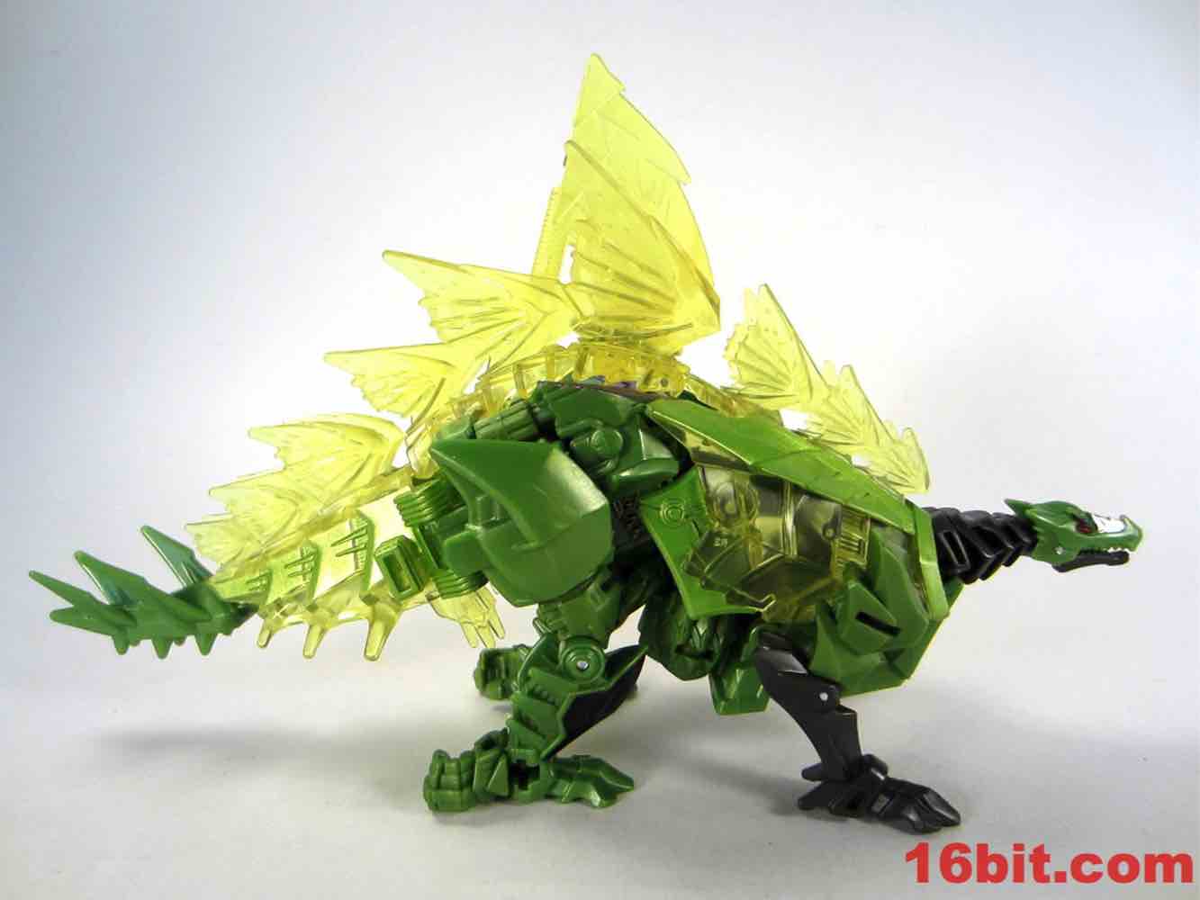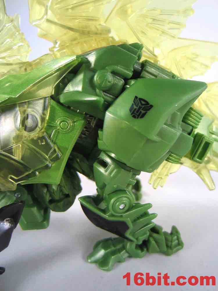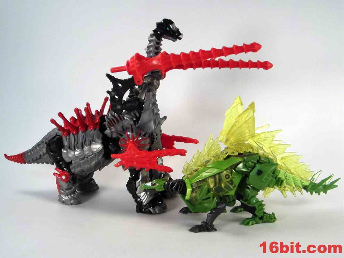 His weapon - or weapons - offer you options. The spiky tip of his tail becomes a nice club, and the removable plates become a sort of a hatchet weapon. They can be combined into a single, nasty sharp weapon of death that looks both cool and goofy. Purple and silver deco on the figure's body really do a great job bringing it to life, and it helps the mostly green figure from being bland. The arms and legs are almost completely green and could benefit from more color, but it's still pretty nifty. The technological stegosaurus is also fun, but he doesn't feel as much a part of the team as the other movie Dinobots.