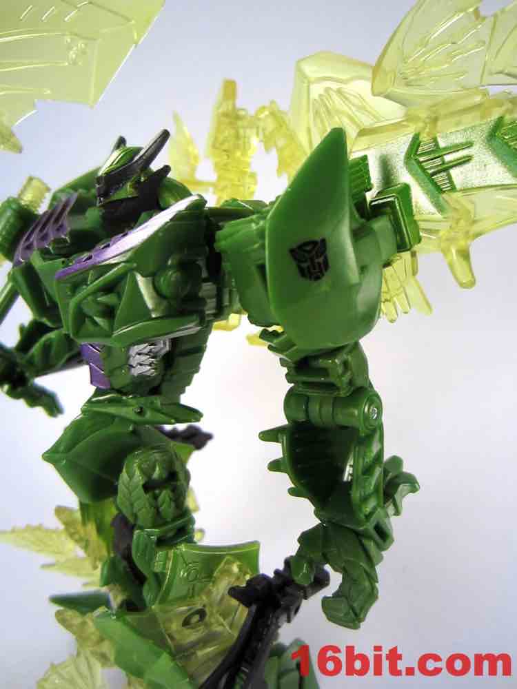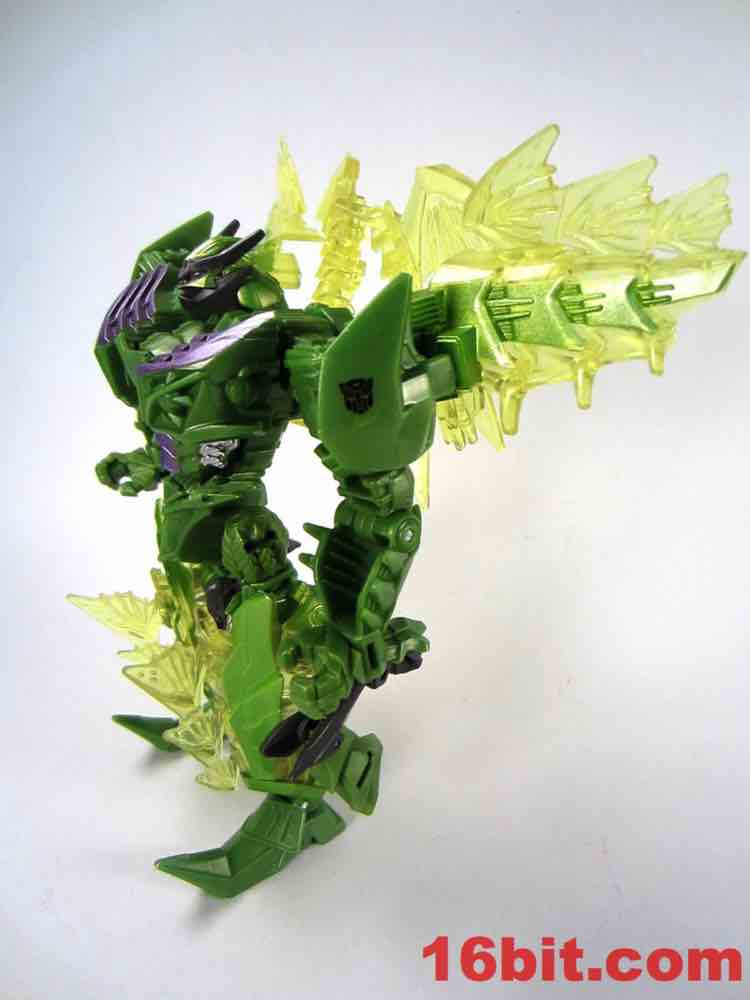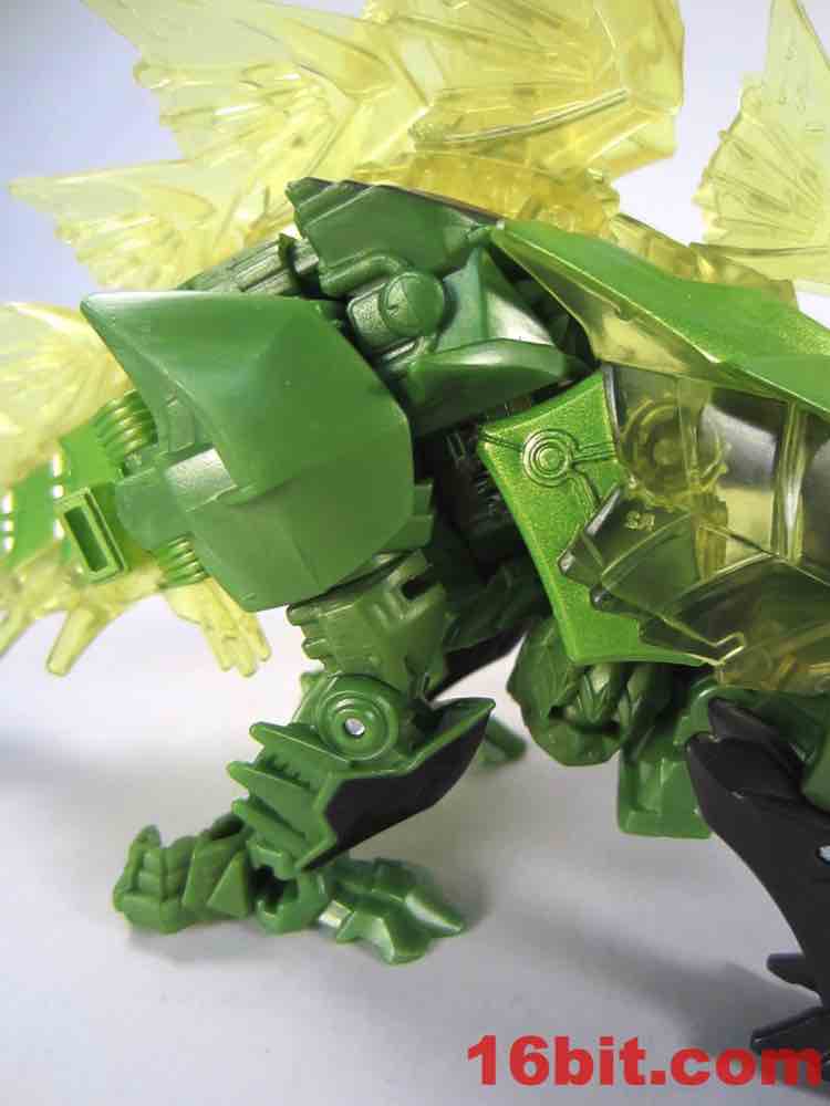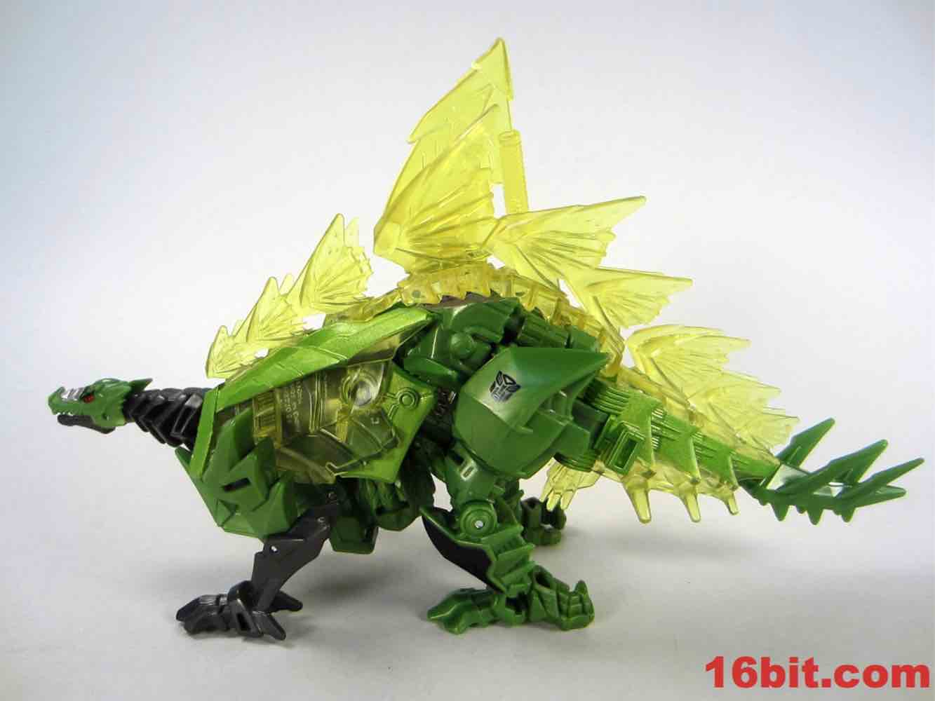His weapon - or weapons - offer you options. The spiky tip of his tail becomes a nice club, and the removable plates become a sort of a hatchet weapon. They can be combined into a single, nasty sharp weapon of death that looks both cool and goofy. Purple and silver deco on the figure's body really do a great job bringing it to life, and it helps the mostly green figure from being bland. The arms and legs are almost completely green and could benefit from more color, but it's still pretty nifty. The technological stegosaurus is also fun, but he doesn't feel as much a part of the team as the other movie Dinobots.