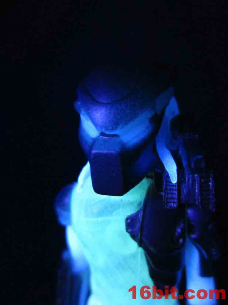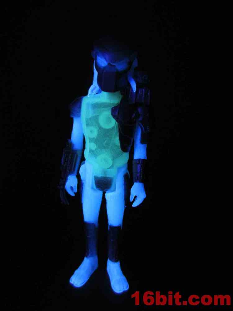 I like the Predator (Glow Version) ReAction Figure. I should - I asked for it to be made! The idea was originally "Hey, remember the Stalker Predator? Let's do a new one." I was expecting an unpainted figure cast in glow-in-the-dark plastic, and what we got was something a little better - the final figure is different than the prototype images, too! A bit of silver defines the figure's face, and a few gaps in the silver let the glow shine through in a dark room. If you hit the figure with a black light, you will undoubtedly notice a very significant difference.