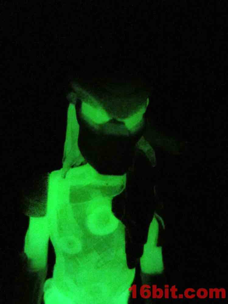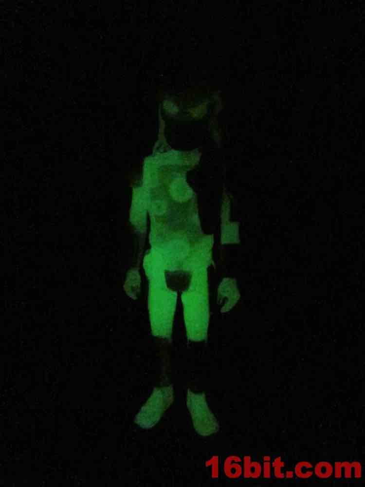 Funko's glow-in-the-dark plastic for Pop! Vinyl figures and Wacky Wobblers isn't always super-bright, and when put under the standard studio lights in my office you'll notice it is relatively dim compared to Glow Ghosts Baggs and the Glow in the Dark Gobon figures. If you happen to have a black light bulb (roughly $5 at Walmart) you'll notice a big difference - the Predator suddenly glows significantly brighter and the end result is a much, much better glow than your standard light bulbs. The hair, eyes, and most of the body light up nicely under these conditions.