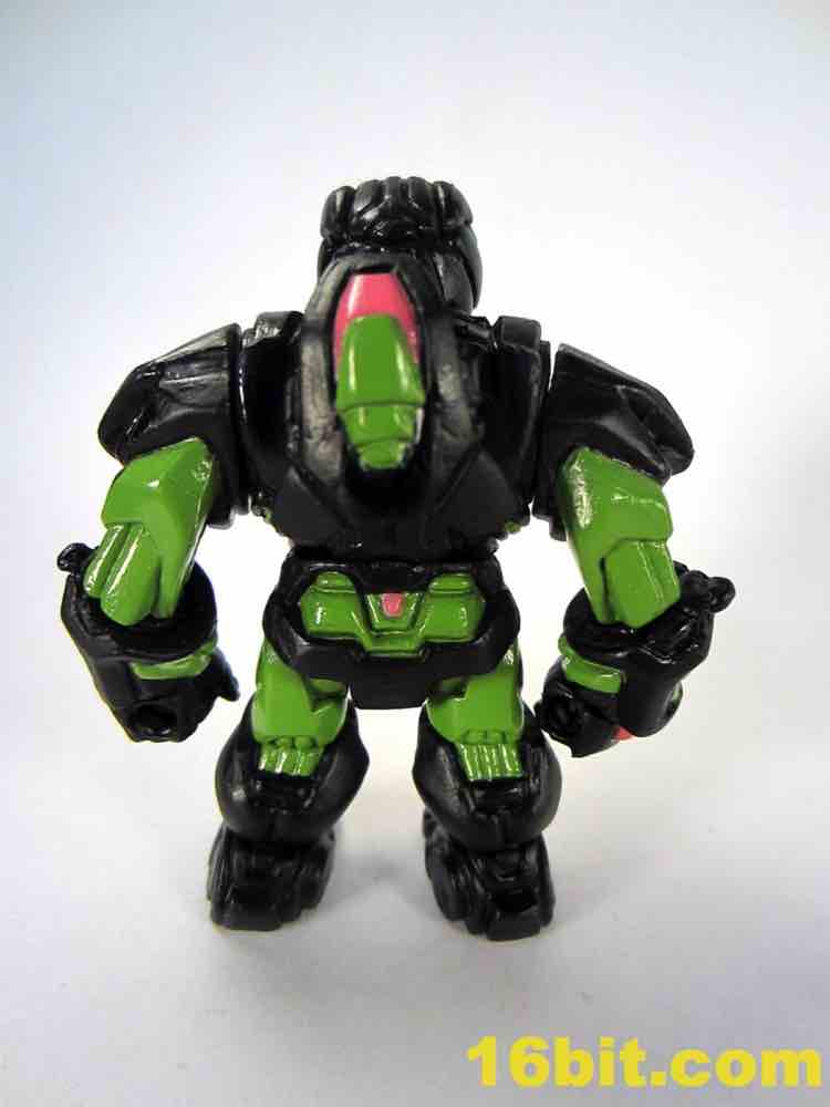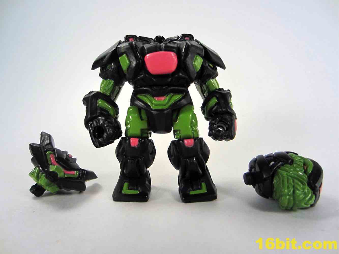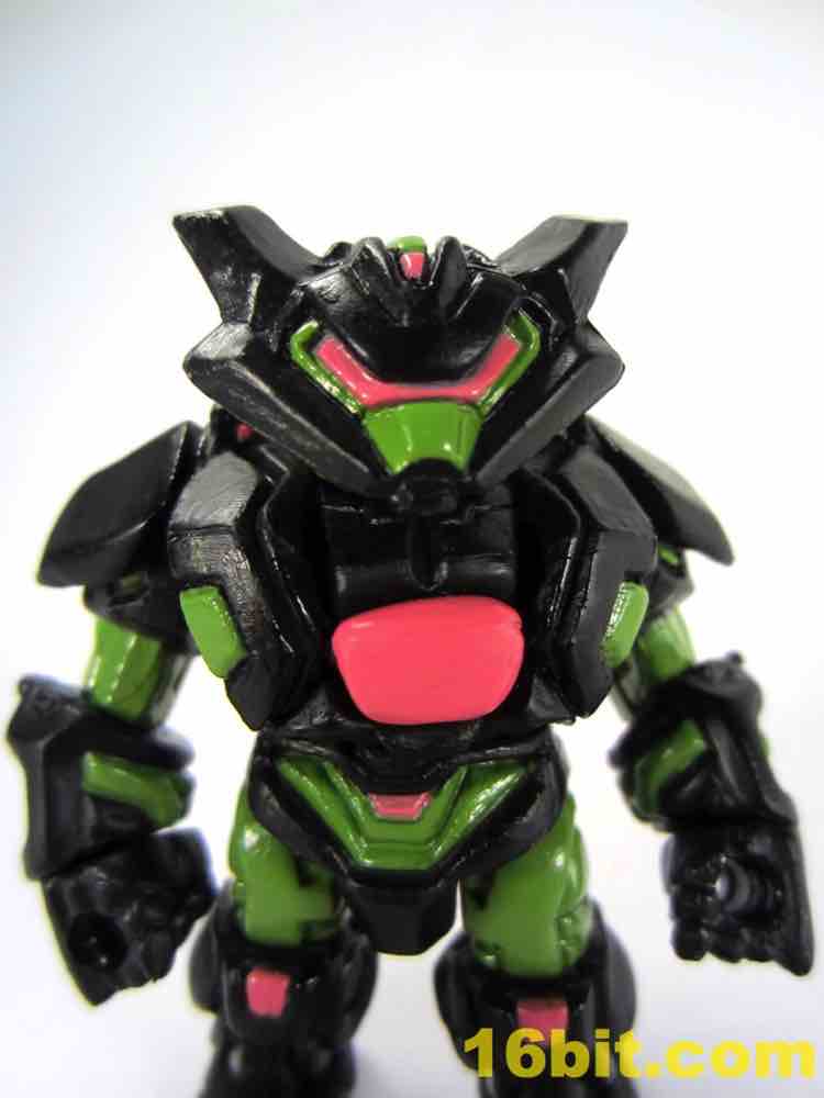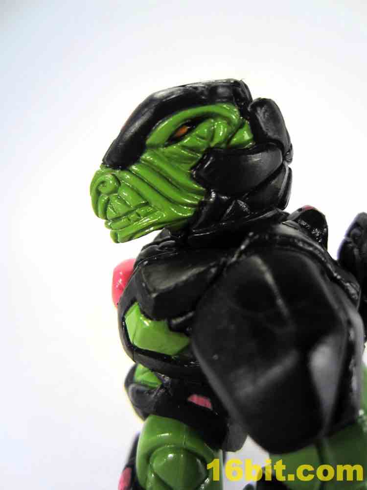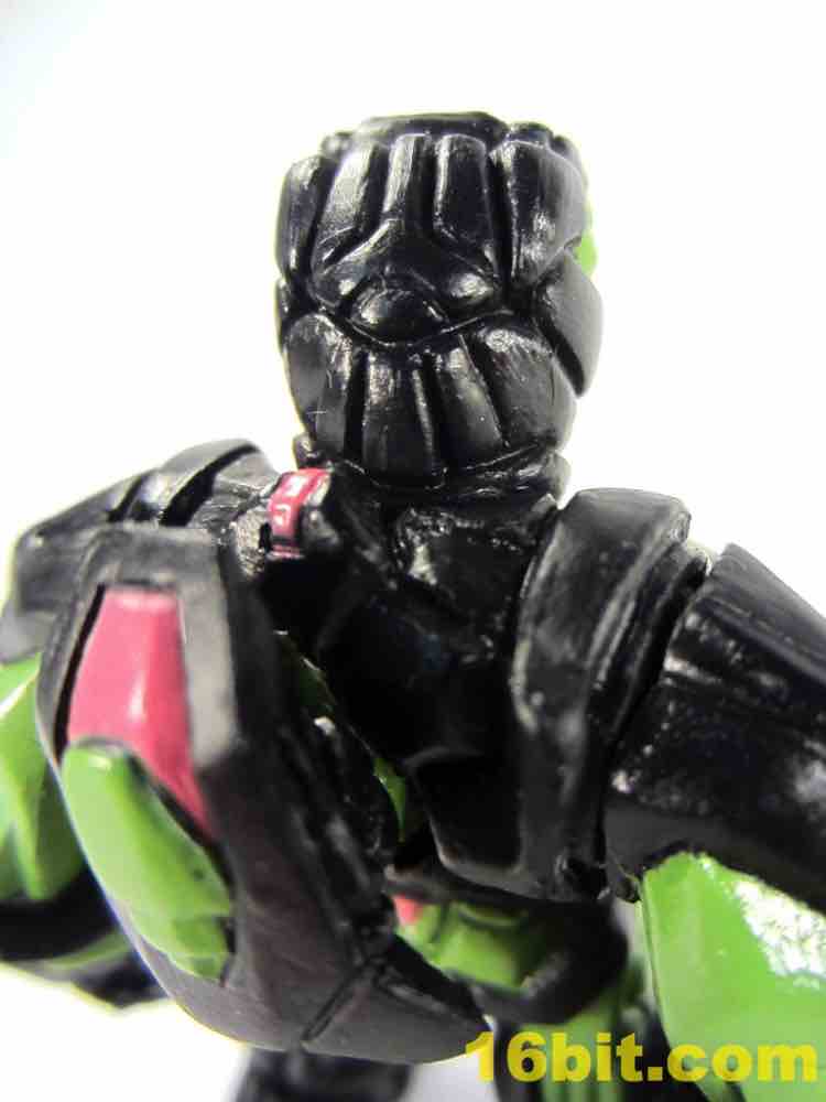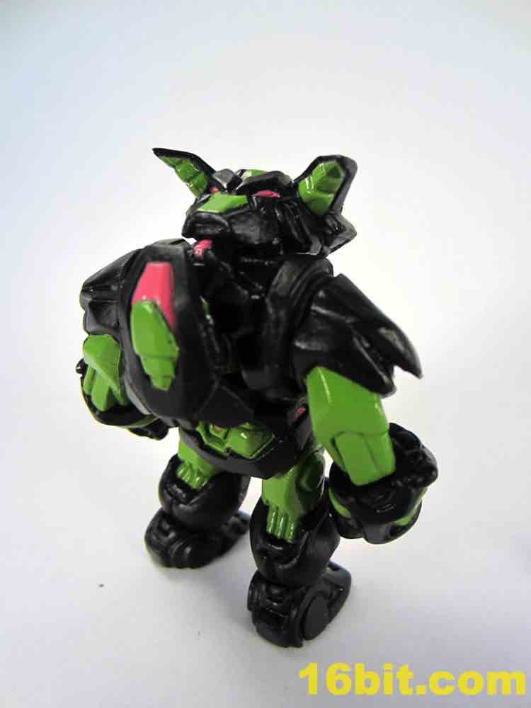 This Neo Granthan is cast in black plastic which seems similar (if not identical) to my Hades Mimic Armorvor from a few years ago. The paint is clearly different, drawing inspiration from... I'm not sure. It feels like it's drawing from a few different baddies from the 1980s as well as Animated Lockdown, with a pink "Black Core" and green highlights. The main reason to buy this figure - assuming you don't already own an Armorvor - is that introduces the long-teased new head. We didn't know what it was going to be, and the furry wolf head has been replaced by a helmeted head that looks sort of like the love child of a dinosaur and a Power Lords creature, done up in the Onell Design house style.