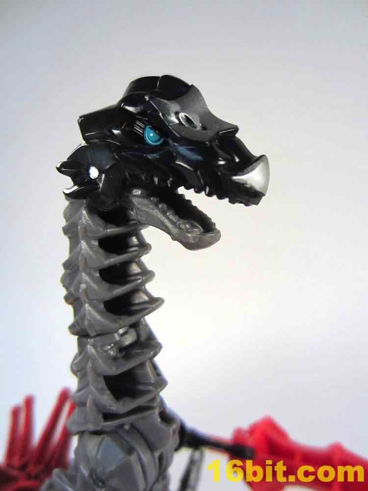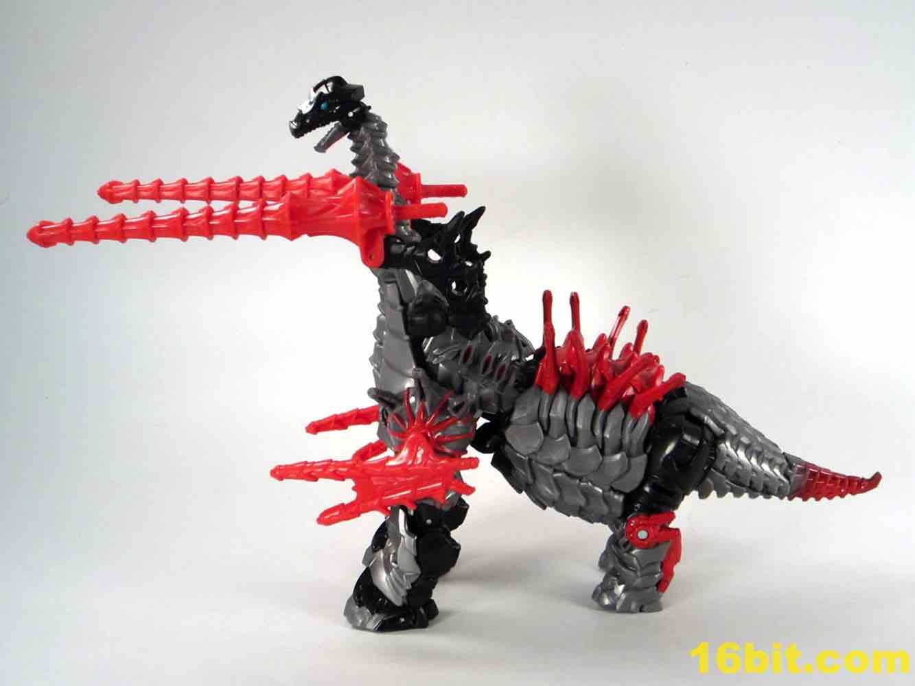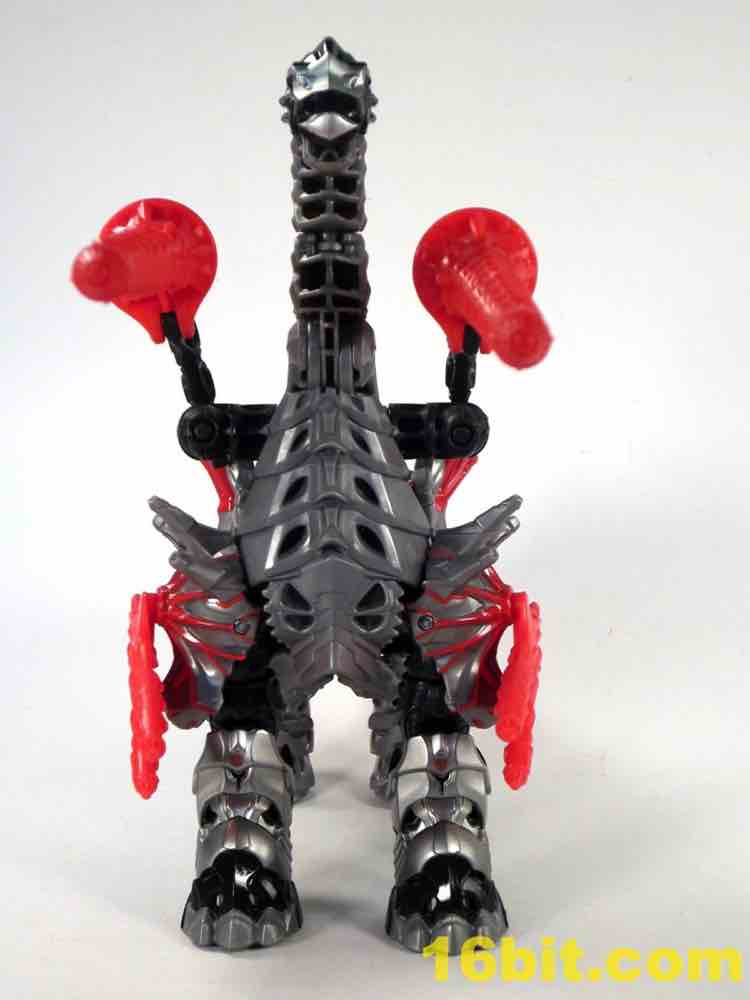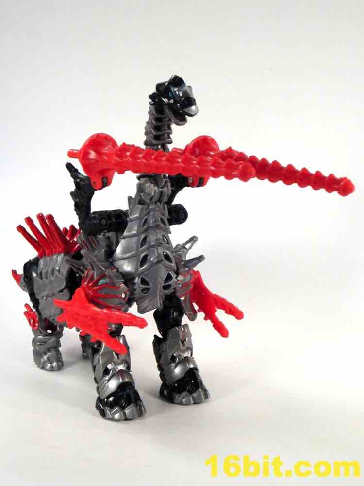 Transformation is a mix of clever and frustrating. His dino chest is soft rubber so it's sort of cheaty, and numerous panels shift and rotate to not quite lock into position. I'm quite keen on how the robot legs come to be, but his dinosaur tail looks like a pair of schlongs dueling over his codpiece. And they're bright red-tipped too. It's just... it's not right, man. By and large it does most of what you might expect, but this is one of those few times where I, as a spatially-flawed person who rarely if ever can really offer criticism on a transformation, could go to town. Why not integrate the "swords" into the dinosaur neck? Why not have the tails not look like reproductive organs in robot mode? Why not take a few more minutes so the slots and tabs actually hold together if you move a hip or knee joint?