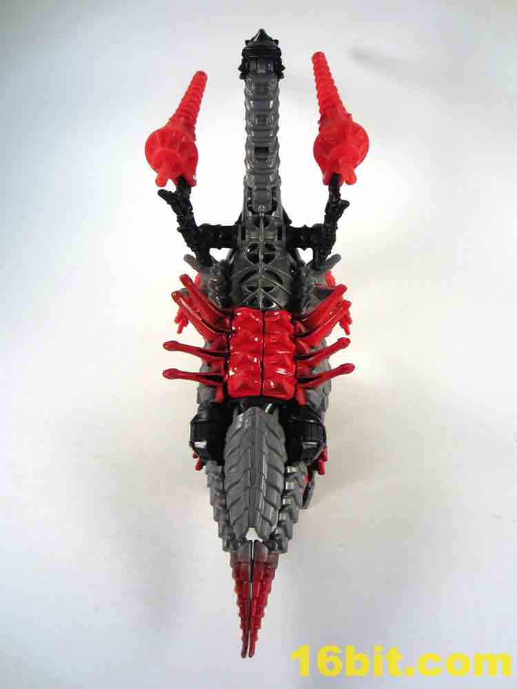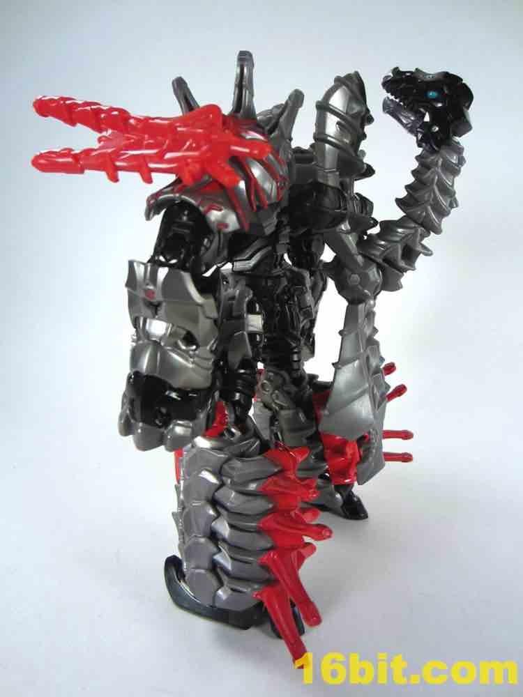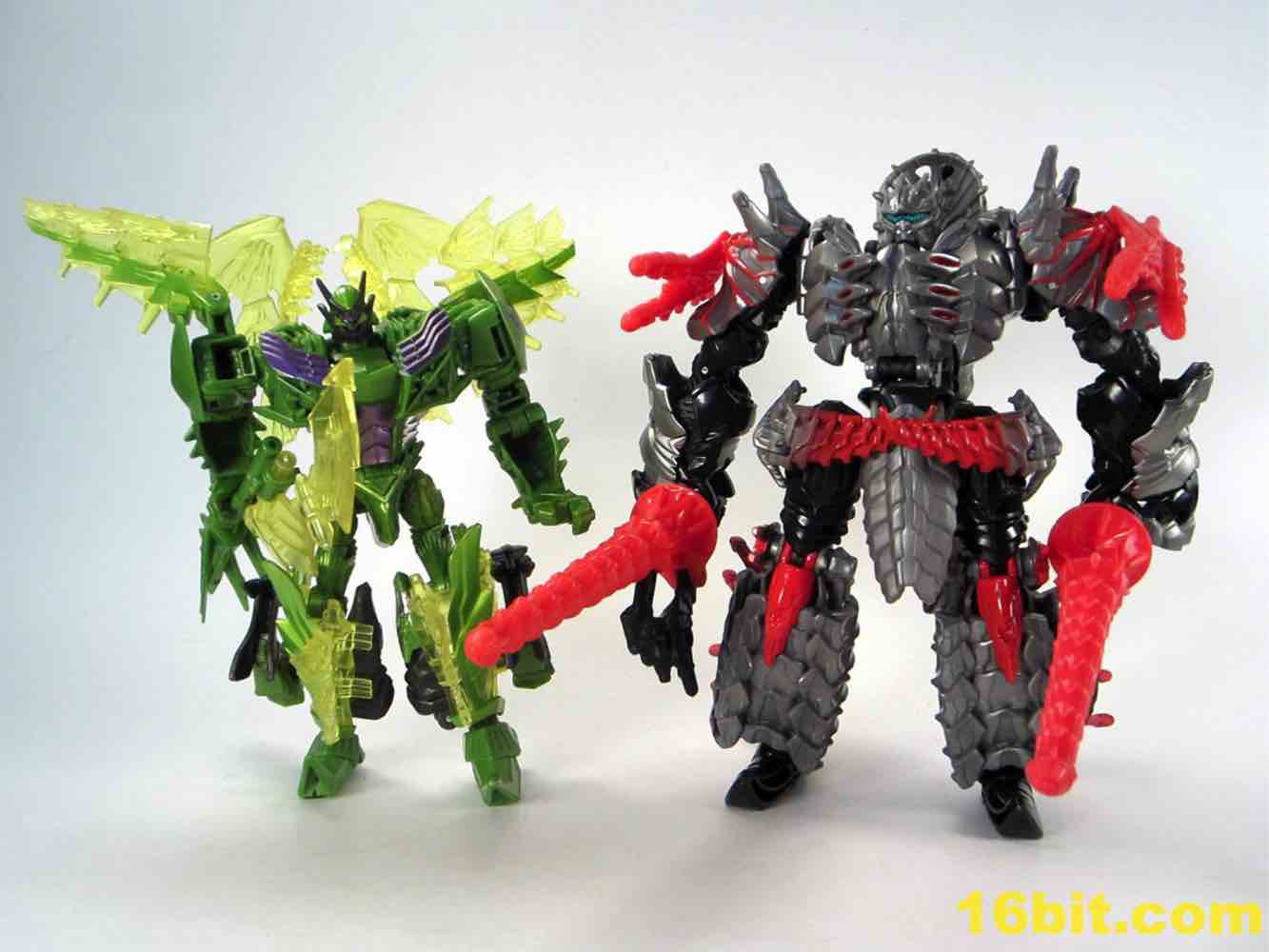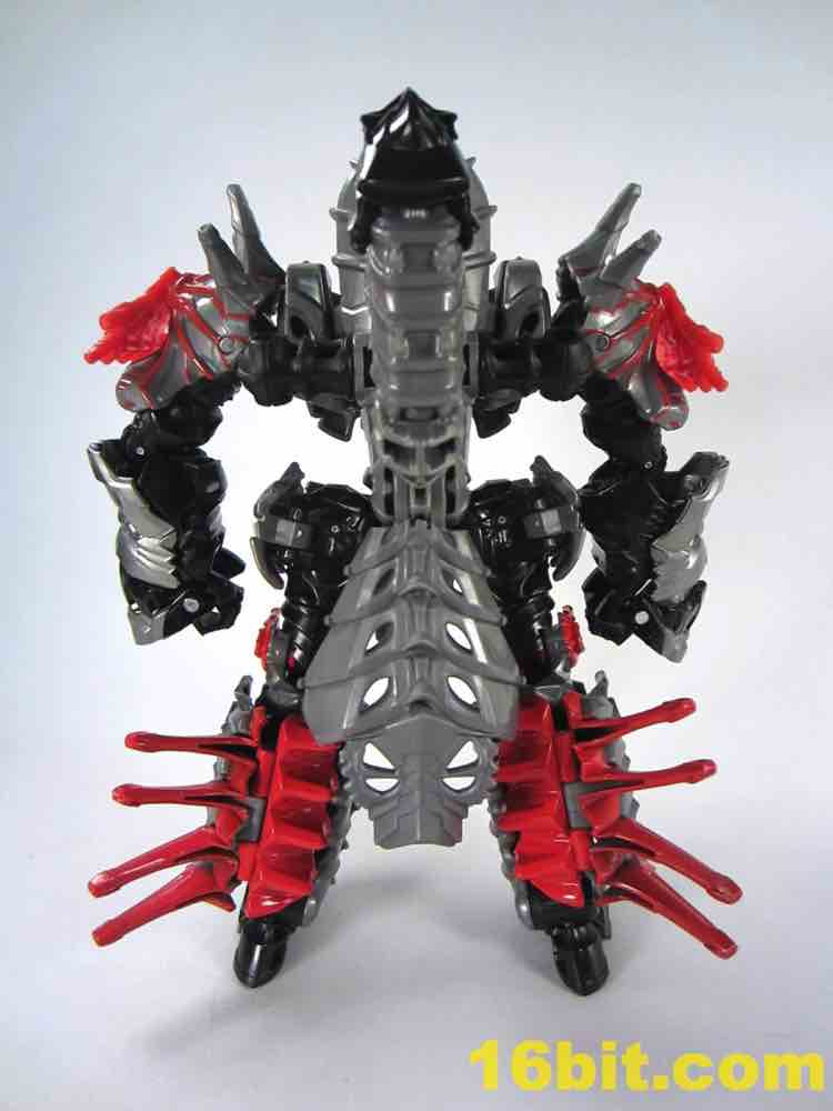 Transformation is a mix of clever and frustrating. His dino chest is soft rubber so it's sort of cheaty, and numerous panels shift and rotate to not quite lock into position. I'm quite keen on how the robot legs come to be, but his dinosaur tail looks like a pair of schlongs dueling over his codpiece. And they're bright red-tipped too. It's just... it's not right, man. By and large it does most of what you might expect, but this is one of those few times where I, as a spatially-flawed person who rarely if ever can really offer criticism on a transformation, could go to town. Why not integrate the "swords" into the dinosaur neck? Why not have the tails not look like reproductive organs in robot mode? Why not take a few more minutes so the slots and tabs actually hold together if you move a hip or knee joint?