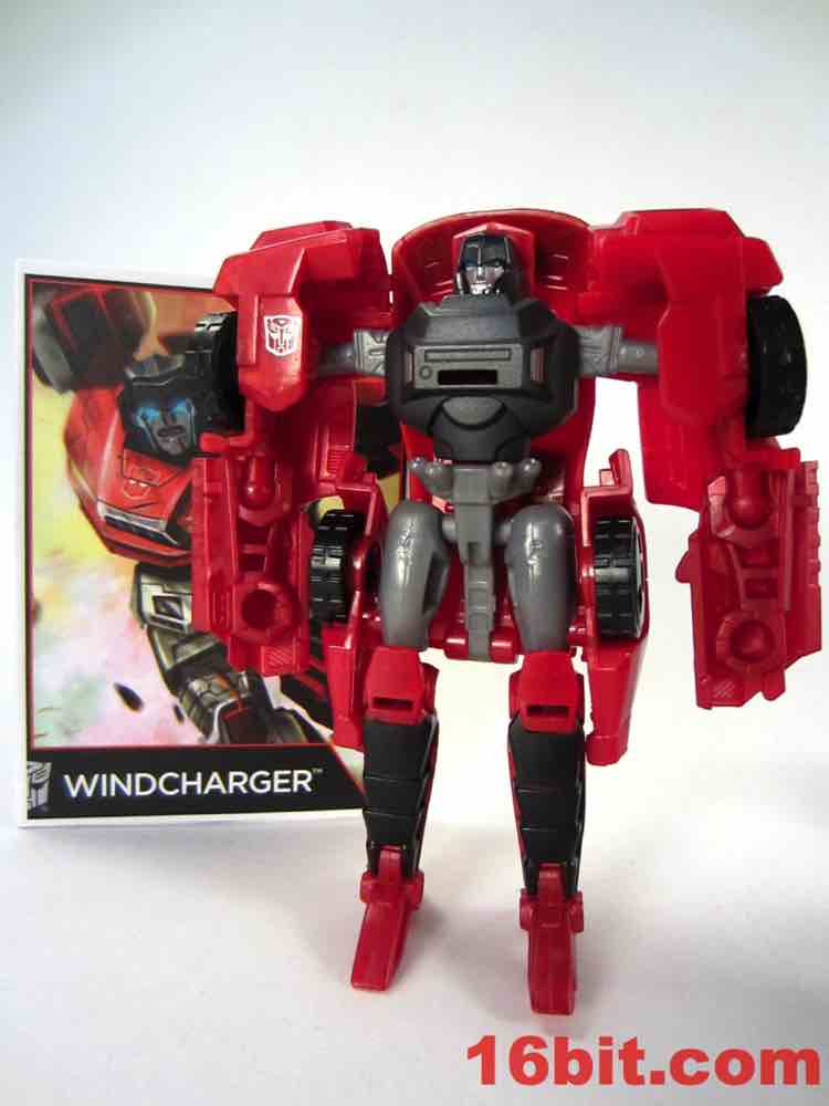 As this kind of redeco goes, they did a nice job hiding that it's a repaint with new colors and a new head. The 3 3/4-inch toy is a bit bigger than his Minibot origins. Each fist is designed to be compatible with 5mm weapons, and the legs are fairly skinny. The deco breakdown is totally different than tailgate, as the chest deco has been dropped in favor of painted kneecaps. You'll find a great Autobot logo on his right arm, plus more paint on Windcharger's face. His blue eyes are a lot better than the dark 2011 version, and the silver paint really brings out the face sculpt.