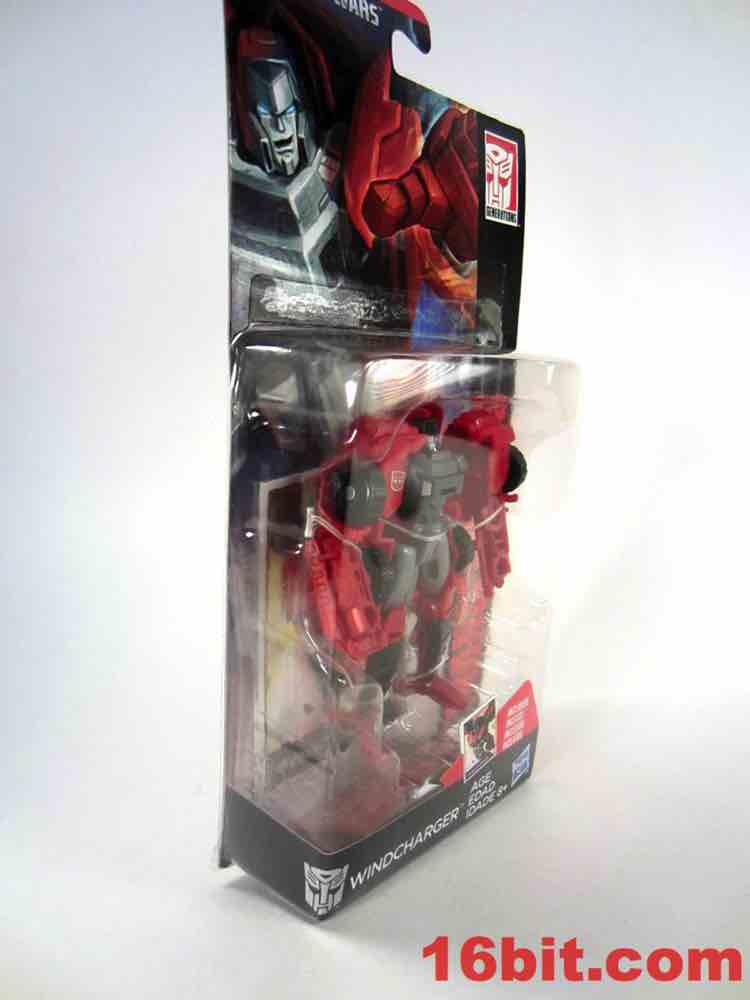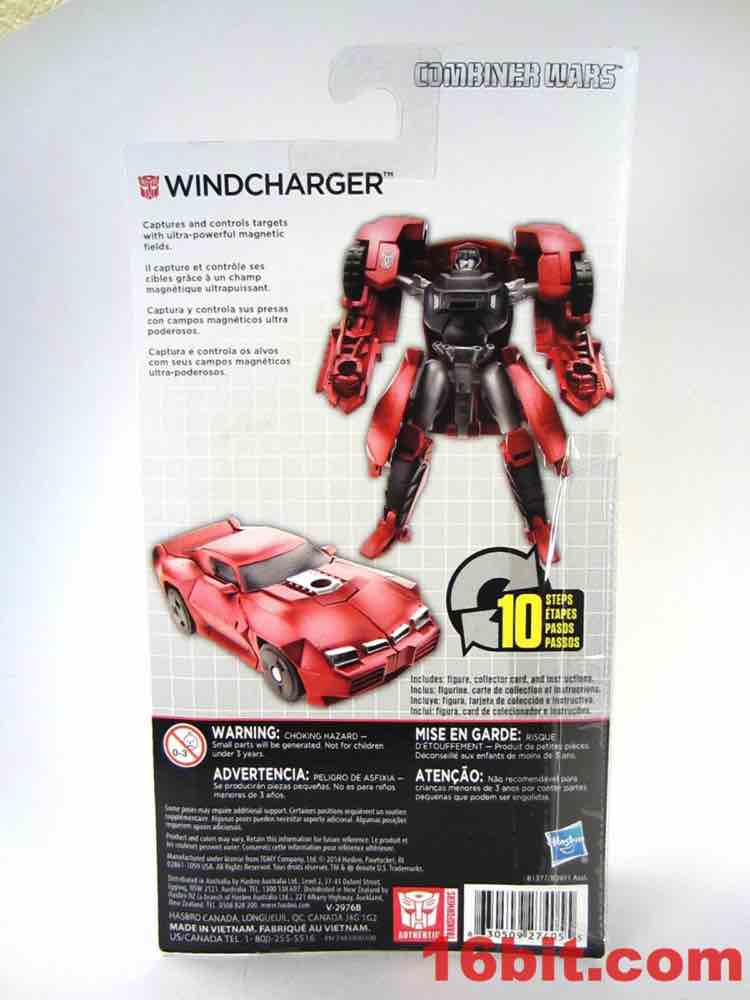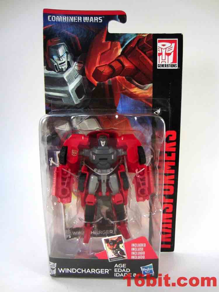 I'd like to take a moment to pick on the packaging. As you can see above, this toy - and indeed many of the Combiner Wars toys - have nifty illustrations on the cardbacks. These are low-res, and you can see the individual pixels easily with the naked eye. It's tougher to see in a digital photo for obvious reasons. It's not unique to Windcharger - most of the new guys seem to have this problem in Generations while Robots in Disguise has very nice, very clean art. I should also note that the art is similar, but not identical to, the super-thick trading card in this package.