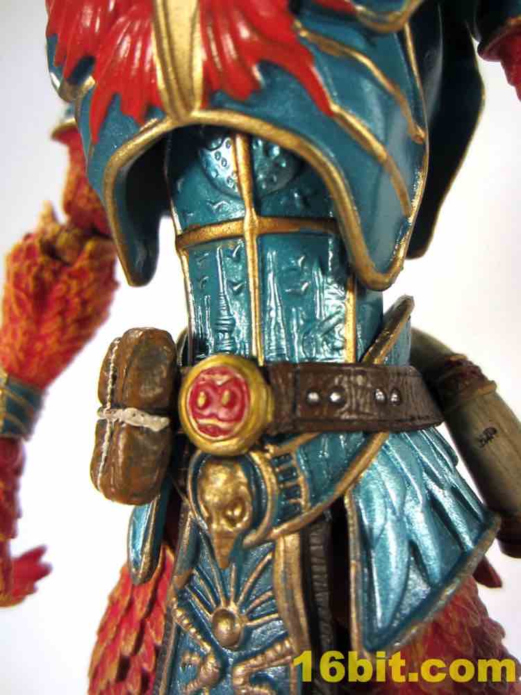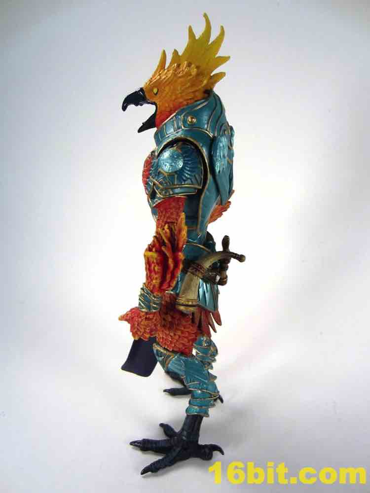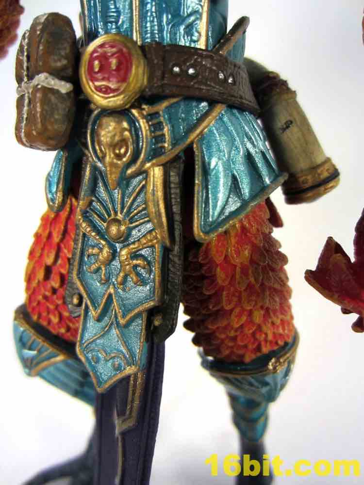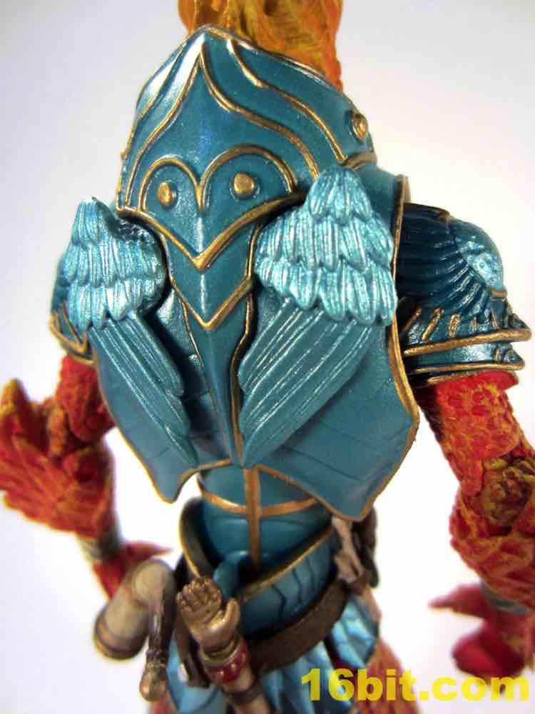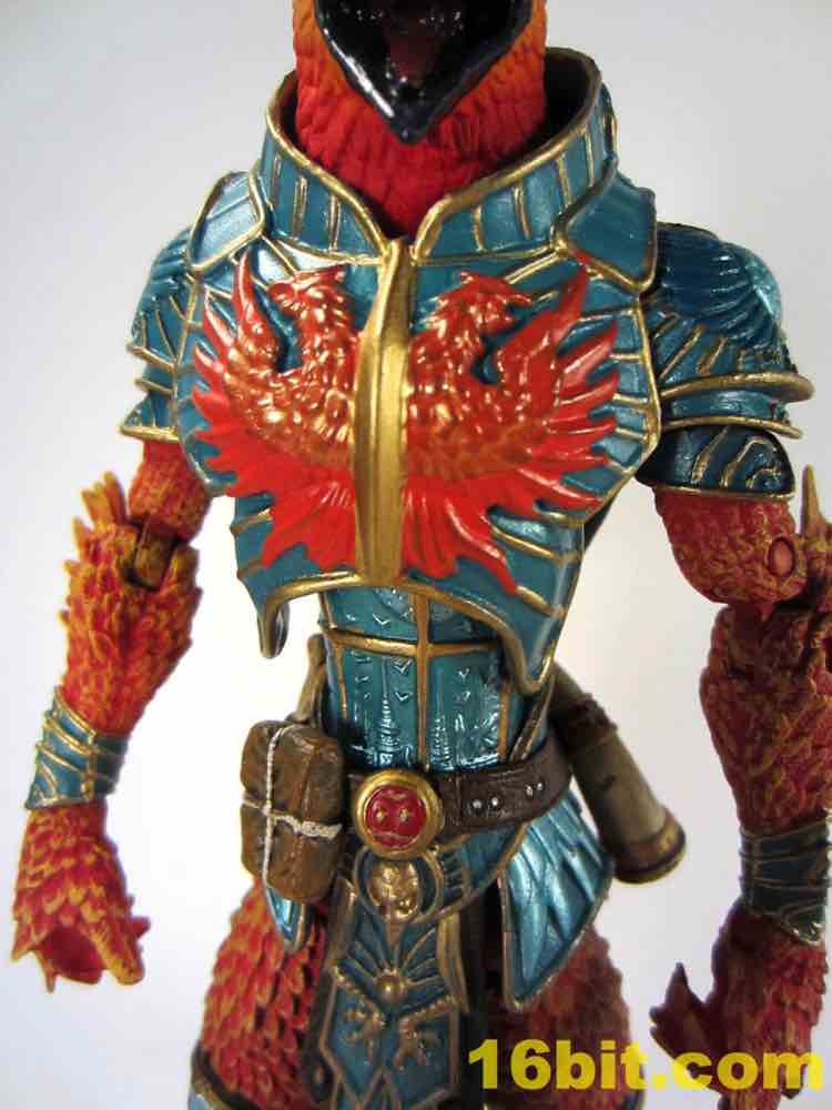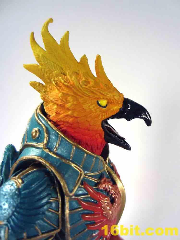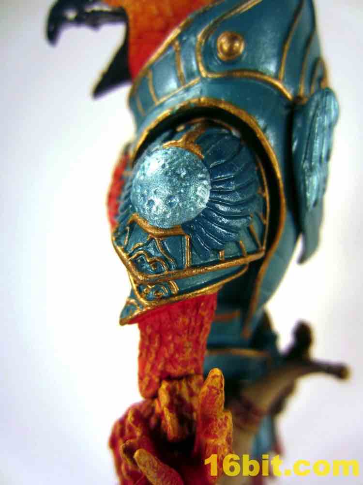 Four Horsemen Gothitropolis Phoenius the Phoenix Action FigureHis armor is also stunning with a metallic blue plate highlighted in gold trim. A big orange flaming bird decorates his chest, and the little castle mural over his belly is toned down a bit for this particular release. The egg-like moon on his shoulders is a lighter blue color, but is similarly toned down a bit. For a figure that's not at all about subtlety or nuance, there are plenty of tiny sculpted details to pick out throughout this one.