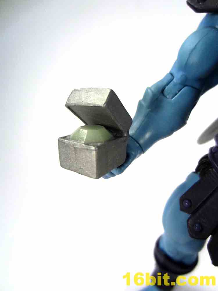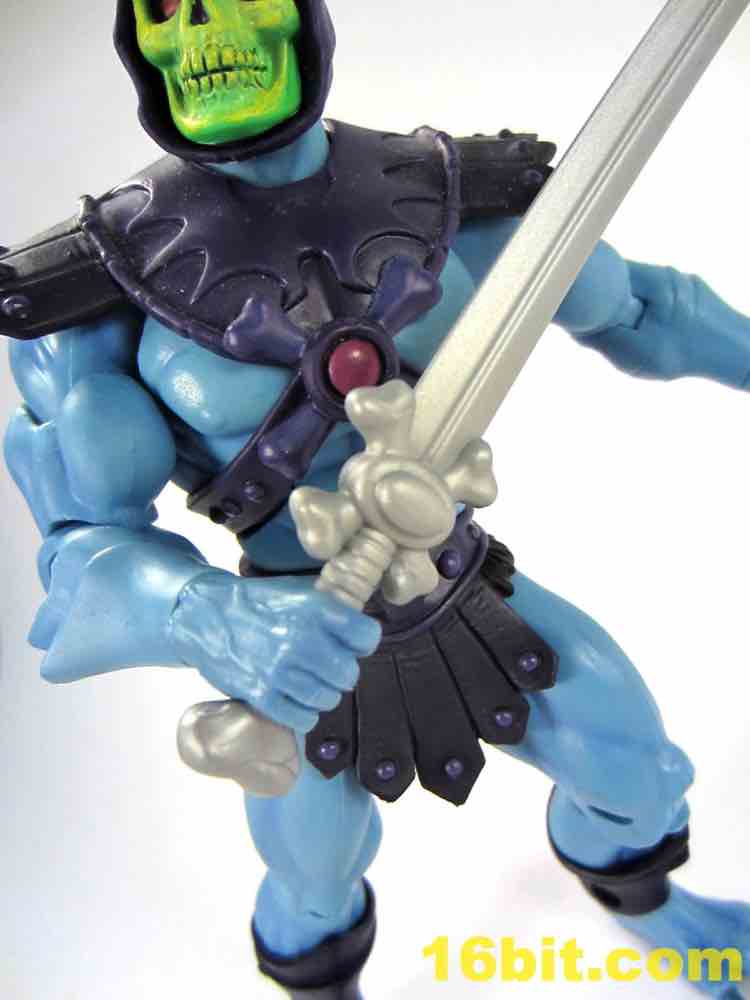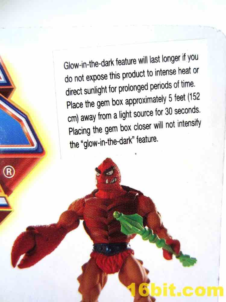 The accessories had some cost-cutting. The Skeletor sword is an awesome sculpt with a bony grip and a design which resembles ol' boneface's armor, but has absolutely no paint. That's good and bad - it's good because the word "CHINA" is now sculpted on the blade rather than being awkwardly painted on it. It fades into the plastic a little more. Also included is a custom-grip Diamond Ray of Disappearance, which comes complete with a glow-in-the-dark gem in the middle. There's also a disclaimer, which I'm not used to seeing on glowing toys. The jewel box is not articulated, but the bottom of it was sculpted to specifically fit Skeletor's hand. It's great!