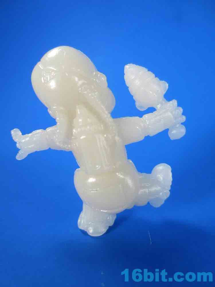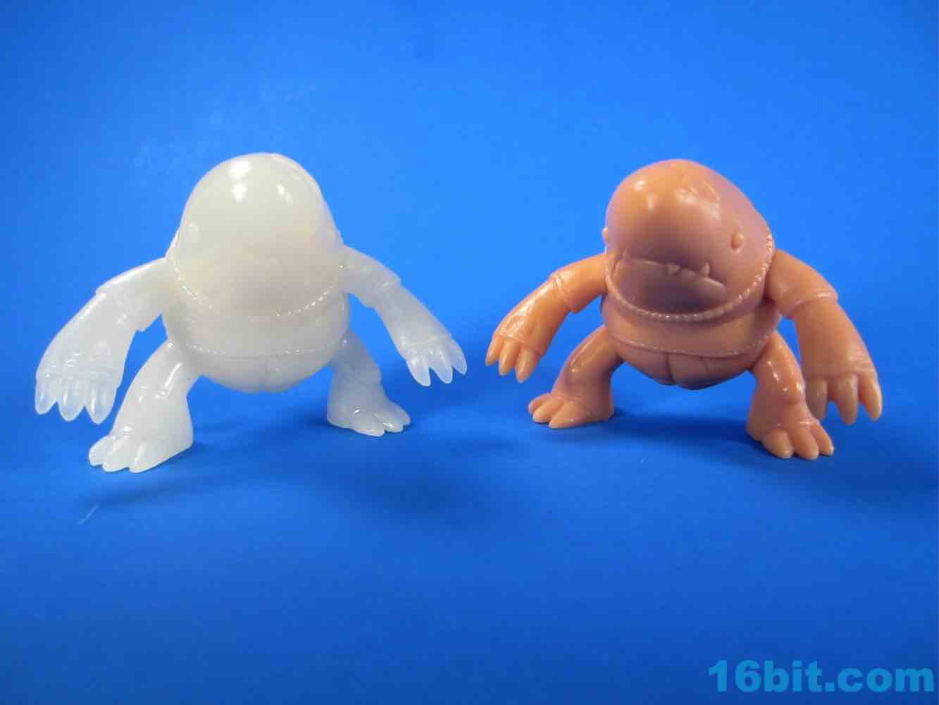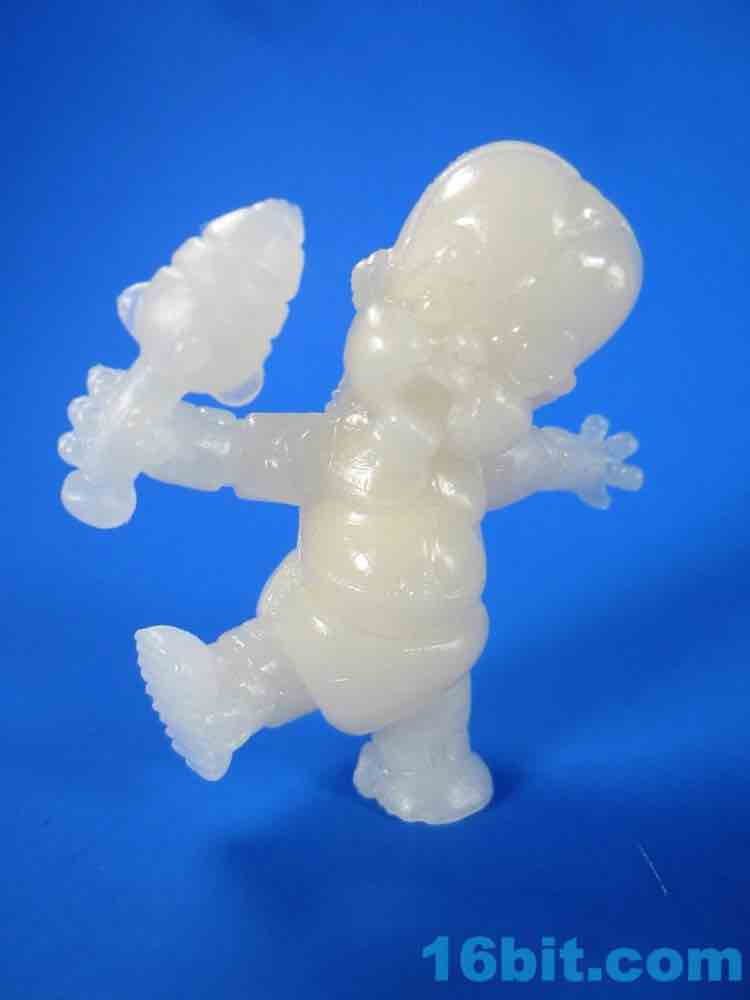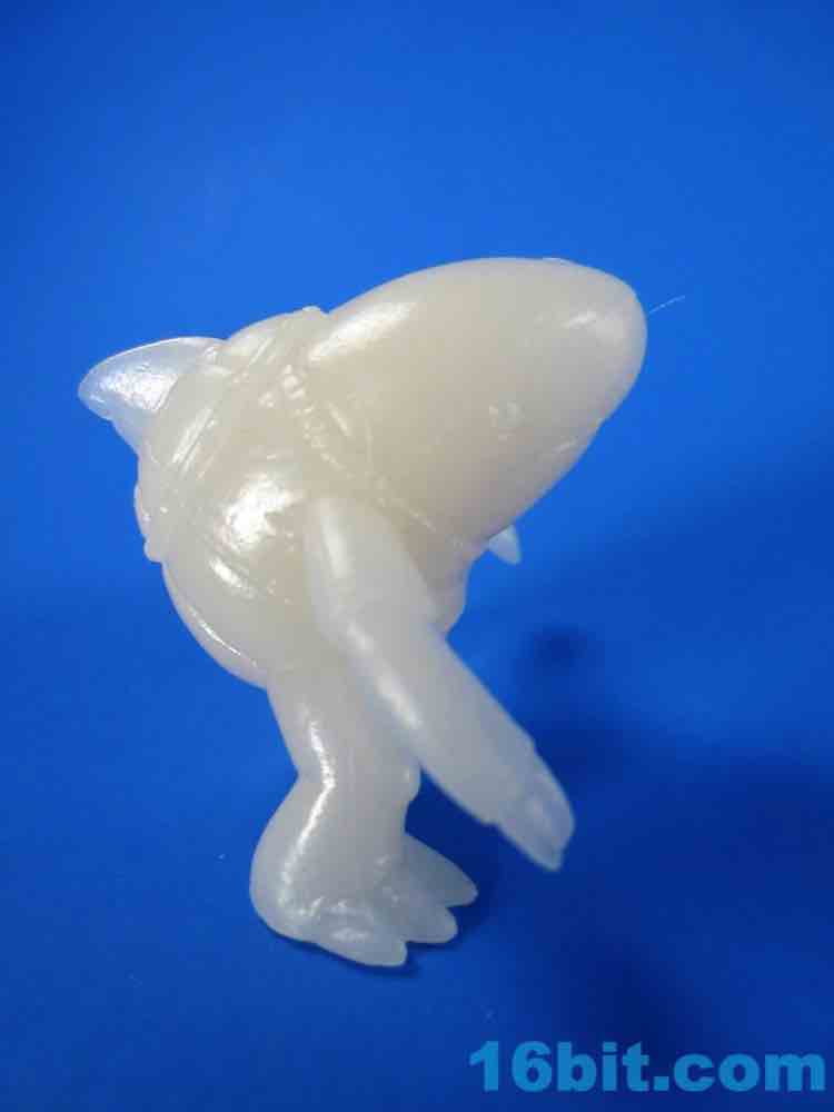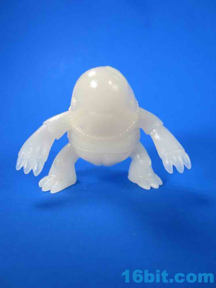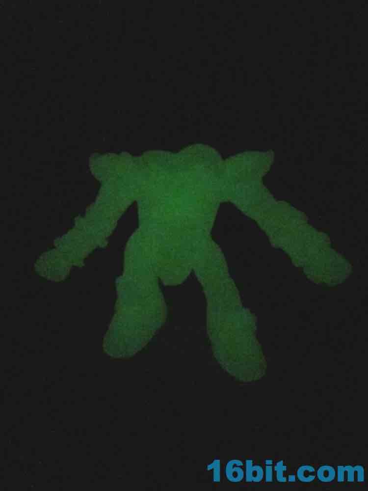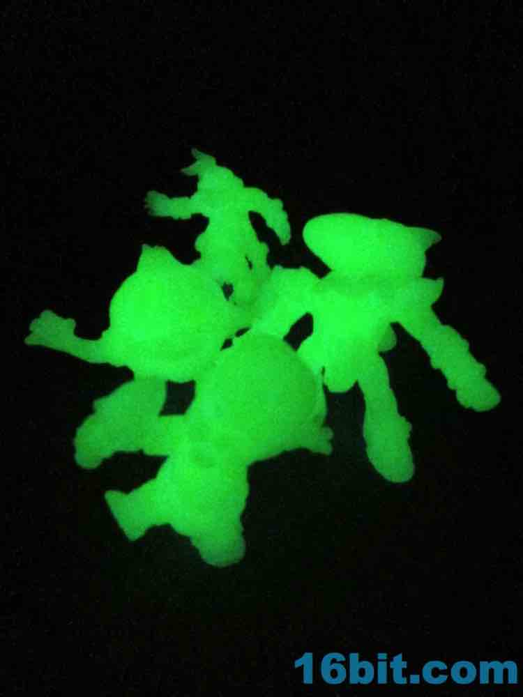 Rounding out the glow group is the robotic toddler Cry-Borg, which you may recall as the #1 vote-getter from round 2. The figure still balances just as well in glow, and the sculpt catches the light nicely. The open mouth, tiny eyes, giant head, and other bits and pieces really shine through the limitations of glowing plastic almost as well as the Grimm Gourd.