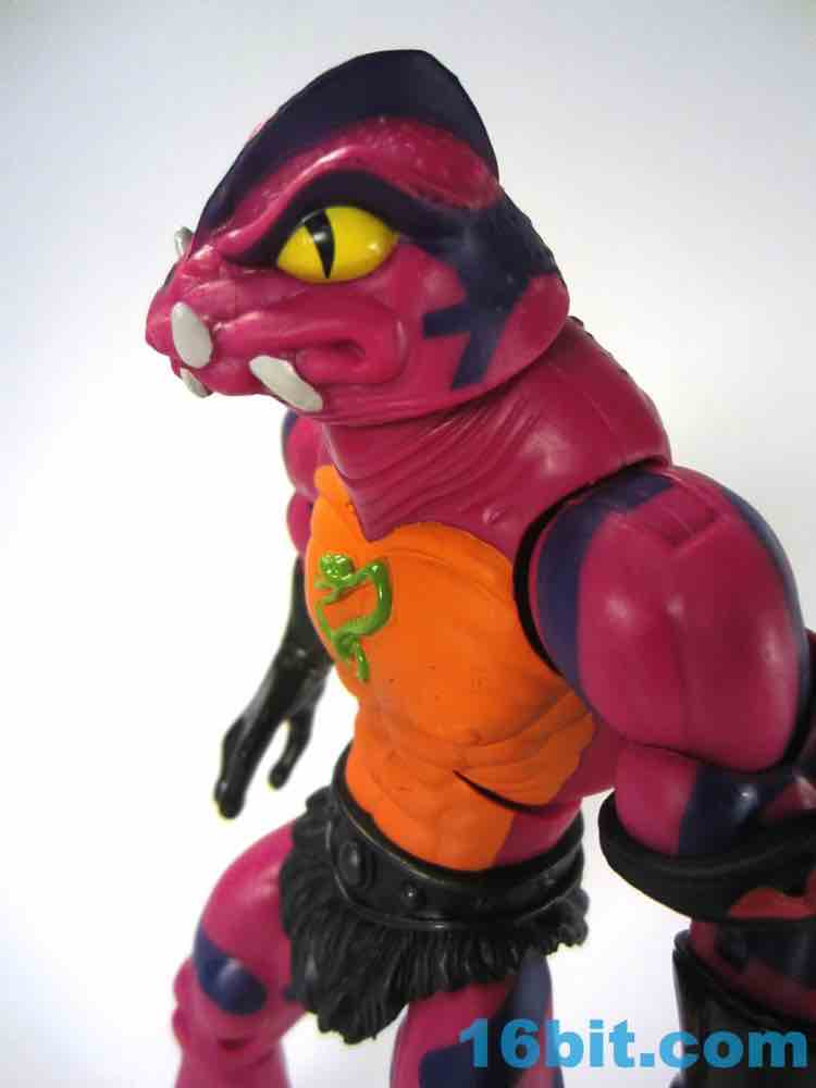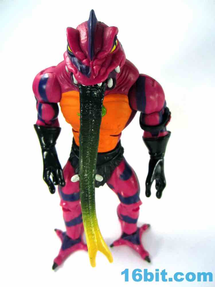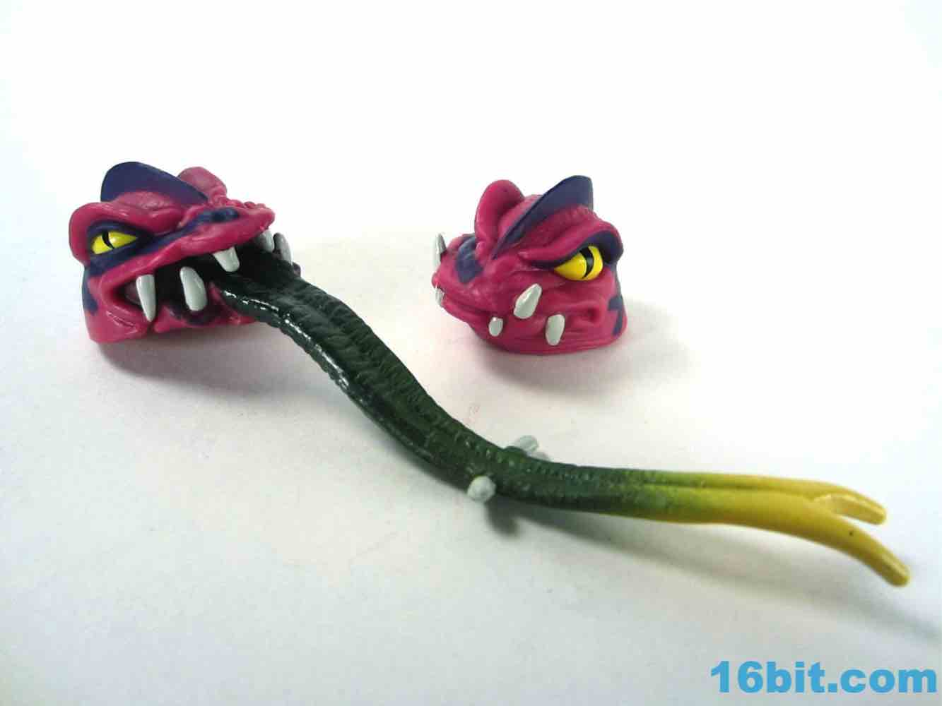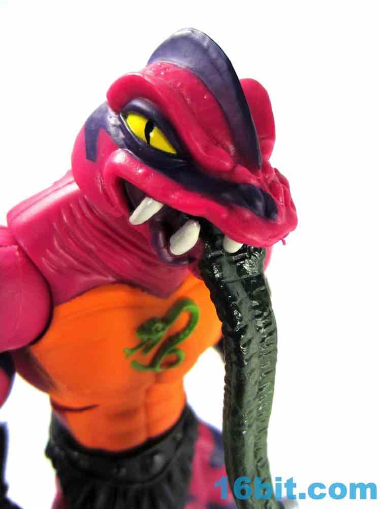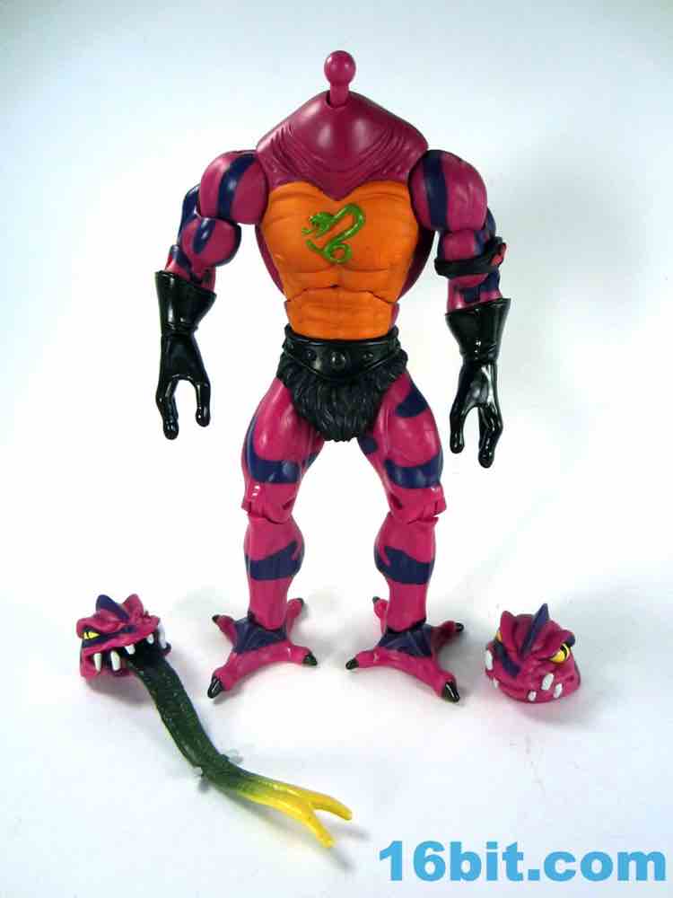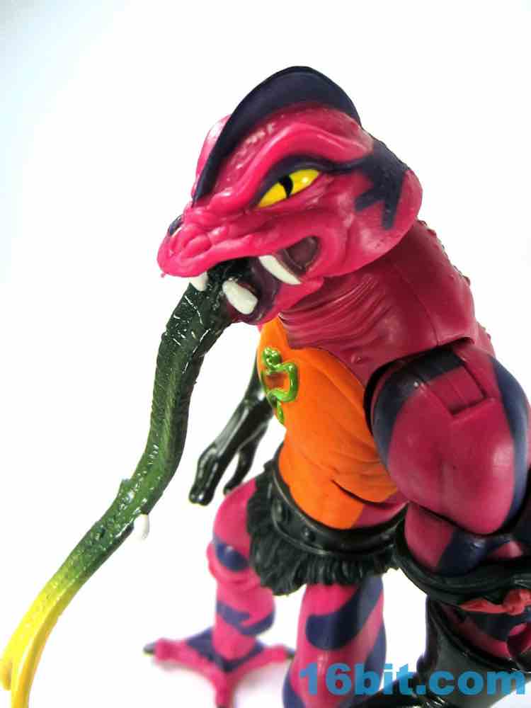 Each head sports a different expression and, of course, a different mouth. The wide-eyed, closed-mouth version looks a little cuter and cartoony while not really at all looking like the Filmation version. The magenta skin is covered in purple stripes with big white fangs and sizable yellow eyes that are quite similar to those of Lizard Man. Perhaps they're cousins. The open mouth version has a dark purple interior to his mouth, squinty eyes, and a long tongue with - you guessed it - more fangs. The dark green tongue fades to a yellow tip and is slathered in a lightly glossy paint. It looks pretty gnarly.