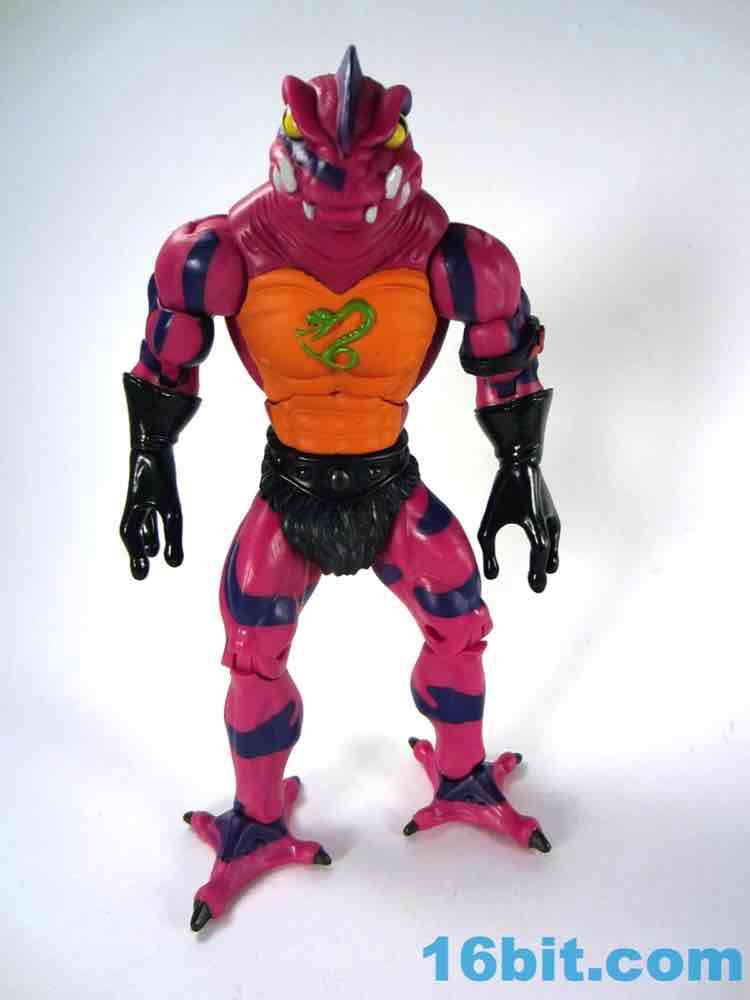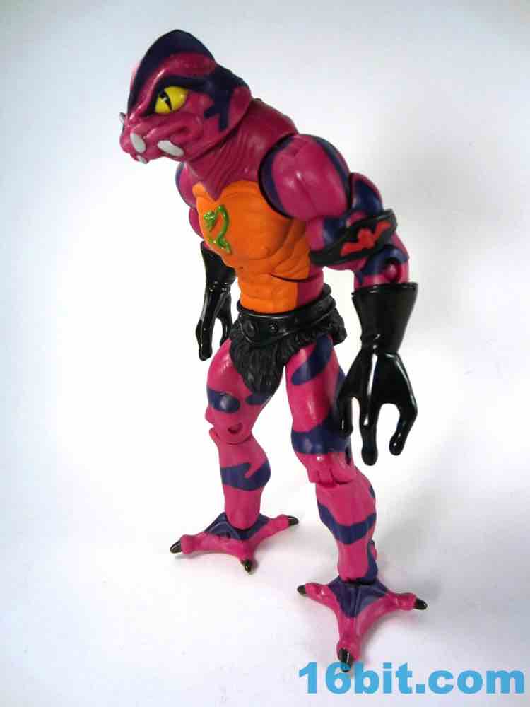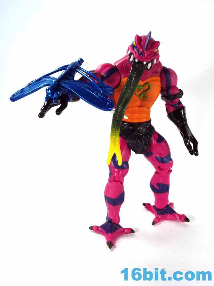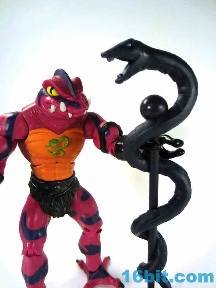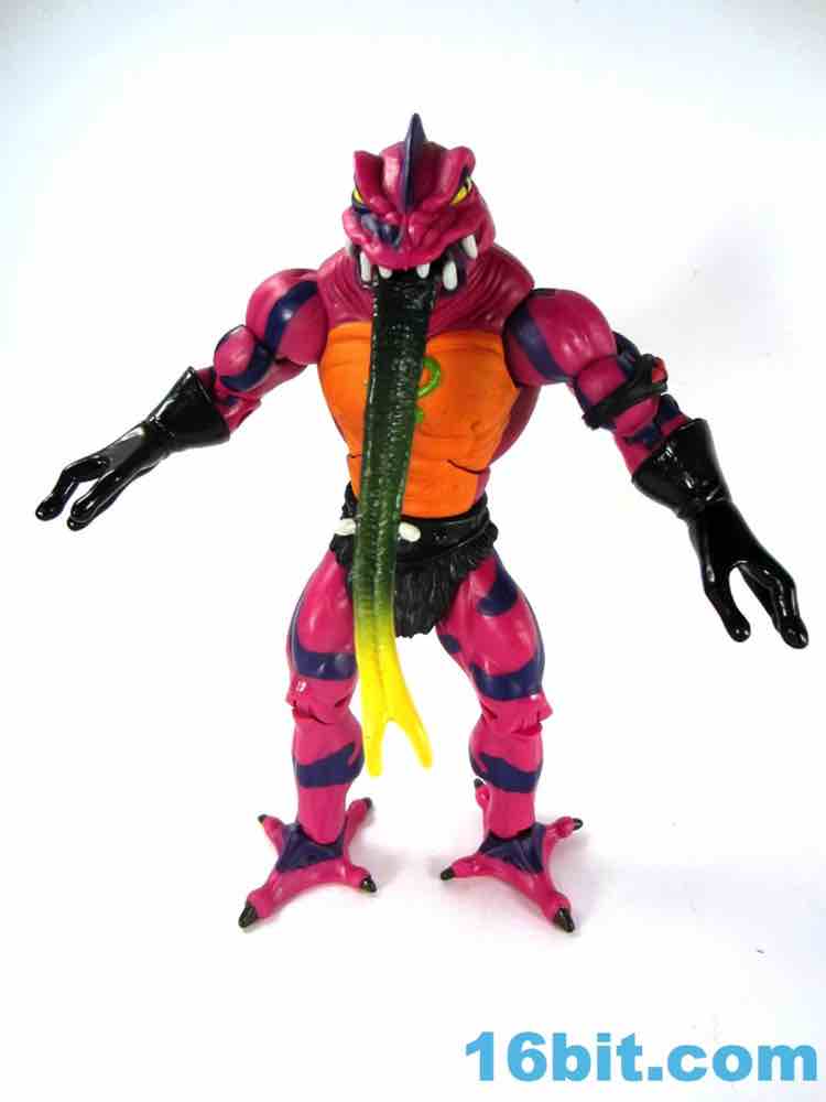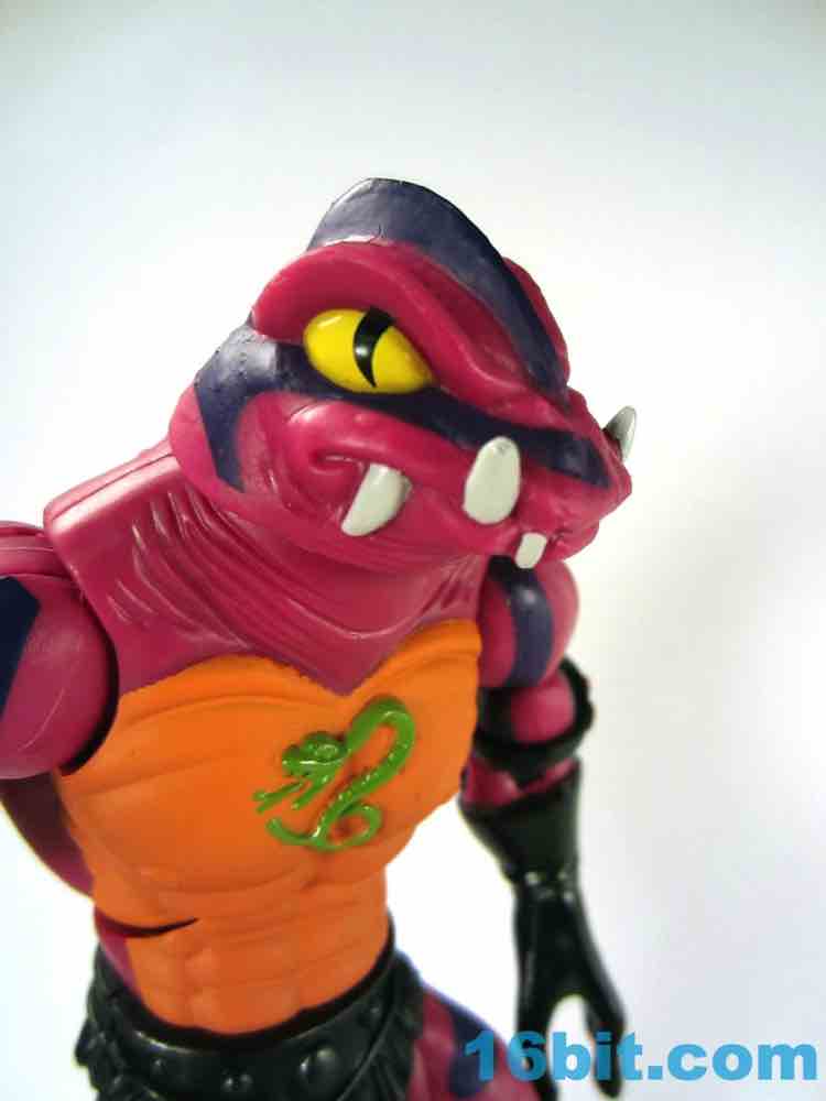 Each head sports a different expression and, of course, a different mouth. The wide-eyed, closed-mouth version looks a little cuter and cartoony while not really at all looking like the Filmation version. The magenta skin is covered in purple stripes with big white fangs and sizable yellow eyes that are quite similar to those of Lizard Man. Perhaps they're cousins. The open mouth version has a dark purple interior to his mouth, squinty eyes, and a long tongue with - you guessed it - more fangs. The dark green tongue fades to a yellow tip and is slathered in a lightly glossy paint. It looks pretty gnarly.