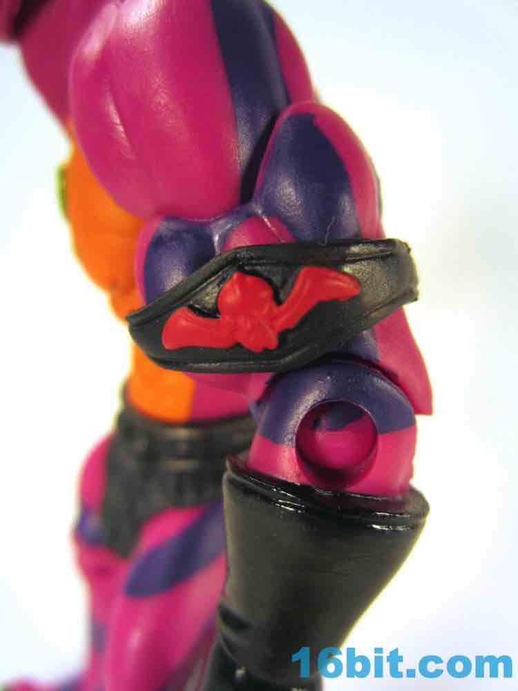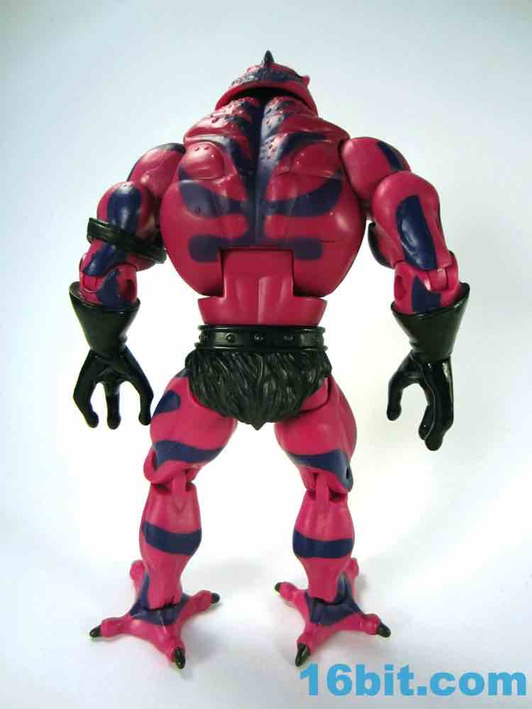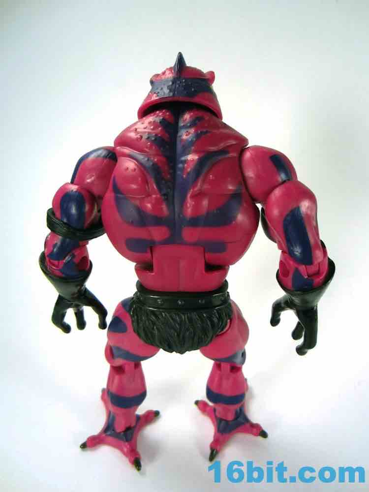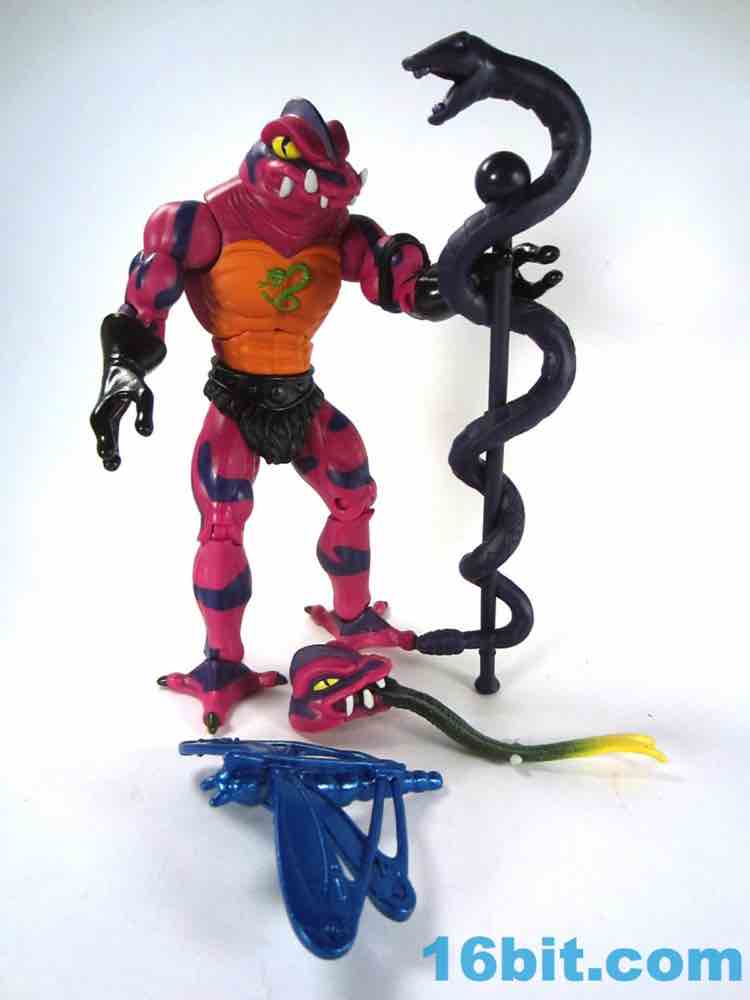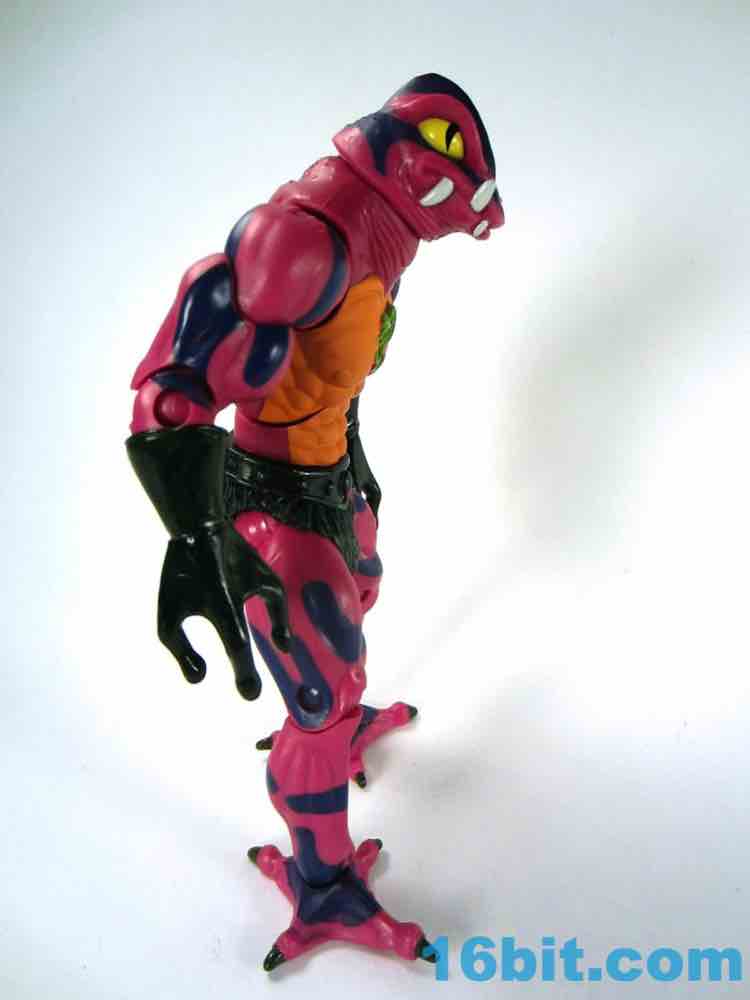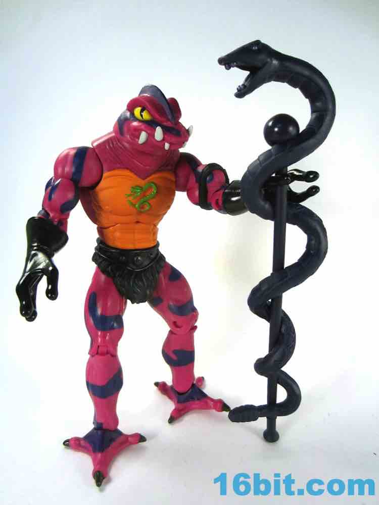 Each head sports a different expression and, of course, a different mouth. The wide-eyed, closed-mouth version looks a little cuter and cartoony while not really at all looking like the Filmation version. The magenta skin is covered in purple stripes with big white fangs and sizable yellow eyes that are quite similar to those of Lizard Man. Perhaps they're cousins. The open mouth version has a dark purple interior to his mouth, squinty eyes, and a long tongue with - you guessed it - more fangs. The dark green tongue fades to a yellow tip and is slathered in a lightly glossy paint. It looks pretty gnarly.