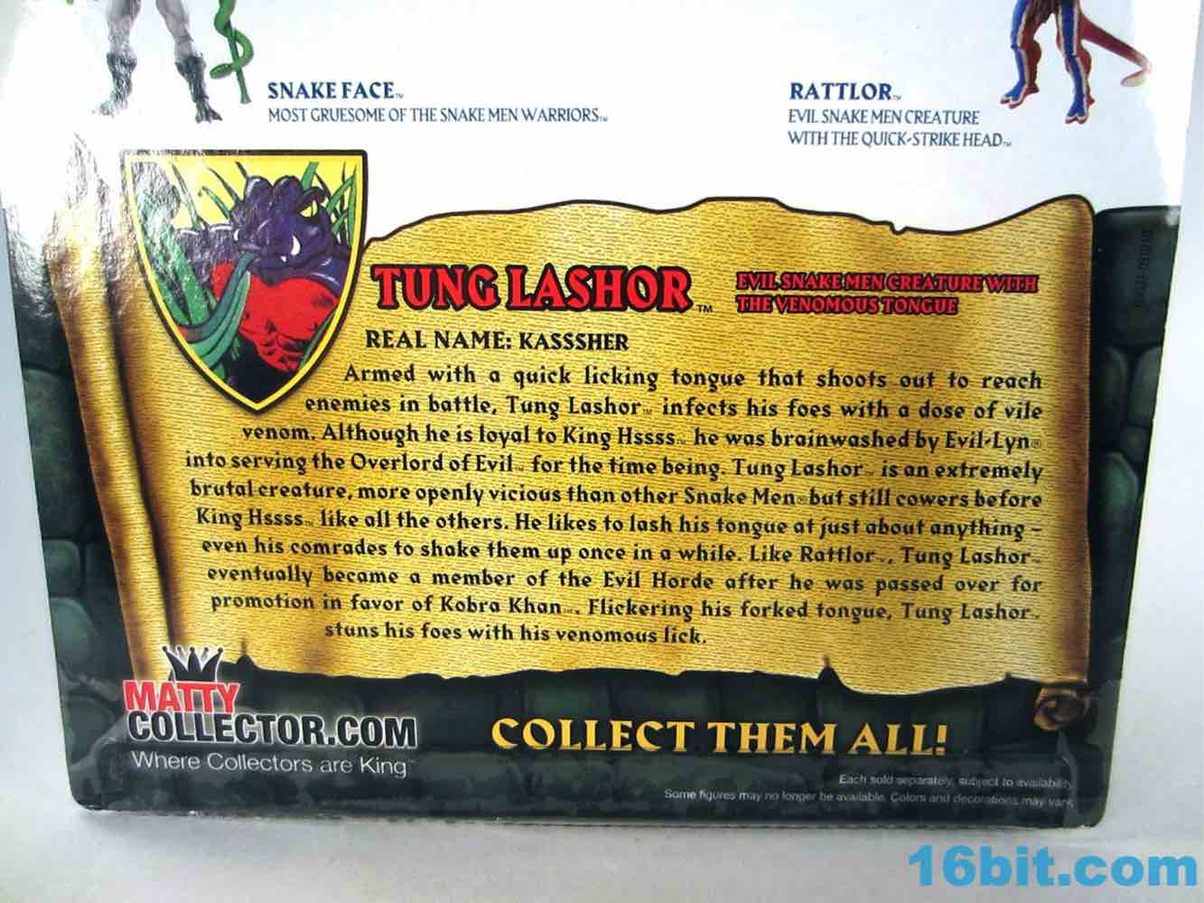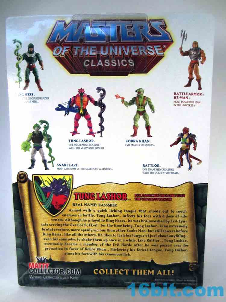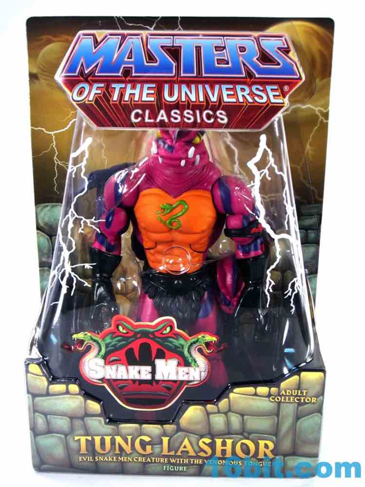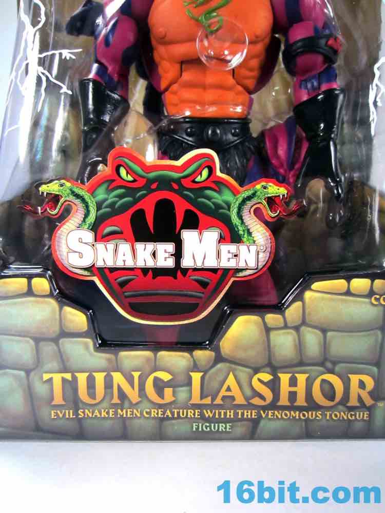 This figure draws heavily from the original toy's design, giving you the three-fingered, pink-sinned, mostly naked reptile being you've come to know and love. He's got big feet with four toes spread out strangely, and they're splayed up a bit when he comes fresh out of the box. Mattel's decision to use this design may open the door for another Tung Lashor down the road, as the cartoon version wore Horde armor and pants. The Horde armband reconciles this character's dual citizenship in the Horde and the Snake Men to some extent, but it does leave the door open for more figures using existing parts were the new regime at Mattel so inclined. I don't know if there will be interest in a couple of years, but maybe!