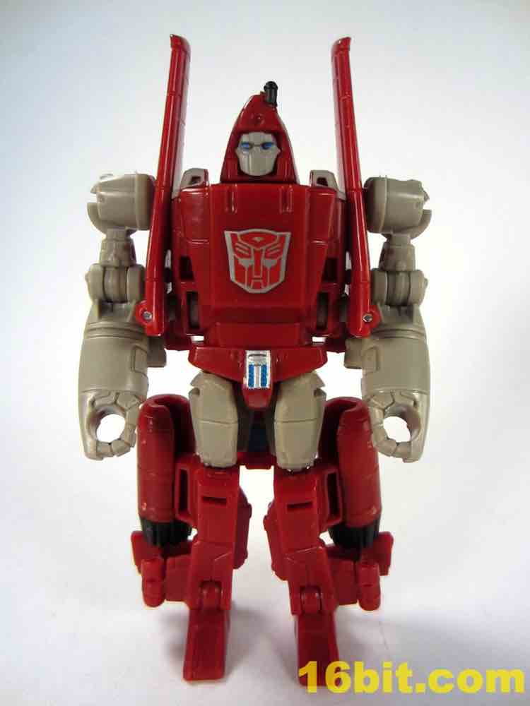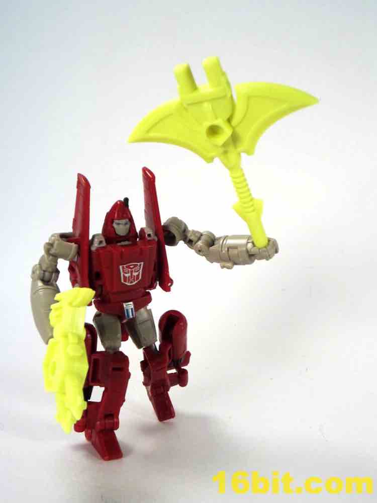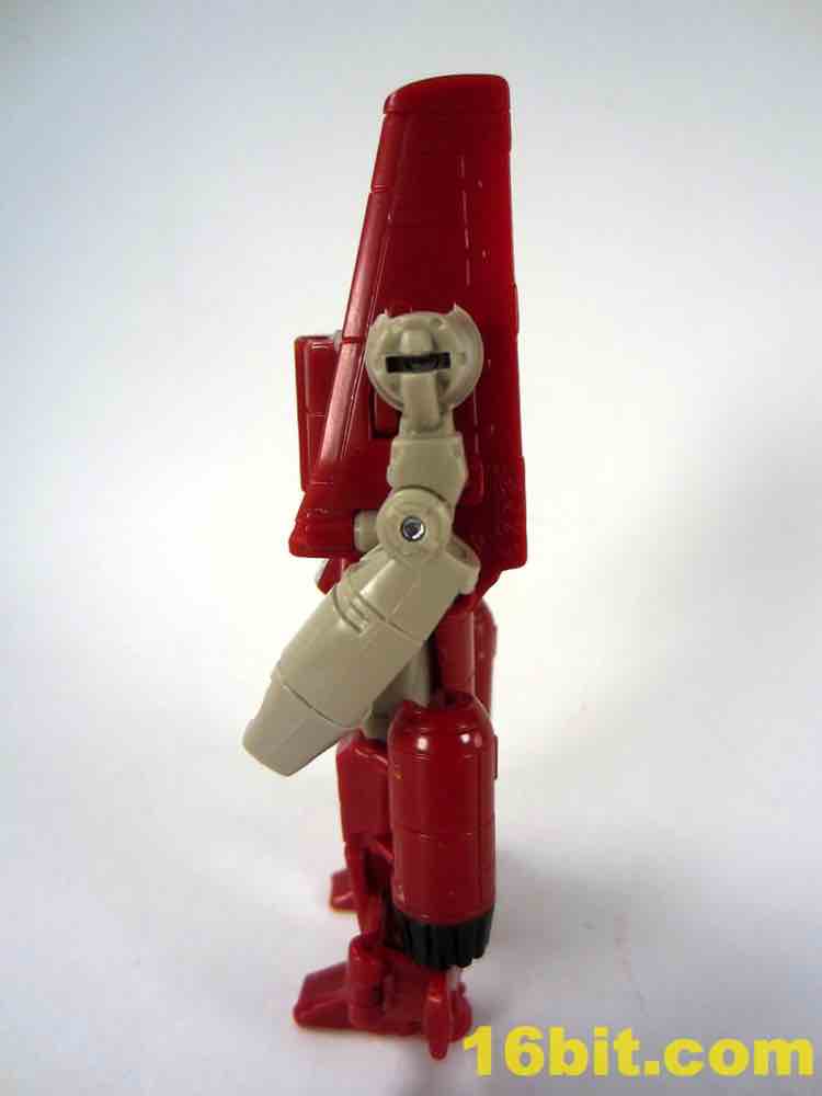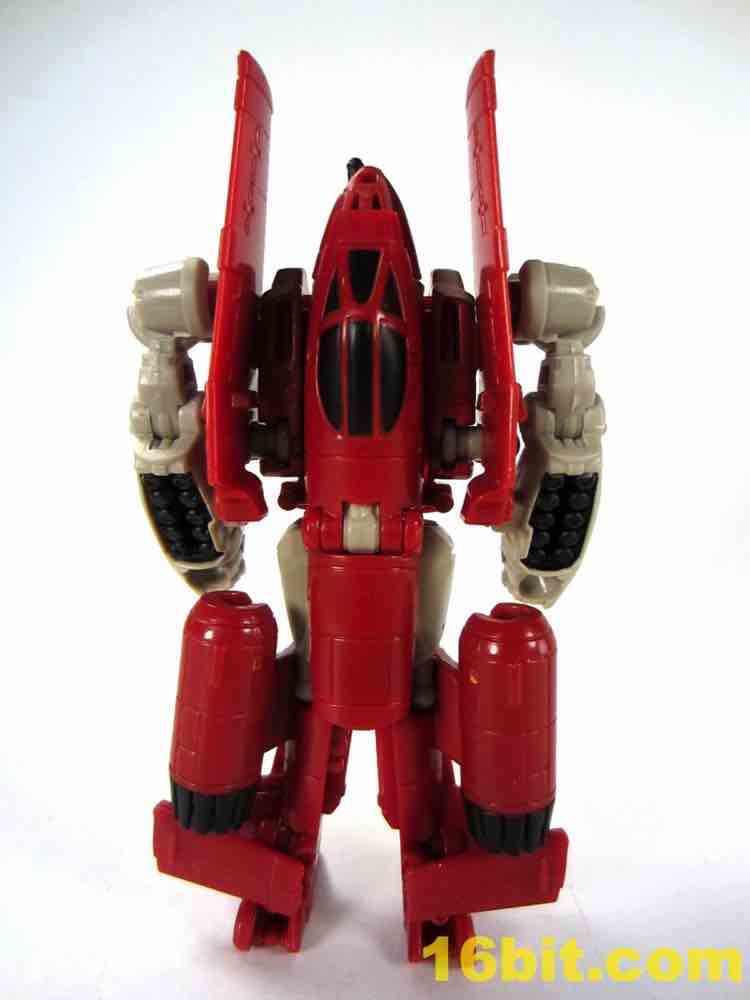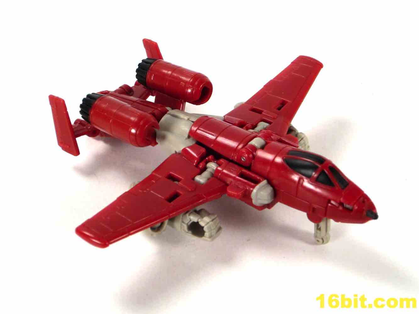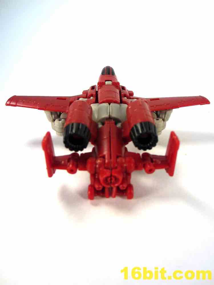 Transformation is a little tricky, thanks to lining up the tabs and slots on the wings. Also, the legs don't peg together especially well on my sample, so this figure tends to look best and be most stable in robot mode. The plane has retractable landing gear and little else in the way of moving parts, but what's superbly clever is the landing gear looks good and doubles as the grip of the gun mode. I would like to shake the hand of the designer that came up with this one, because it's just peachy. Getting all the panels to line up and tab into position is surprisingly tricky, especially when compared to other recent toys in this scale. The slightly softer plastic doesn't seem to be helping too much either, but you get an adequate plain that's a little on the plain side. Reprolabels will probably add some wing decals later.