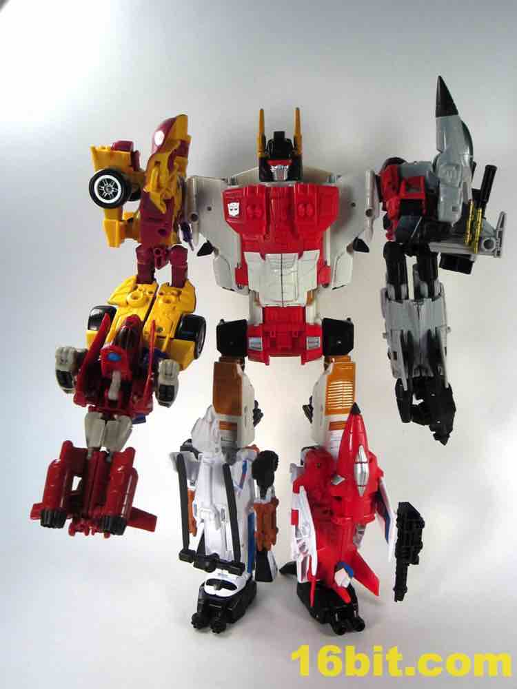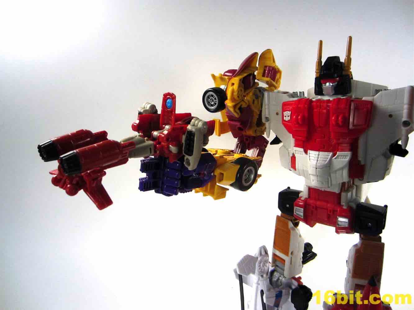 The gun is something of a delightful mess. It's a gun, sort of, with lots of parts and pieces. It looks like a dismembered plane put together Ikea-style with no instructions. It's acceptable, sure, but if they left this mode out you'd never miss it. It's like Bombshell's weapon mode - it's there, sort of, but it's more of a curiosity than anything practical. I wouldn't recommend the gun mode as a necessary part of a complete Superion, but Powerglide still has a fun robot figure to keep in your toy stash.