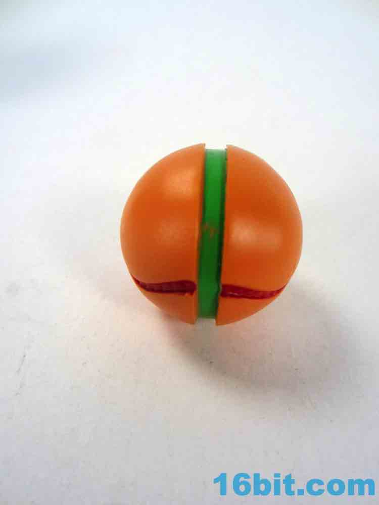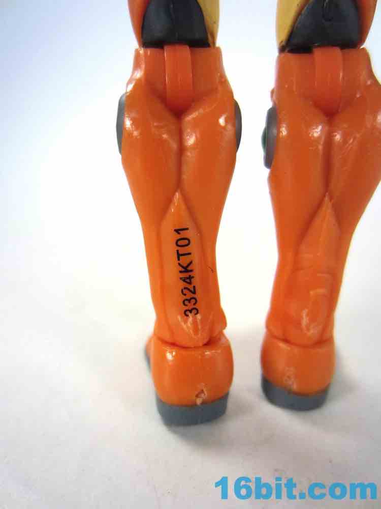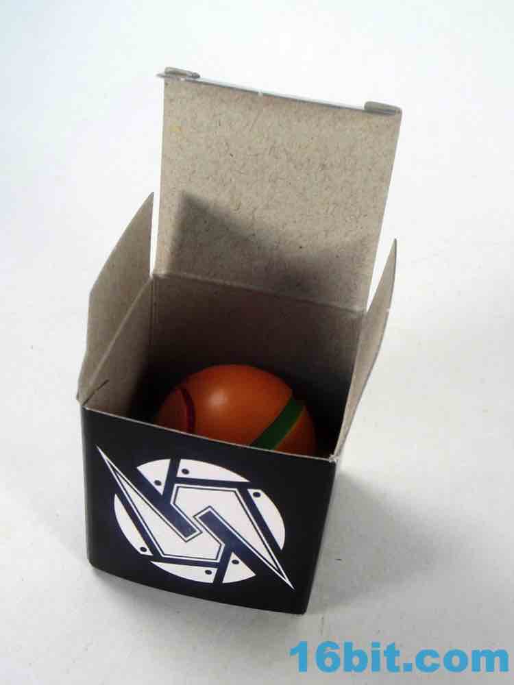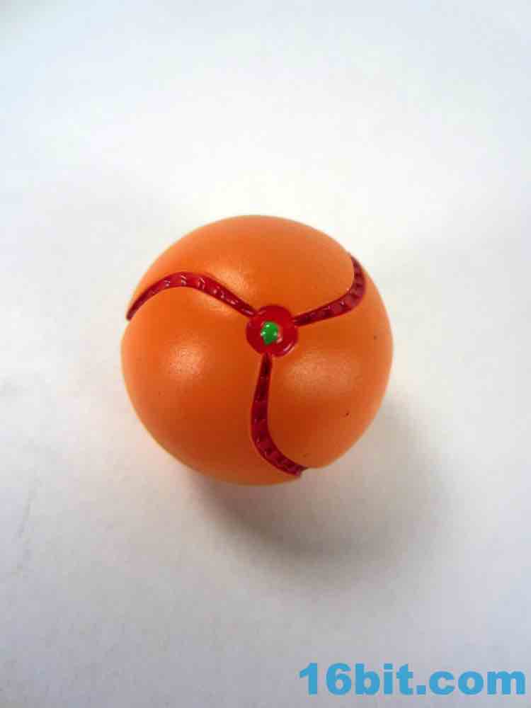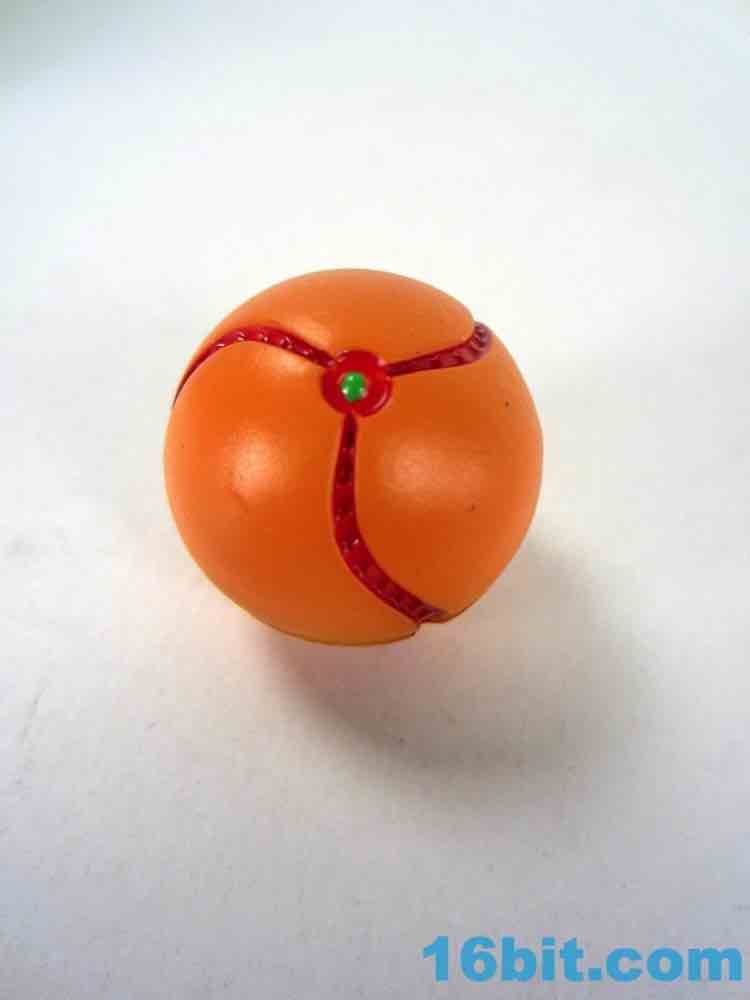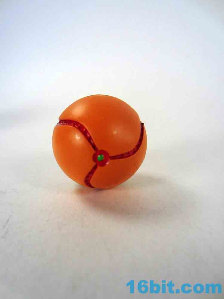Her lone accessory is the morph ball, a.k.a. Maru Mari, a.k.a. the first thing you find in the game. It's hollow and I think molded in yellow plastic with orange paint - so it looks pretty good for being a hollow, hard plastic not-quite-a-ping-pong-ball. There's a green stripe down the equator with some red and green markings. It fits nicely with the look and feel of Samus, and seems a bit small, but I find myself wishing it was a harder, rubbery material like the super mushroom from Mario. (Or, you know, an enemy.) It's nicely designed and pretty simple, bringing a decent but not great figure to what can loosely be called complete.