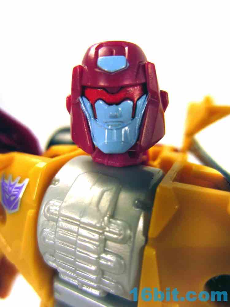 Also worth nitpicking, the robot head. It looks similar to the original one, but with enough changes where it's almost jarring. The blocky original noggin has been replaced by a rounder face with a blue forehead crest and what could best be deemed evil clown red eye makeup. It doesn't look like any existing Dragstrip and it helps the figure stand out from the parade of similar face types we've had over the years. The red "sunglasses" look from the original cartoon is also kept, rather than the unpainted eyes or the blue eyes often seen in art and the comics. It's worth bringing up that Hasbro dropped the light-up eye port, and for this I am grateful.