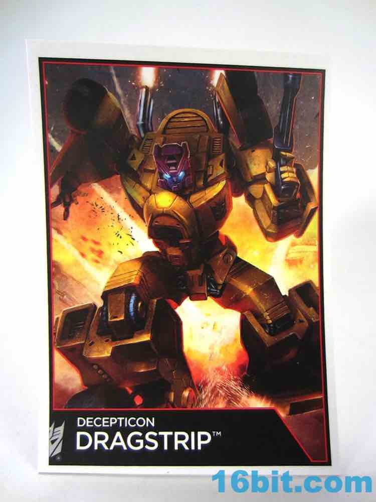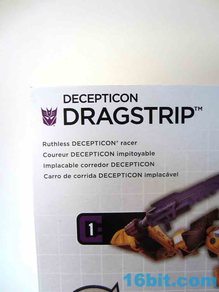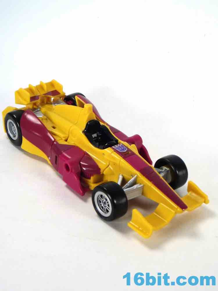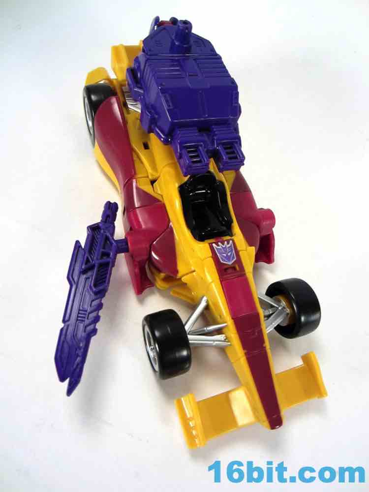Parsed as Drag Strip in the olden days, I wish I could have been a fly on the wall in the development meetings for Decepticon Dragstrip I'd like to imagine it going something like this. "Hey, the original toy has a pinhead that's too square. What can we do to mix things up a bit?" "Let's give him eyes with markings circa 'Good To See You Again, Alice Cooper.'" "Perfect!" Other than that, it looks like a modified take on the old Marvel and Sunbow model for the head but rounder.