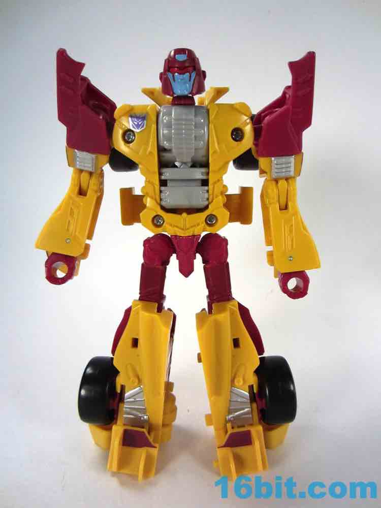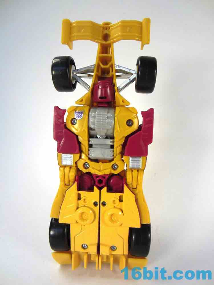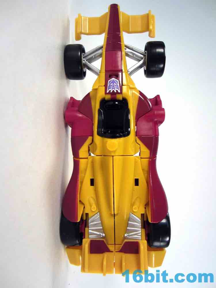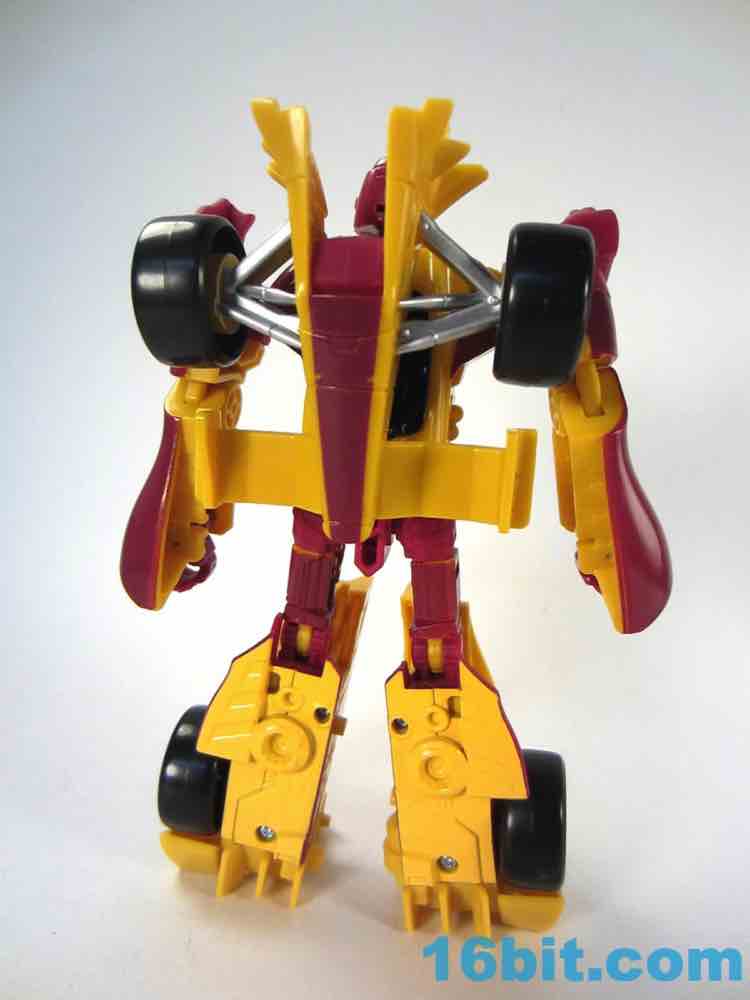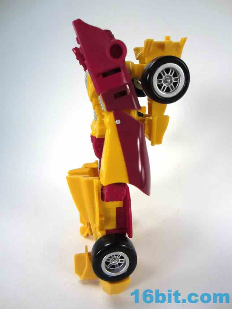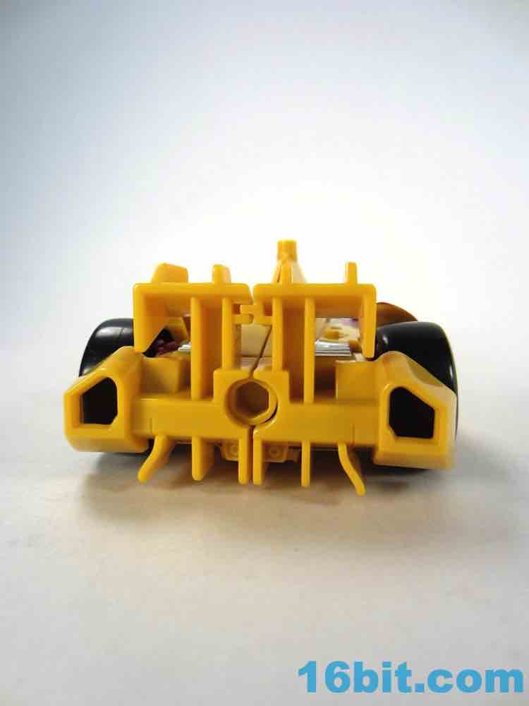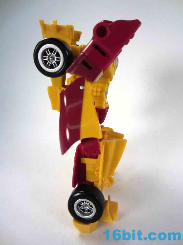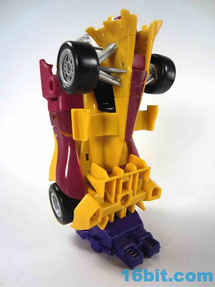 It's a car! Transformation to racer mode is simpler than the jets, as you don't have to split his legs up this time. Just slide them up after folding in the hands and folding down the arms. Twist the head around, fold up the car's nose, and you're pretty much finished here.