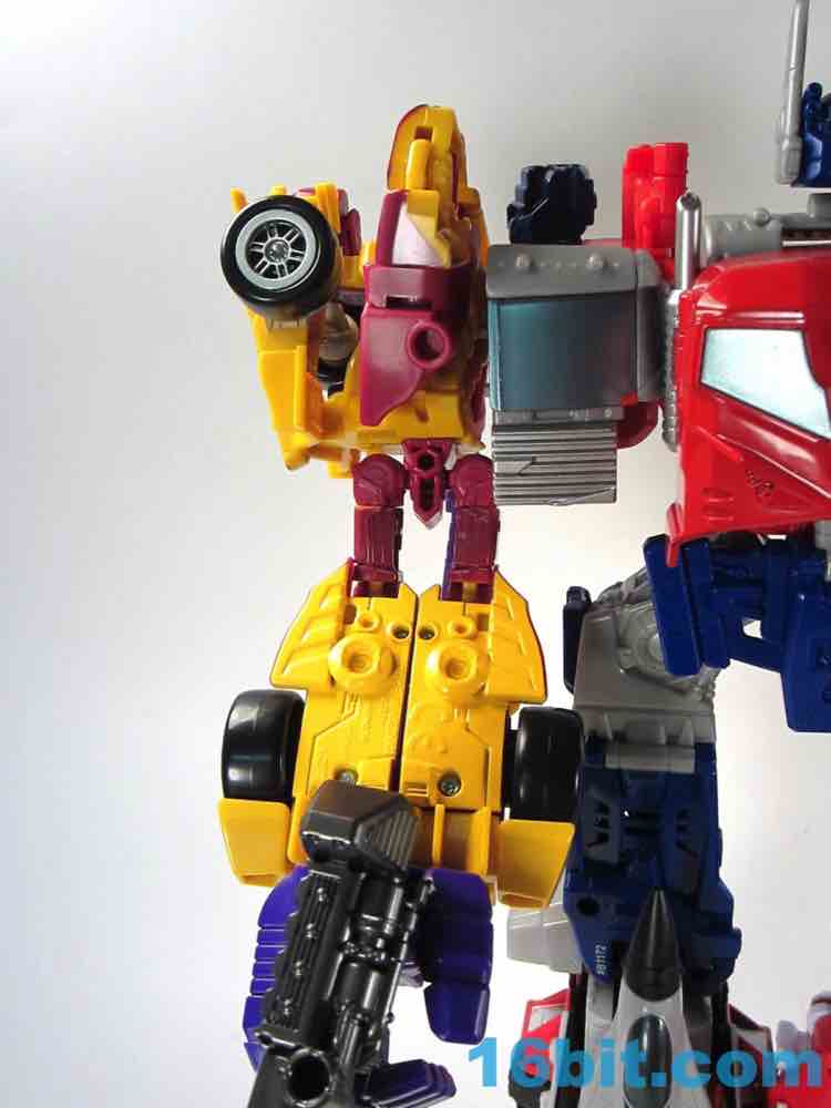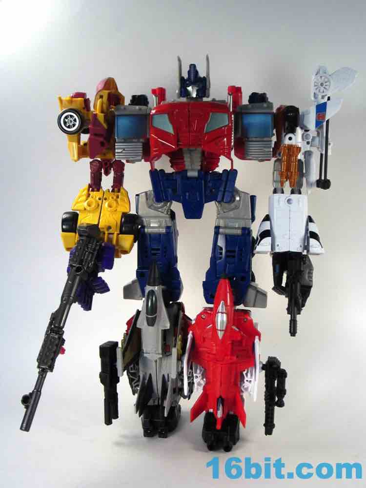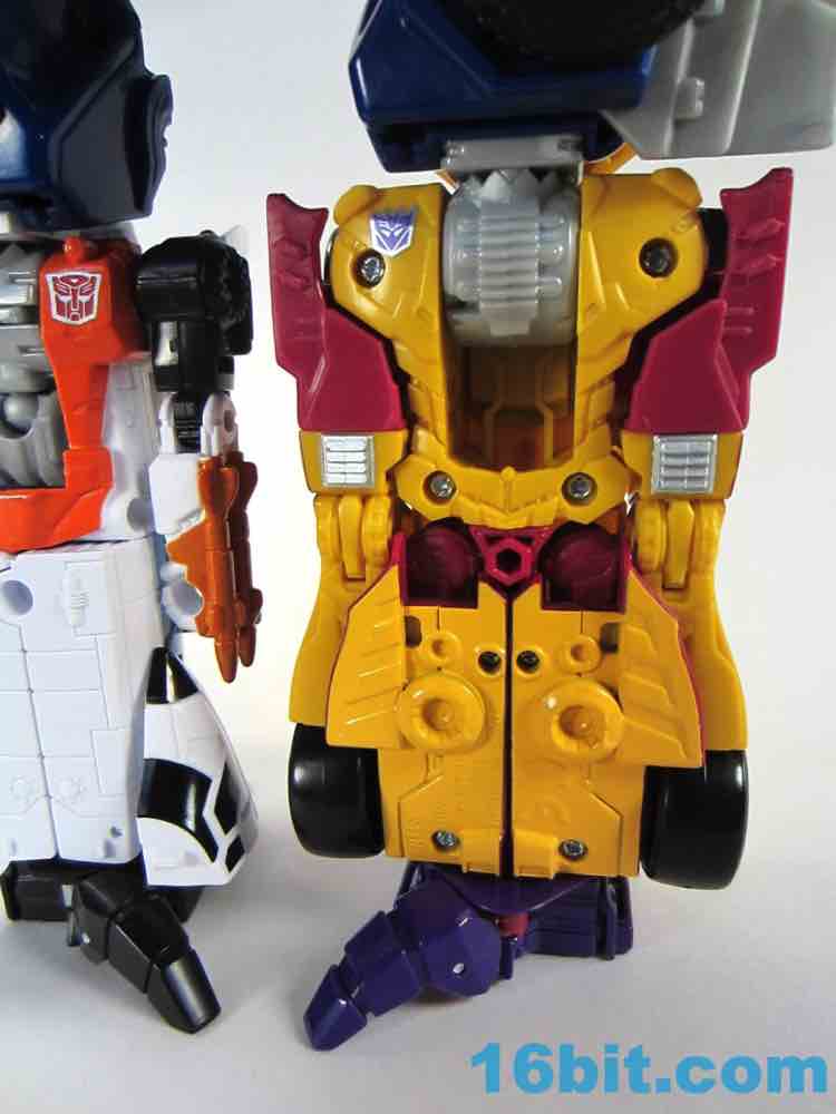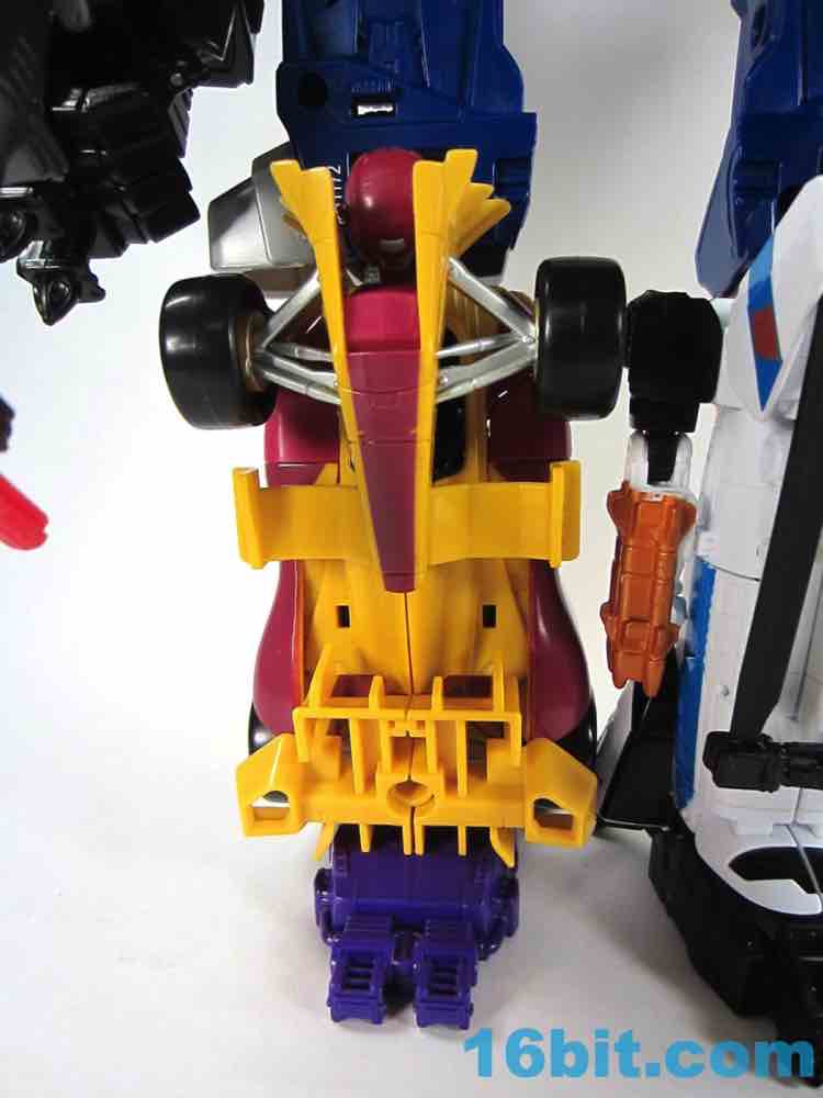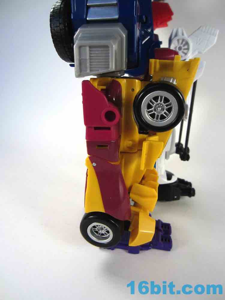 His robot mode is pretty fantastic but as you go through these, you'll notice a number of patterns. Articulation is basically the same on all of them, in basically the same locations. 16 joints including a waist (which is basically required to make the combination gimmick work) are present as are fists that can move laterally for the purposes of transformation. The sculpt is pretty good and reminds me a lot of the original toys, in that the legs are giant chunks of car without fold-out feet or any indication that they're trying to conceal what this toy is. Since it's a robot made out of car bits, I really do like seeing bits that are obviously a car so seeing tires and a spoiler on the feet add charm to this one. The arms are a little bland compared to the other dudes, but you can't win them all - it's still a nifty looking robot that isn't slavish to his progenitor.