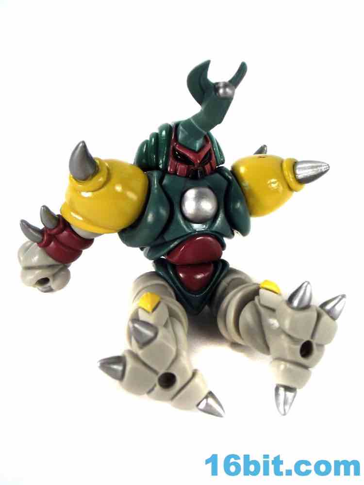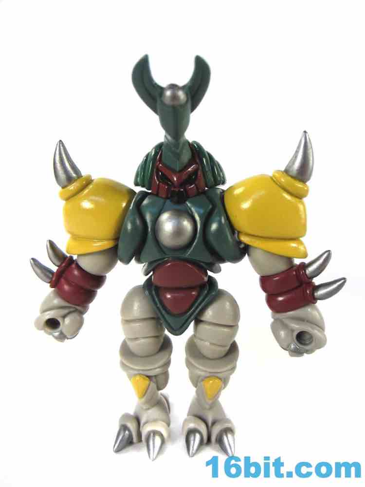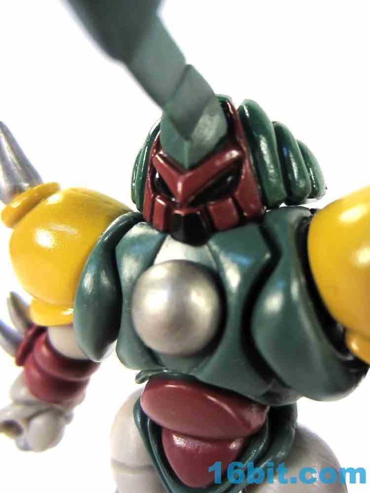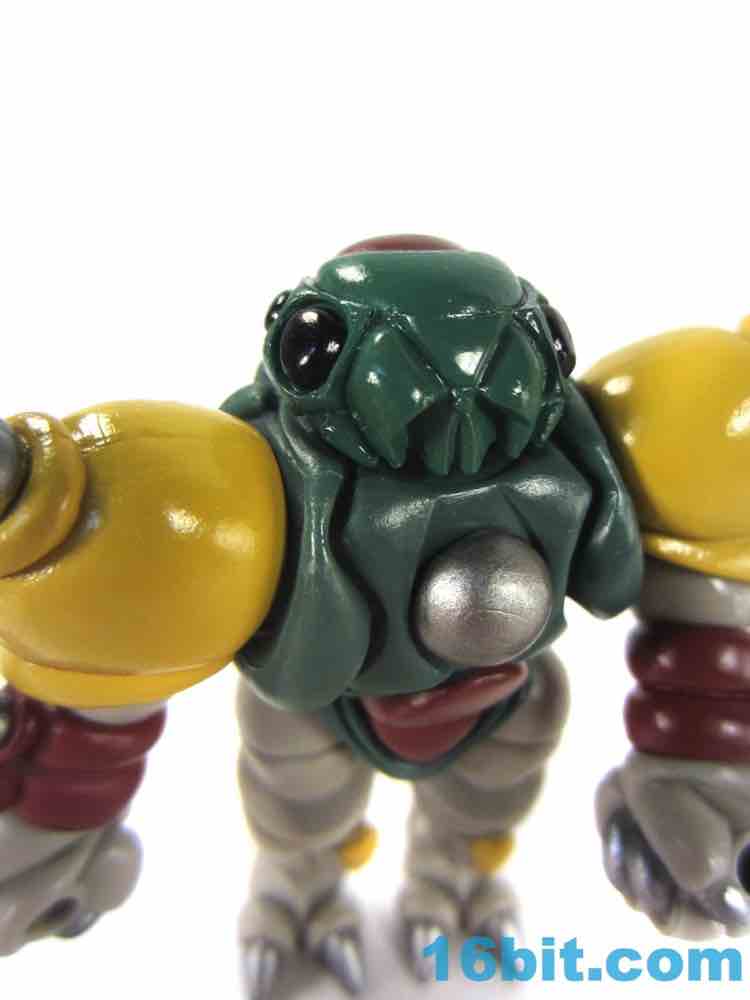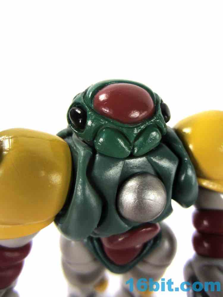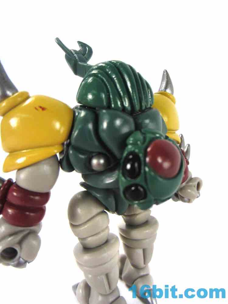 26 total pats come together to form a 3-inch tall action figure - taller if you count the horn in his forehead. Each piece is a fully articulated Glyos joint, so you can swap parts with other Kabutos or reconfigure this one into some gruesome beast of your own design. To that end an alternate head is included as a backpack, so you can switch to that noggin if you prefer. You've got options, but sadly you don't got weapons. You'll need to steal some from the Glyos-compatible Weaponeers of Monkaa or another line. He has no problems standing or sitting, with completely sturdy joints and a build that could probably take a severe beating were your kid to ever play with it. Since it sold out already, this is unlikely.