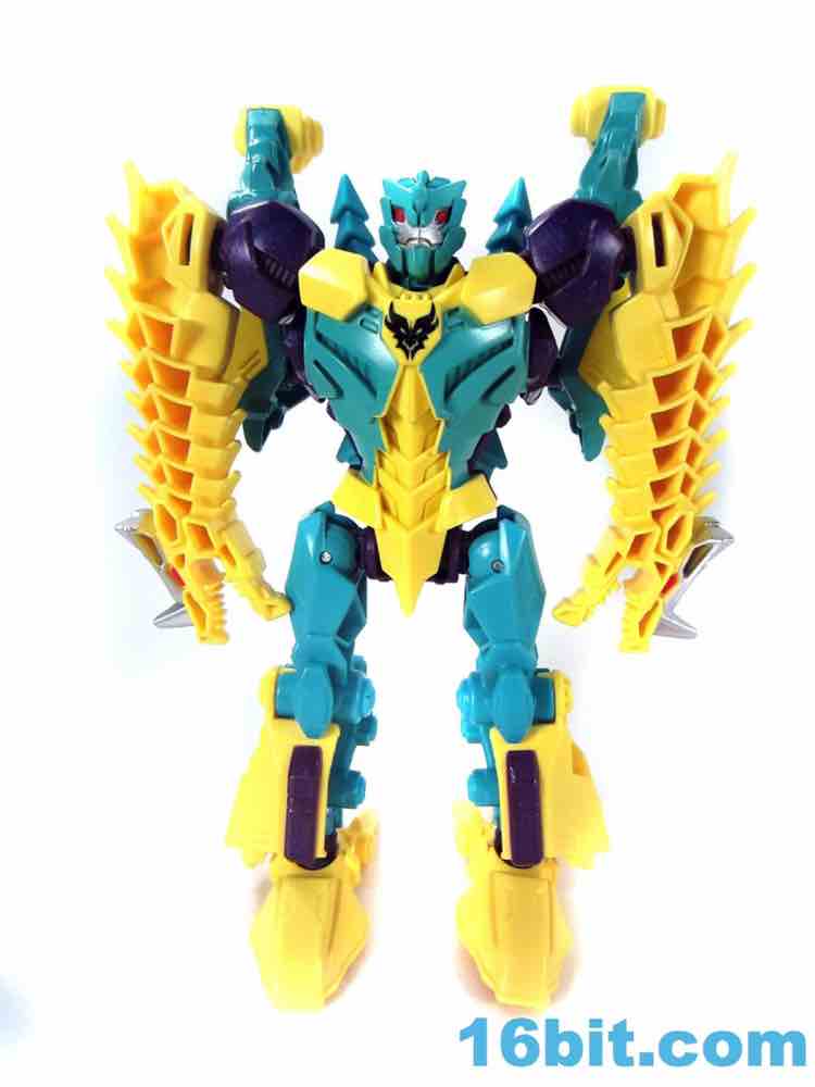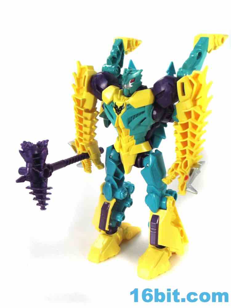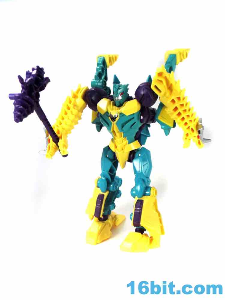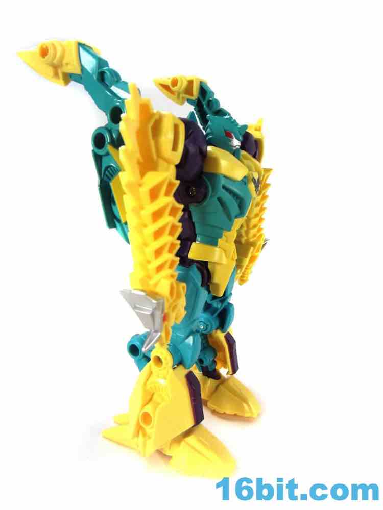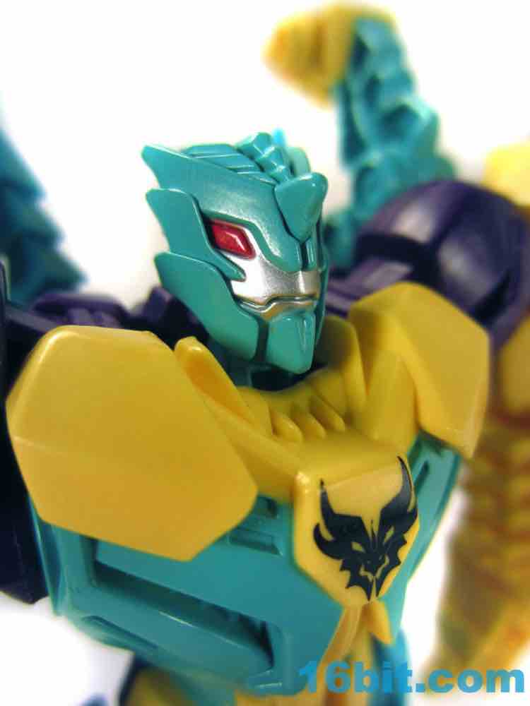 The robot mode looks just like the Legion toy, with a few minor tweaks. I'm really impressed by how nice the colors all match and that the paint is really clean and even. Our Predacon pal has only 8 meaningful points of articulation, but with no knees and no elbows you might be shrieking "no sale." However, I'm old and played with the original toys as a kid and those generally had moving arms and not much else. This is an improvement. The hips, shoulders, and ankles give you about all the articulation that you're going to get and odds are you are going to feel robbed if you overpay for this figure. On the other hand, it's a distinctive design in nifty colors that pop nicely on the shelf. He has no problems holding his weapon in either hand, plus there are at least 11 places to plug in his weapon, Mini-Cons, Energon weapons, BMOG bits, or whatever other 5mm accessories you may have.