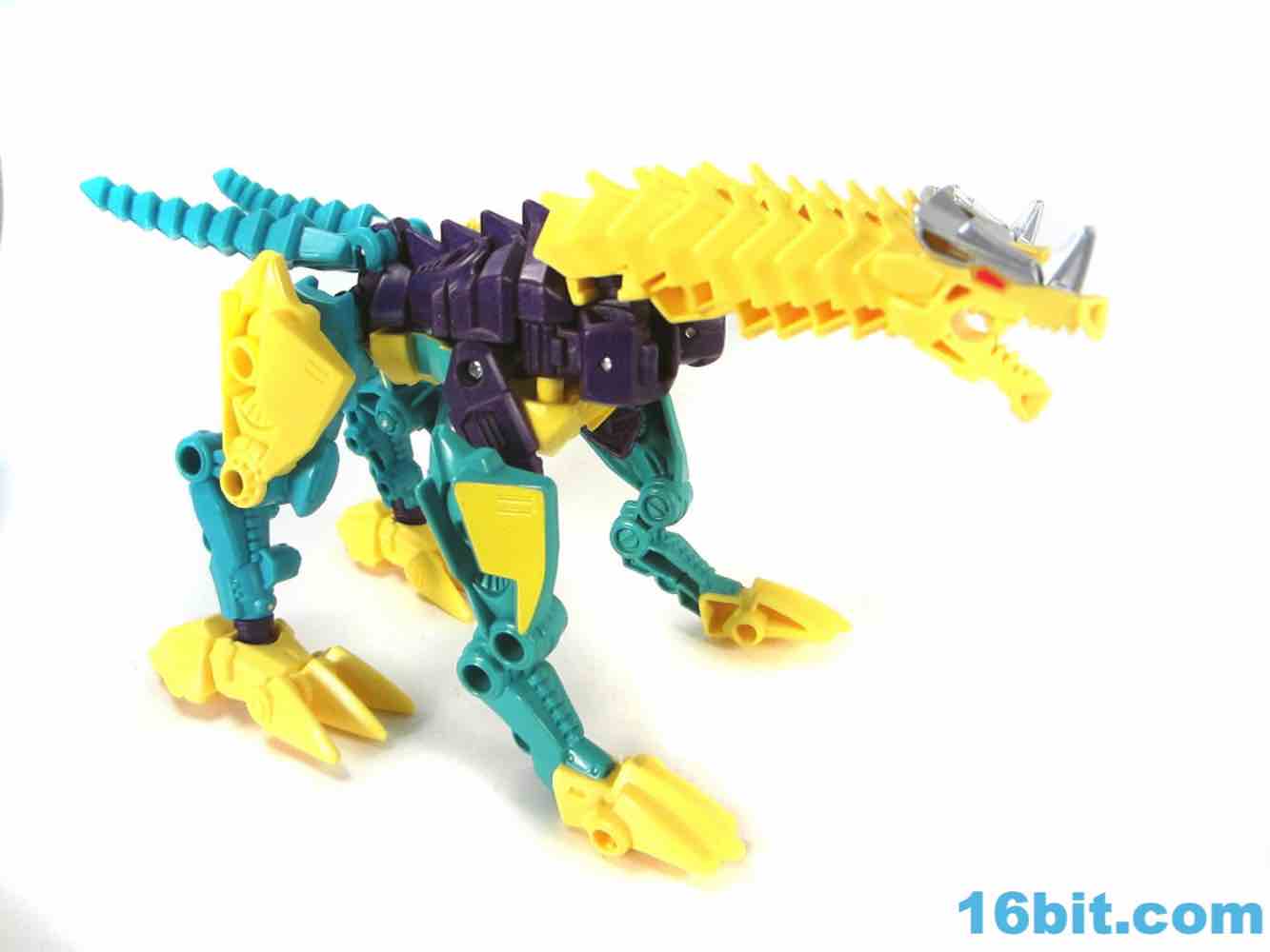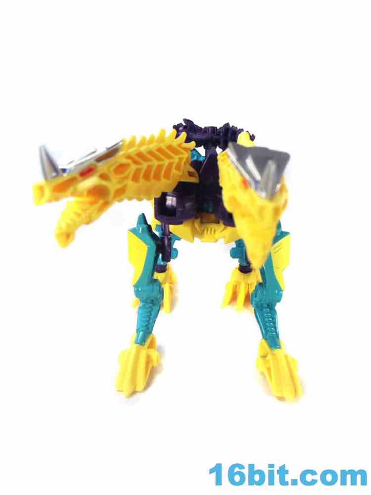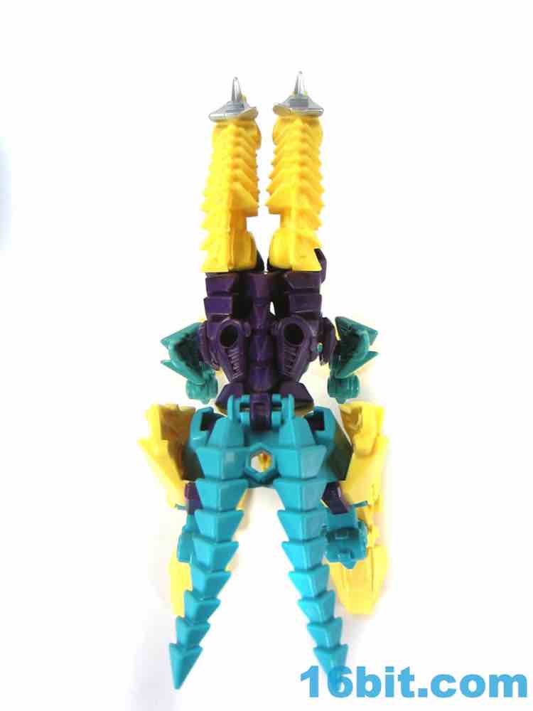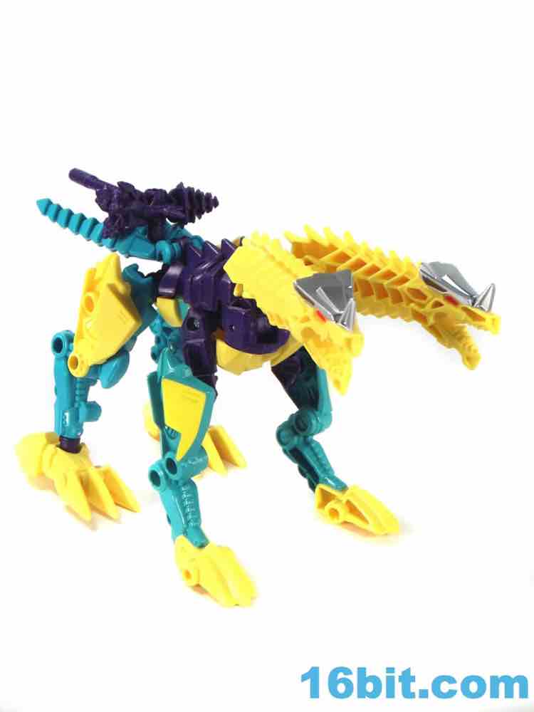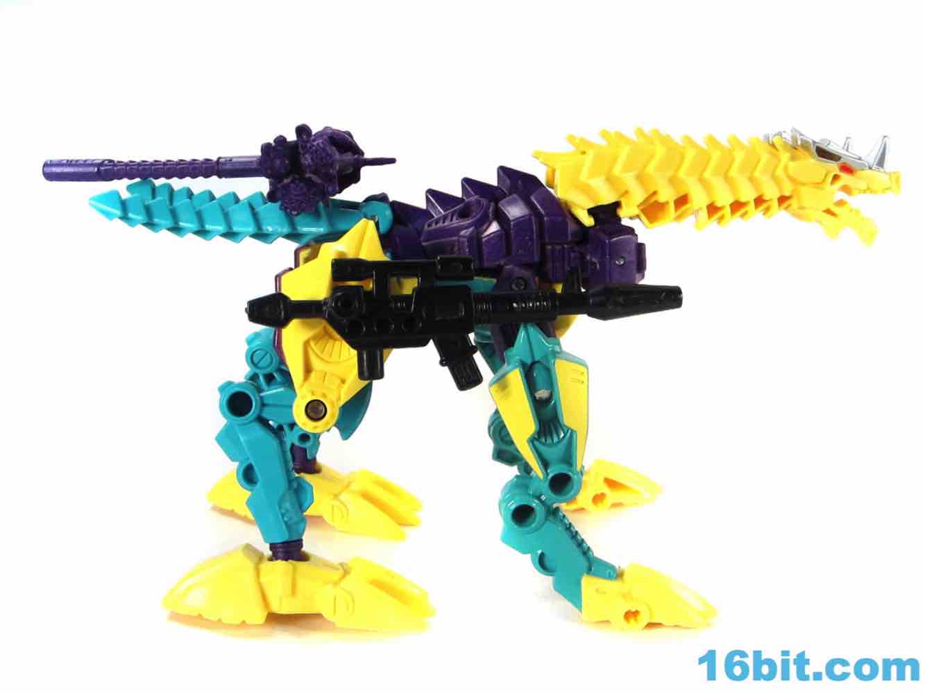 The robot mode looks just like the Legion toy, with a few minor tweaks. I'm really impressed by how nice the colors all match and that the paint is really clean and even. Our Predacon pal has only 8 meaningful points of articulation, but with no knees and no elbows you might be shrieking "no sale." However, I'm old and played with the original toys as a kid and those generally had moving arms and not much else. This is an improvement. The hips, shoulders, and ankles give you about all the articulation that you're going to get and odds are you are going to feel robbed if you overpay for this figure. On the other hand, it's a distinctive design in nifty colors that pop nicely on the shelf. He has no problems holding his weapon in either hand, plus there are at least 11 places to plug in his weapon, Mini-Cons, Energon weapons, BMOG bits, or whatever other 5mm accessories you may have.