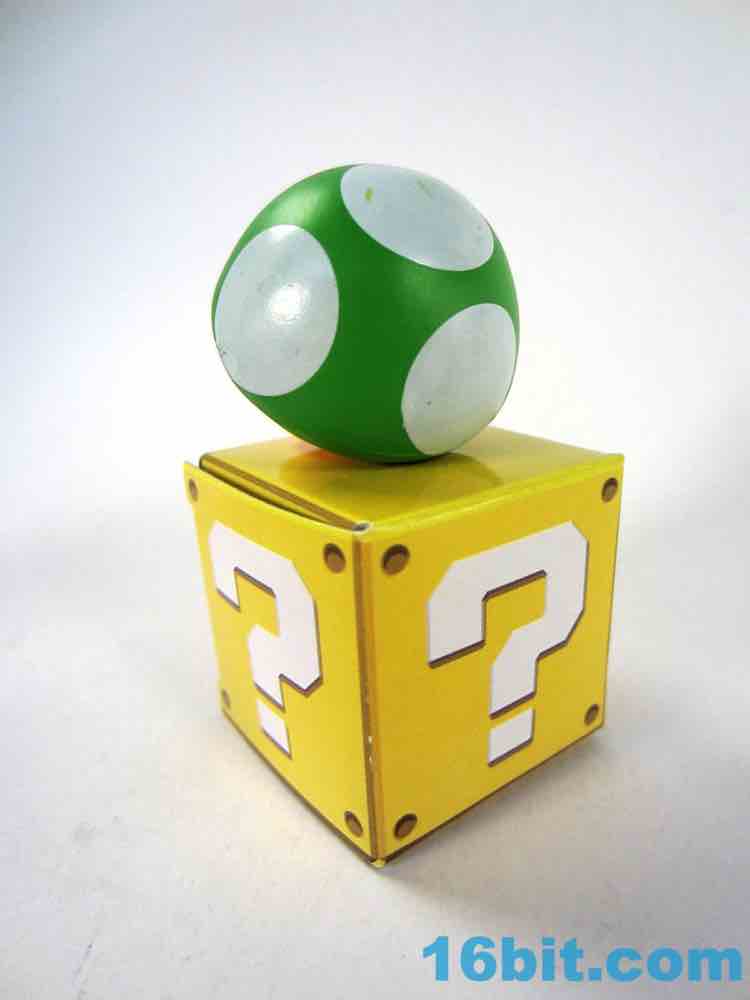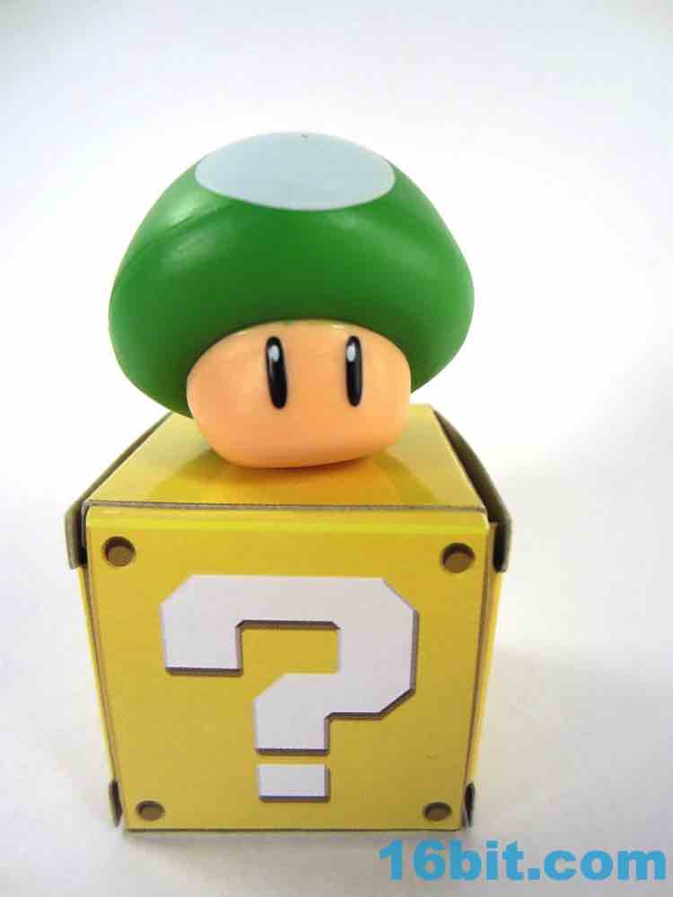 To no great surprise, the figure comes with a 1-Up mushroom using the same mold as Mario's Super Mushroom. The plastic color matches Luigi's hat quite closely, and is a thick, solid, rubbery plastic material rather than hollow like the "Morph Ball" Samus accessory. The stem is a little more on the pink side, while the white dots are pretty much the same. He can't hold it or carry it or anything, but it's cool and I'd probably have paid five bucks for one were it a Japanese capsule toy. As such, getting it for $10 (or $8 as luck worked out) with a Luigi figure worked out nicely for me.