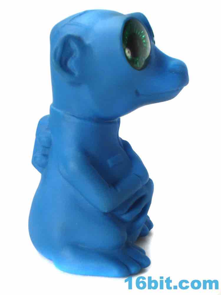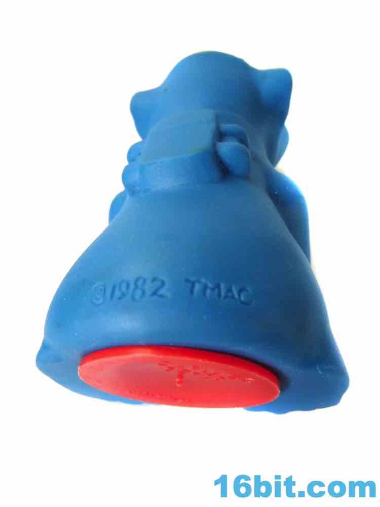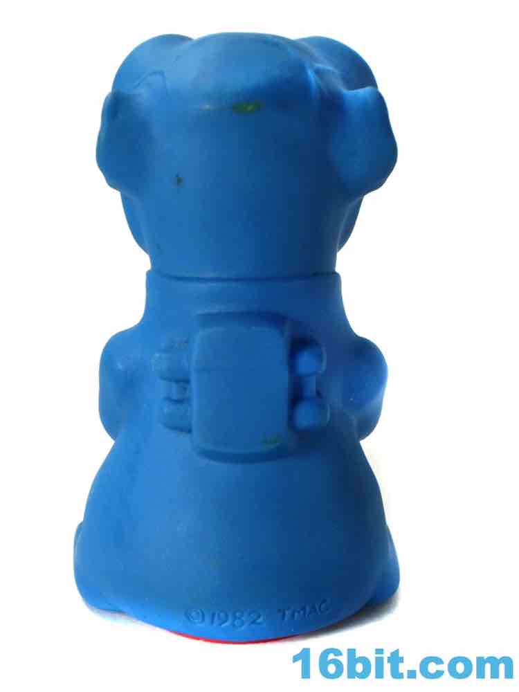 This 4-inch alien is missing the "secret message" here so I can't easily find that. This one does have his red Caplug, reading (for you search engine people) "CAPLUGS EC-20" and "NAS-813-20." I've seen carded samples on eBay with red plugs, but this blog shows one with a matching blue plug instead. It says "TMAC 1982" on his bottom near the ground, and that's his only identifying mark. The unpainted blue figure has highly reflective green eyes which do a bang-up job distracting you from the fact this is cheap, hollow, rotocast vinyl unpainted figure. With sleeves, some sort of rank box, a backpack, and a collar of sorts around his neck he appears to be clothed. He's also got a weird veiny pattern on the top of his head, as well as pointy quasi-Vulcan ears.