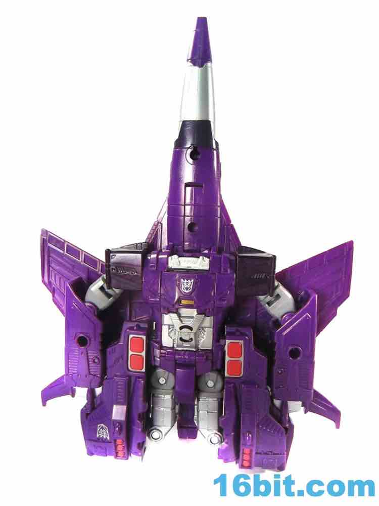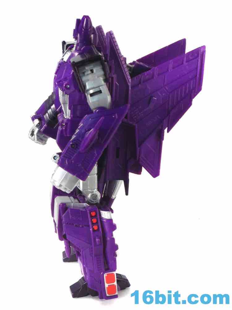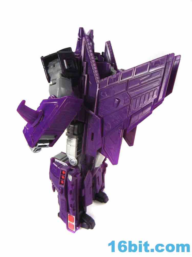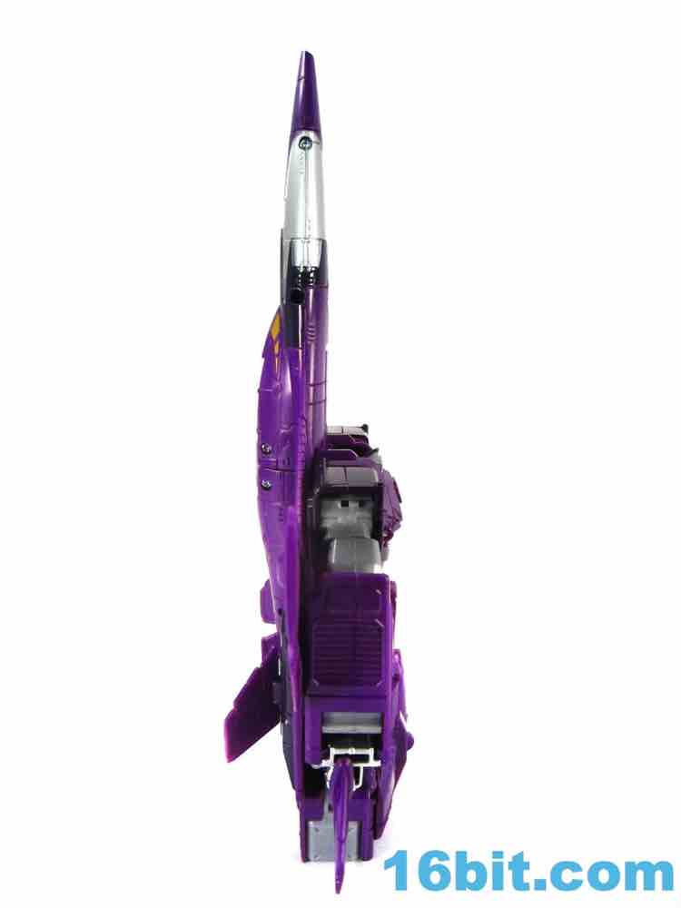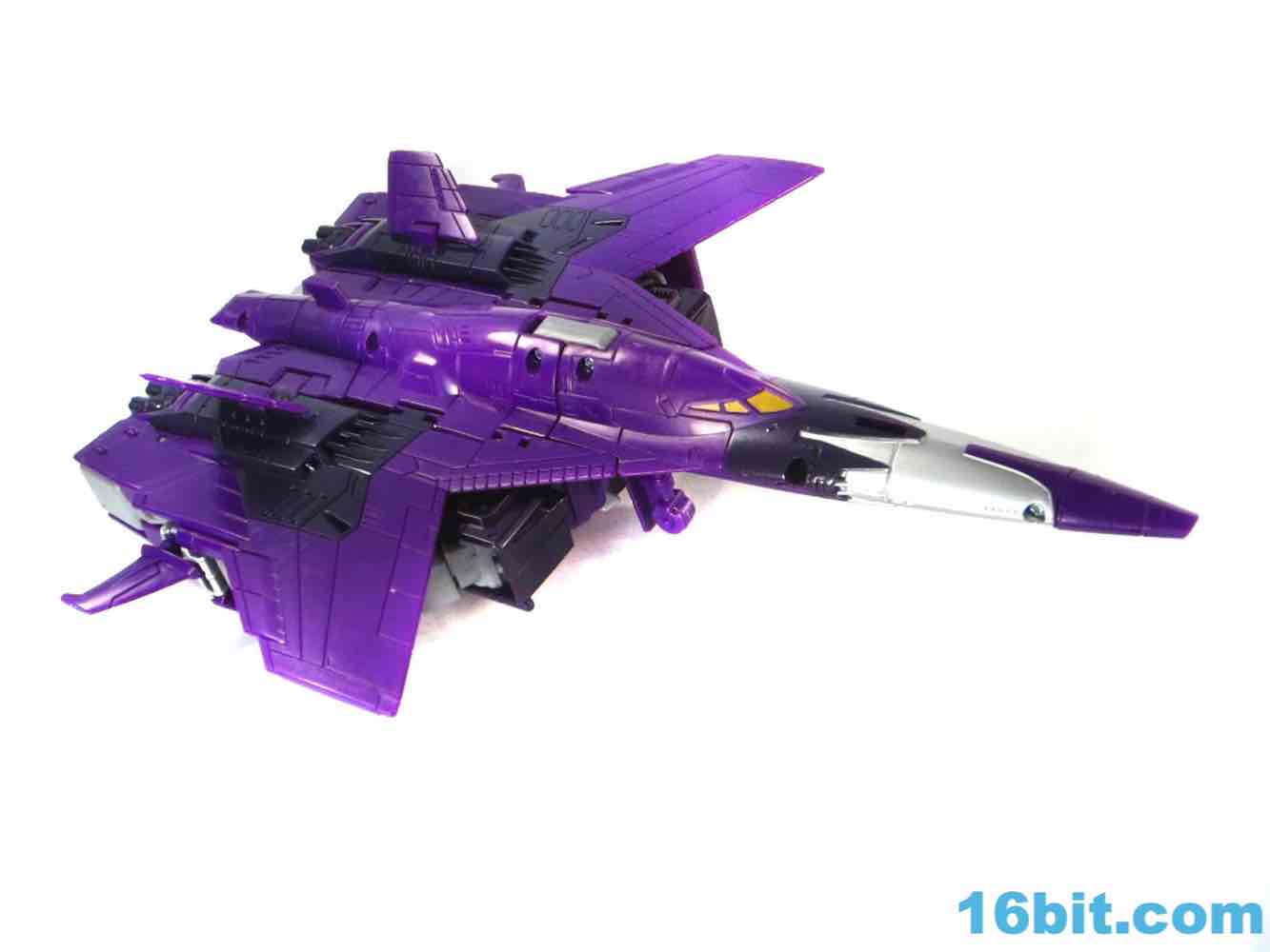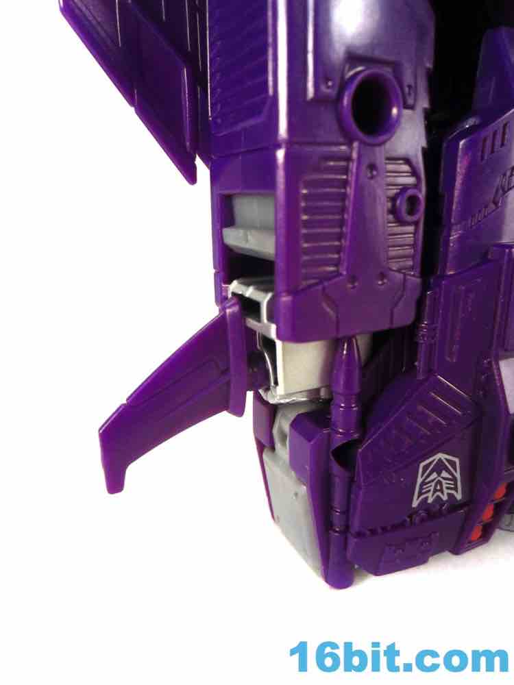 Transformation is nothing special - The nosecone folds down, the arms tuck in, the legs contort, and you've got a decent mishmash of the cartoon and original toy design. There's a gold set of windows, some silver on the nose, and dark purple, ah, "highlights" throughout. If you want a Cyclonus that doesn't look gappy in the ship mode, this is it. You have made it - and if my doomsday prophecies on toys after their 30th birthdays hold true this may be the last one you see. It doesn't do much - a couple of wings move, but that's about it.