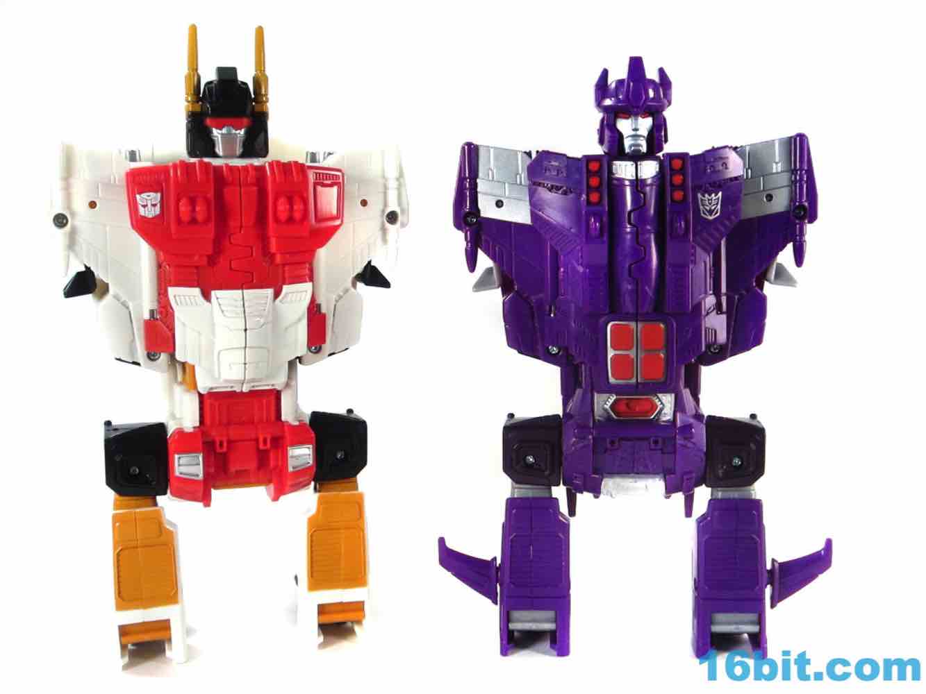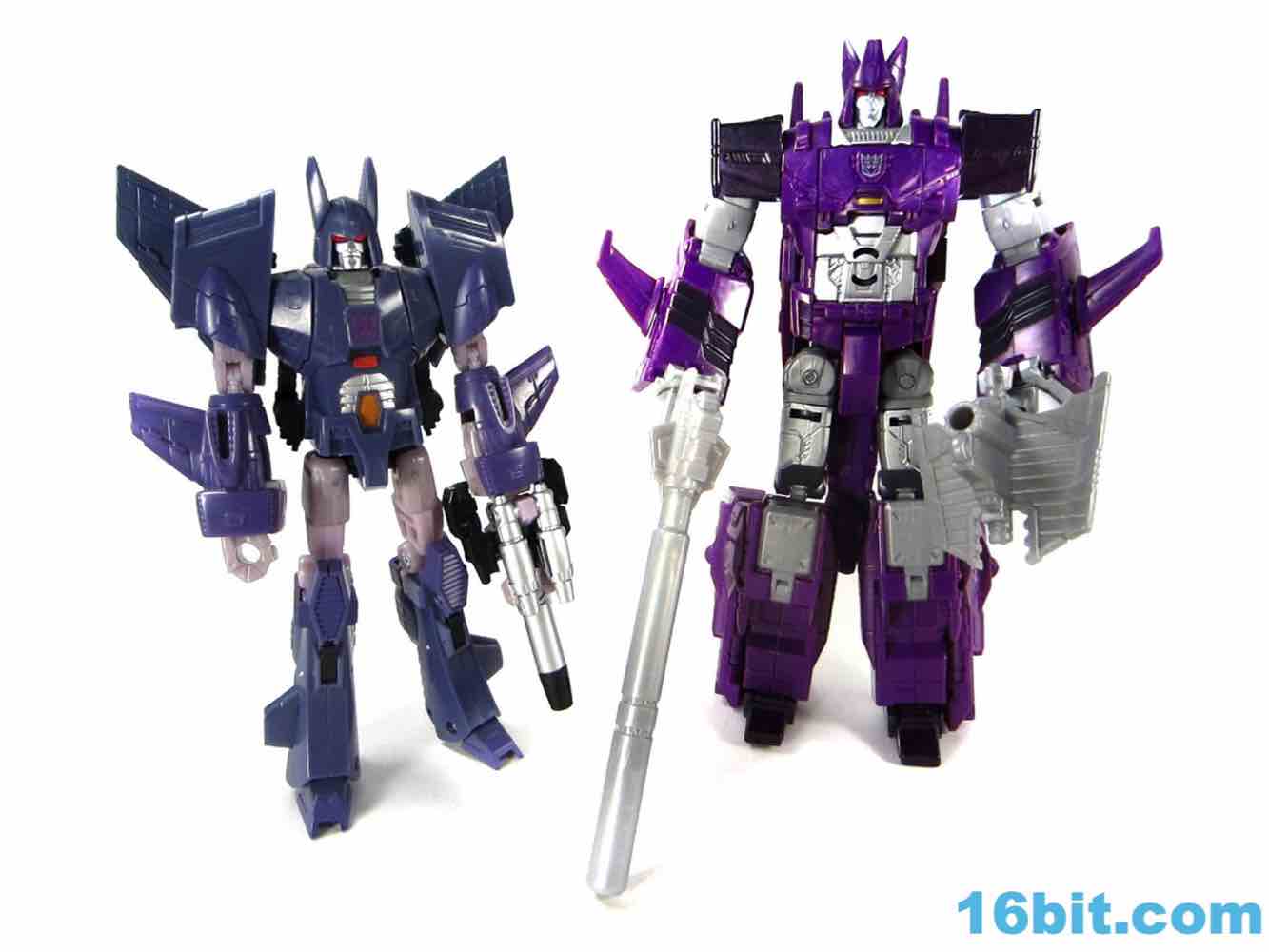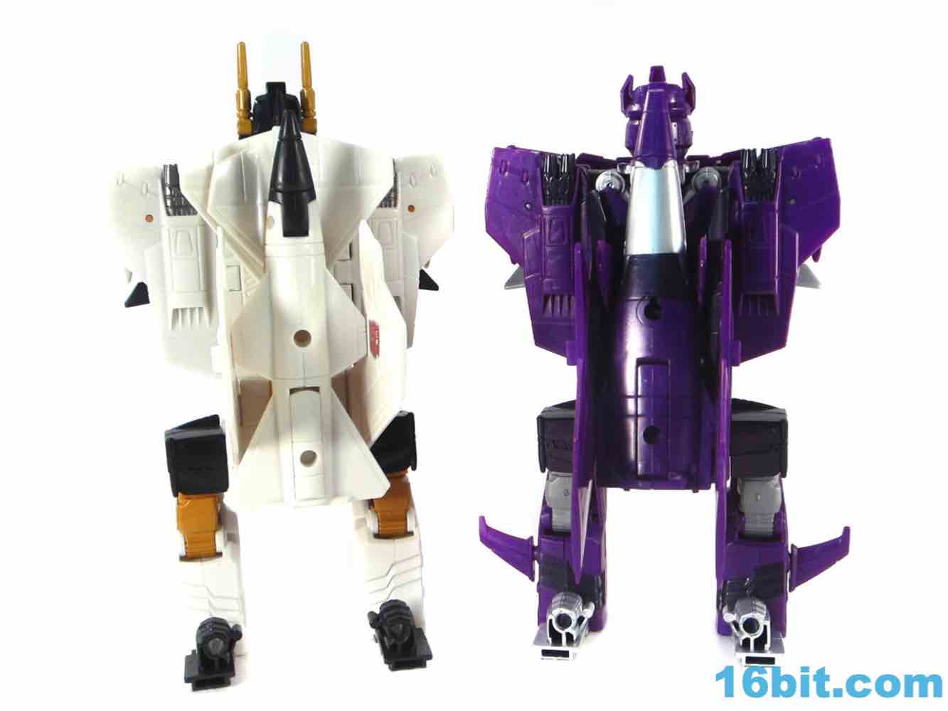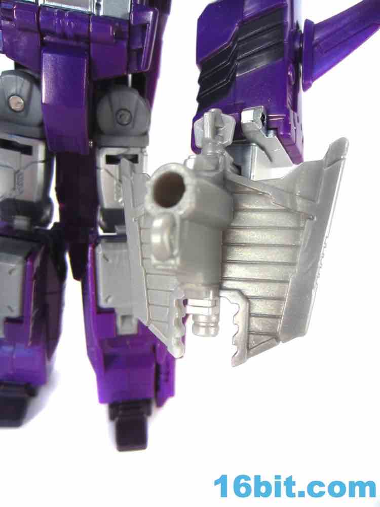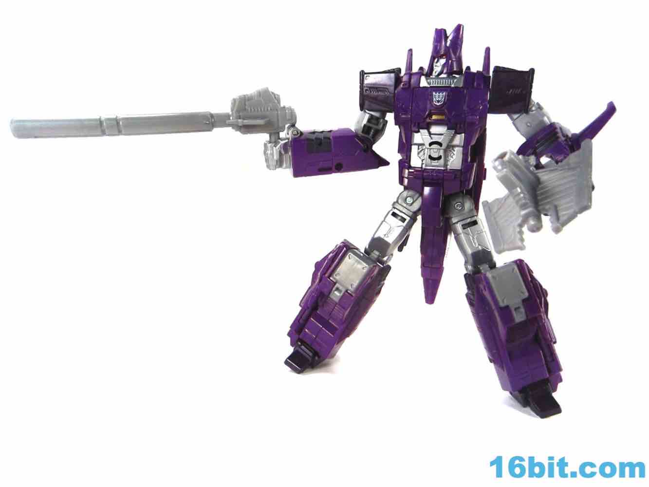 As with Silverbolt, Cyclonus is a 7-inch tall robot mode with 19 points of articulation. The toy is close to a chunky version of the original cartoon design, minus the gun. It's just Silverbolt's two-piece gun and shield, but in a silver color that scares me about future crumblage because I worry about that sort of thing. Cyclonus is nicely articulated and is surprisingly the exact same engineering as Silverbolt, but with numerous new parts. The arms, thighs, and lower torso are pretty much the same but everything else is new - the head, the "shins," his chest, and it's a beautiful thing. It's also the biggest Cyclonus to date, which is nice because the last Deluxe one was also unusually tall.