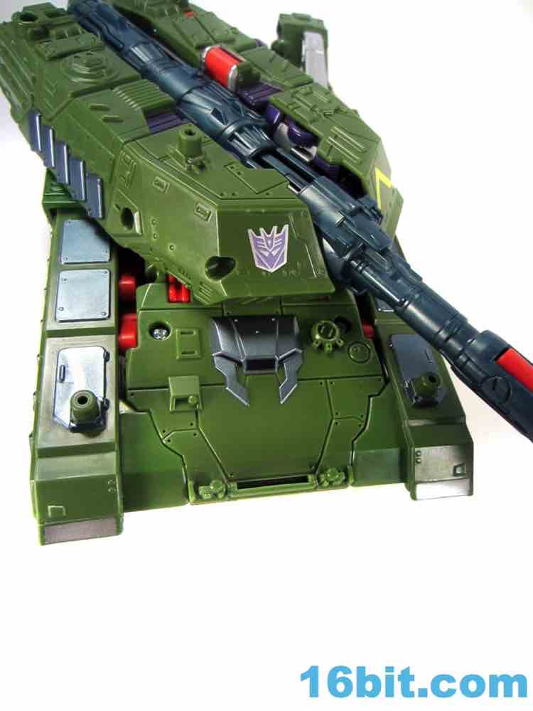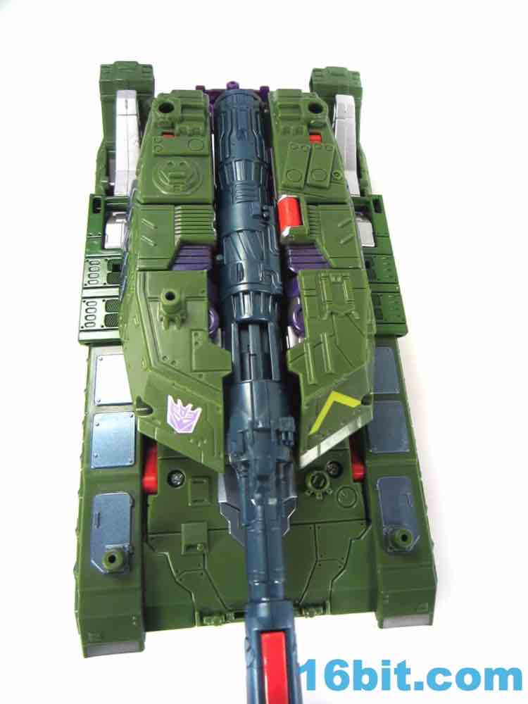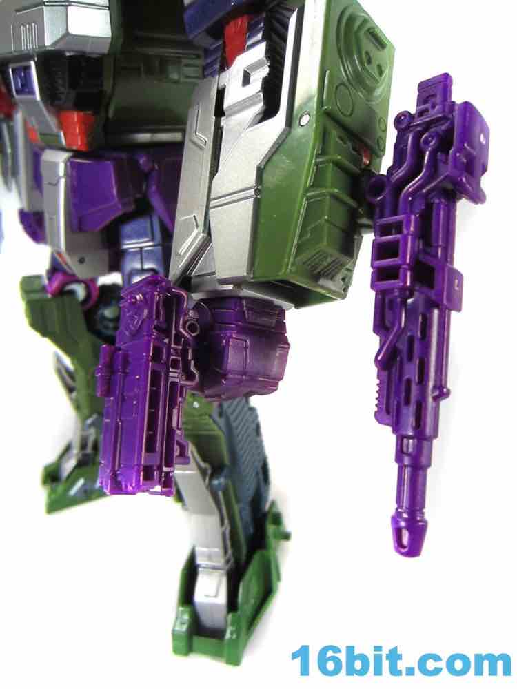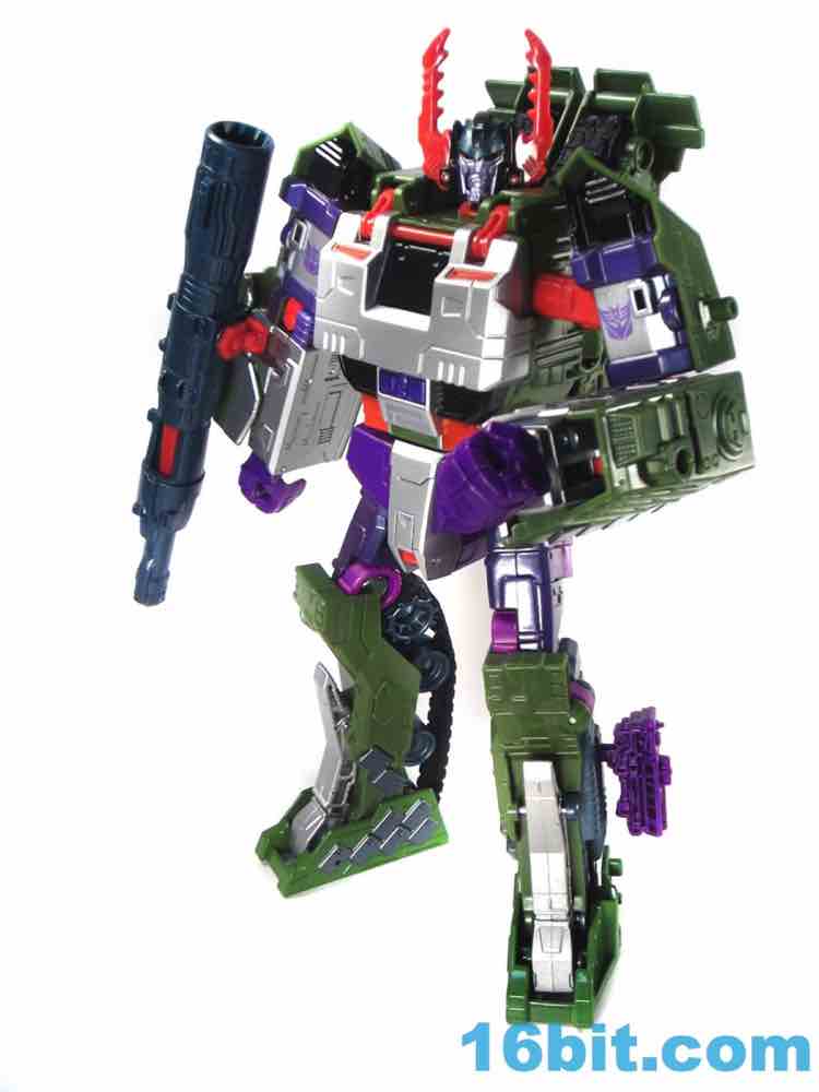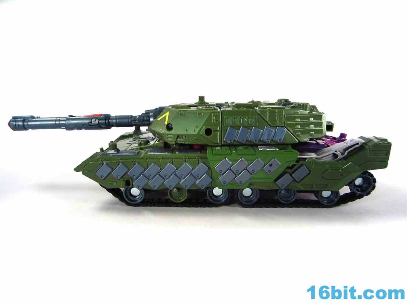This tank looks better as a tank than G1 Megatron. The green plastic and chevrons are spiffy, hiding most of the purple and red other than the aforementioned crotch and his handguns. The telescoping cannon is a nice touch, and it seems to work better when fully extended. (Yes yes, I am sure that is what she said.) The sculpting is quite good and it looks similar to Revenge of the Fallen movie Bludgeon, minus the annoying tank tassels and bendy swords.