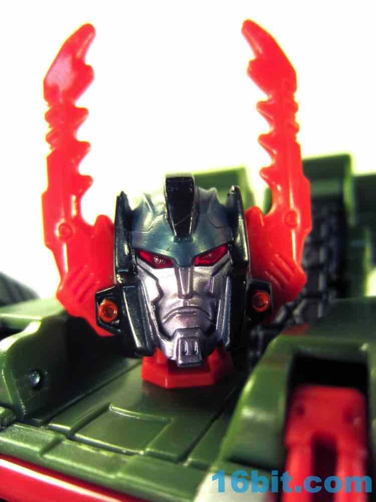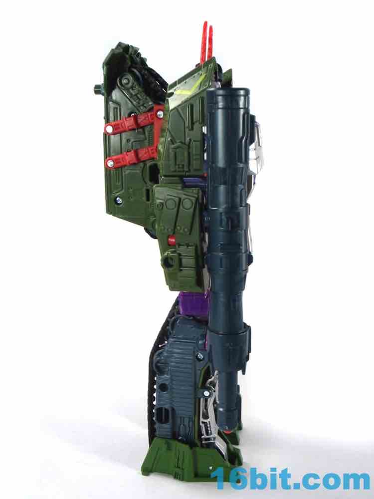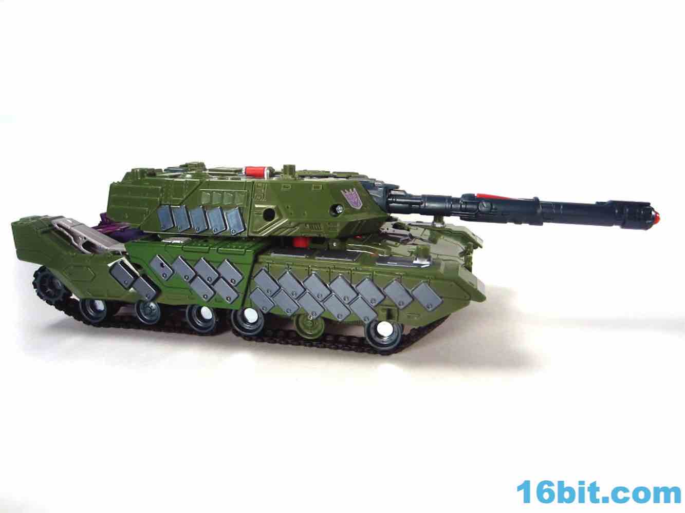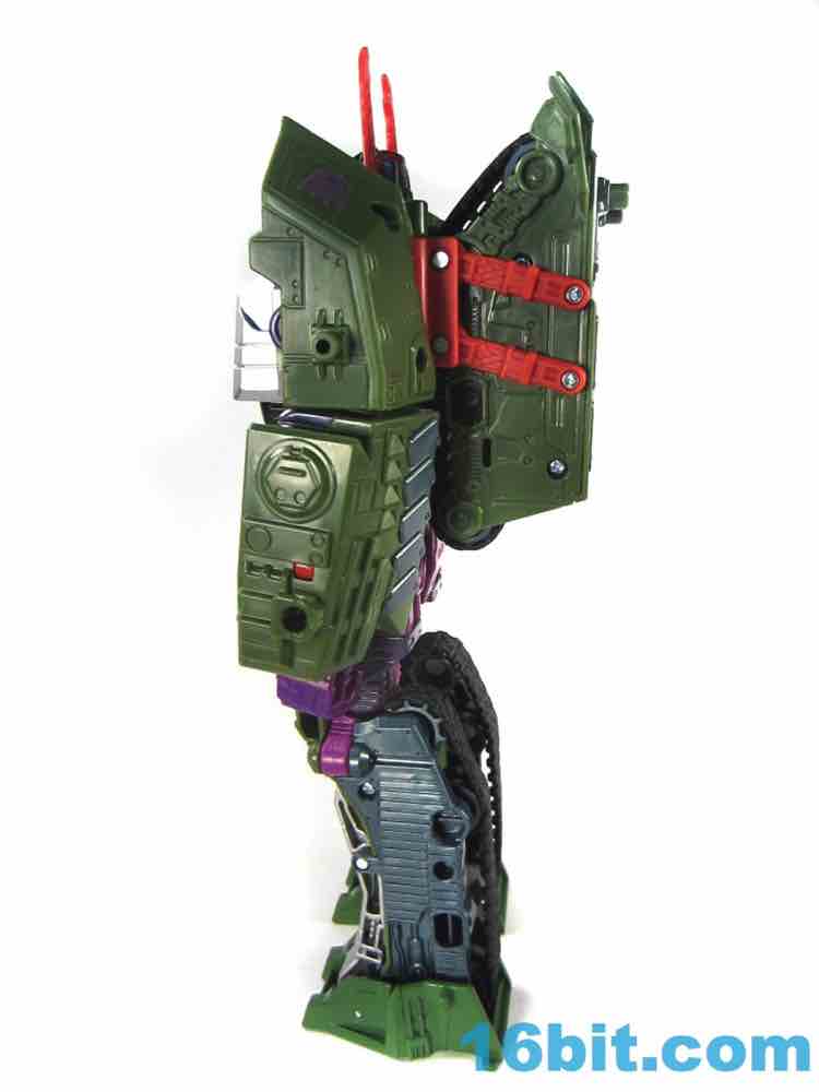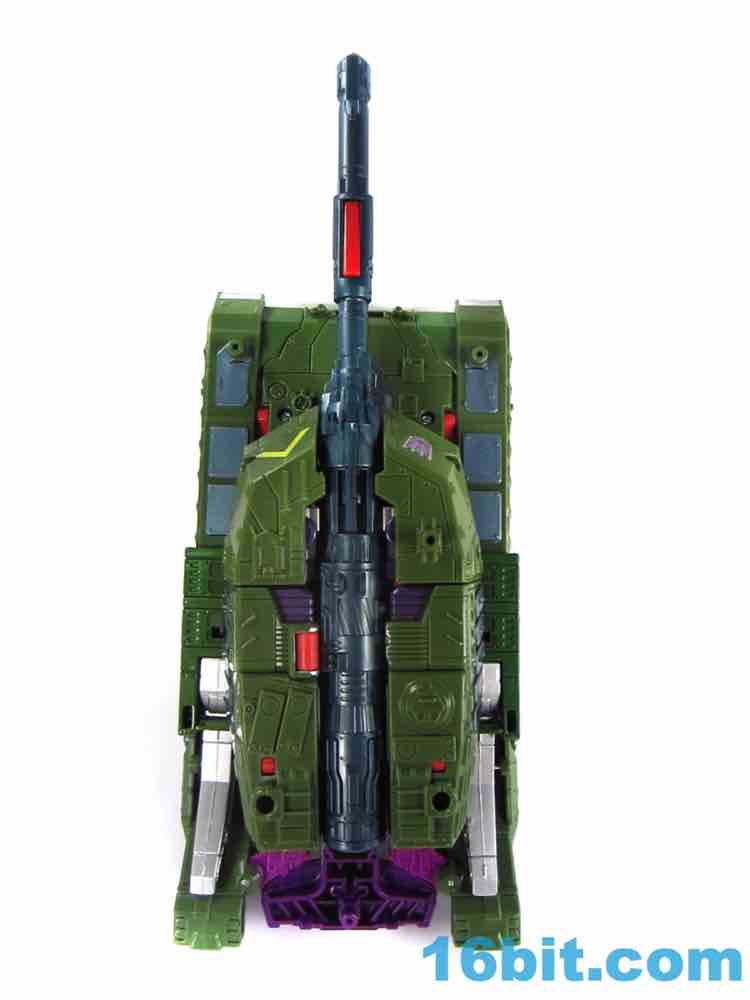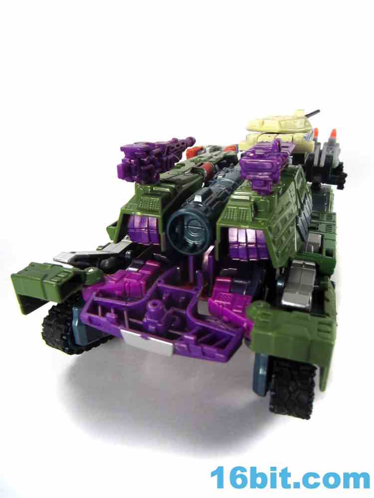 This tank looks better as a tank than G1 Megatron. The green plastic and chevrons are spiffy, hiding most of the purple and red other than the aforementioned crotch and his handguns. The telescoping cannon is a nice touch, and it seems to work better when fully extended. (Yes yes, I am sure that is what she said.) The sculpting is quite good and it looks similar to Revenge of the Fallen movie Bludgeon, minus the annoying tank tassels and bendy swords.