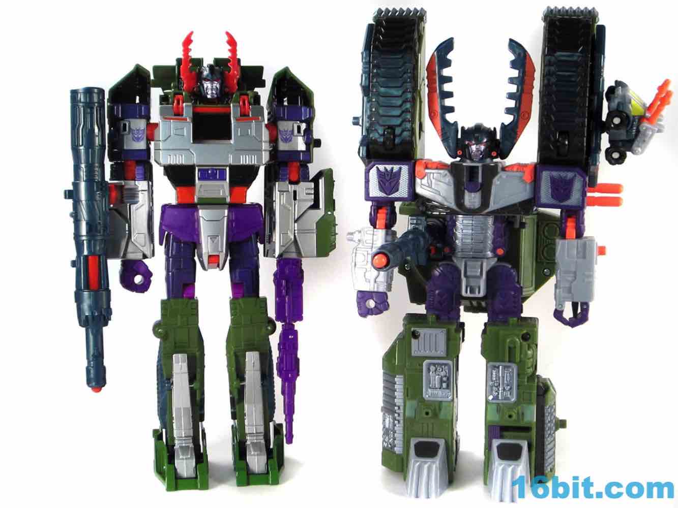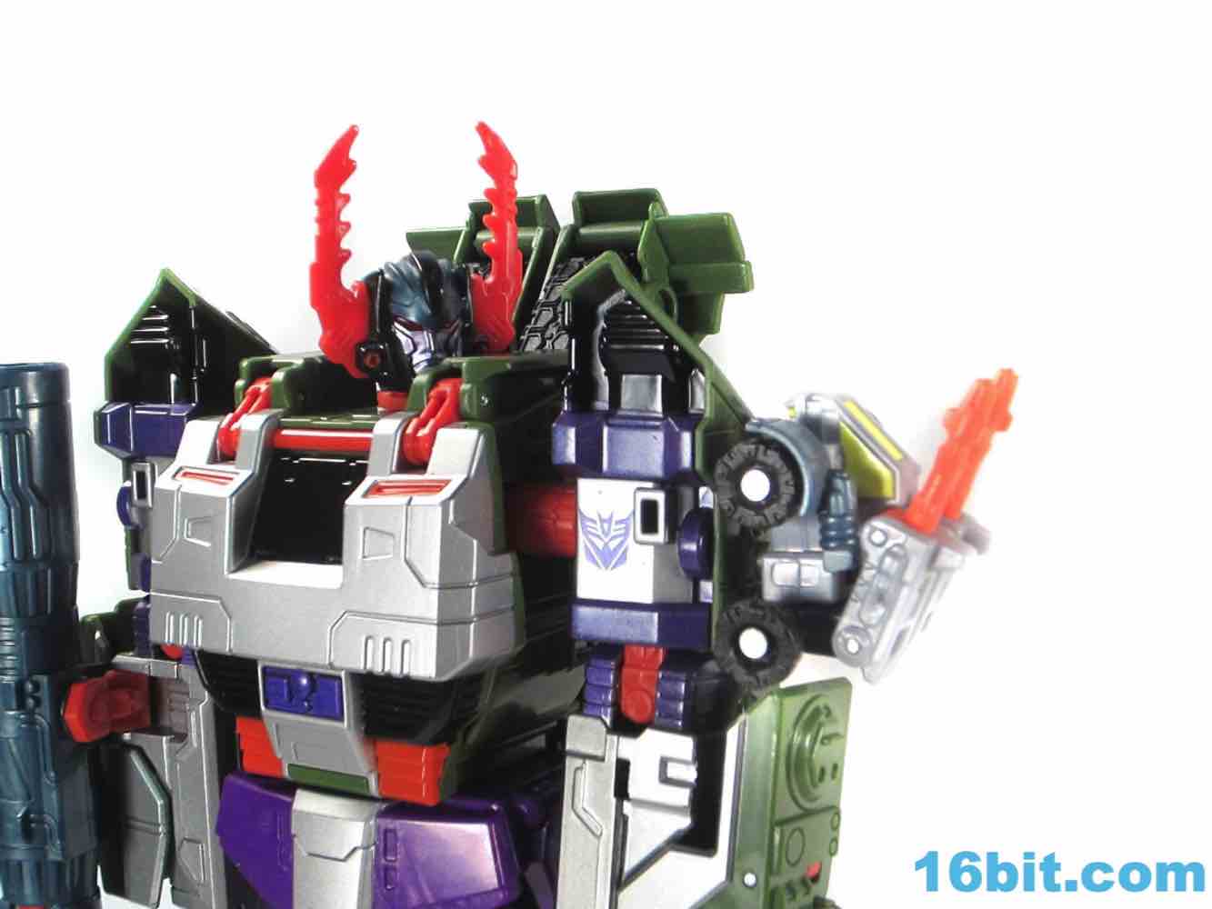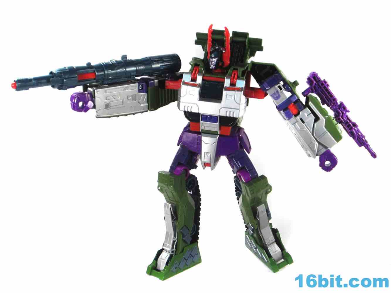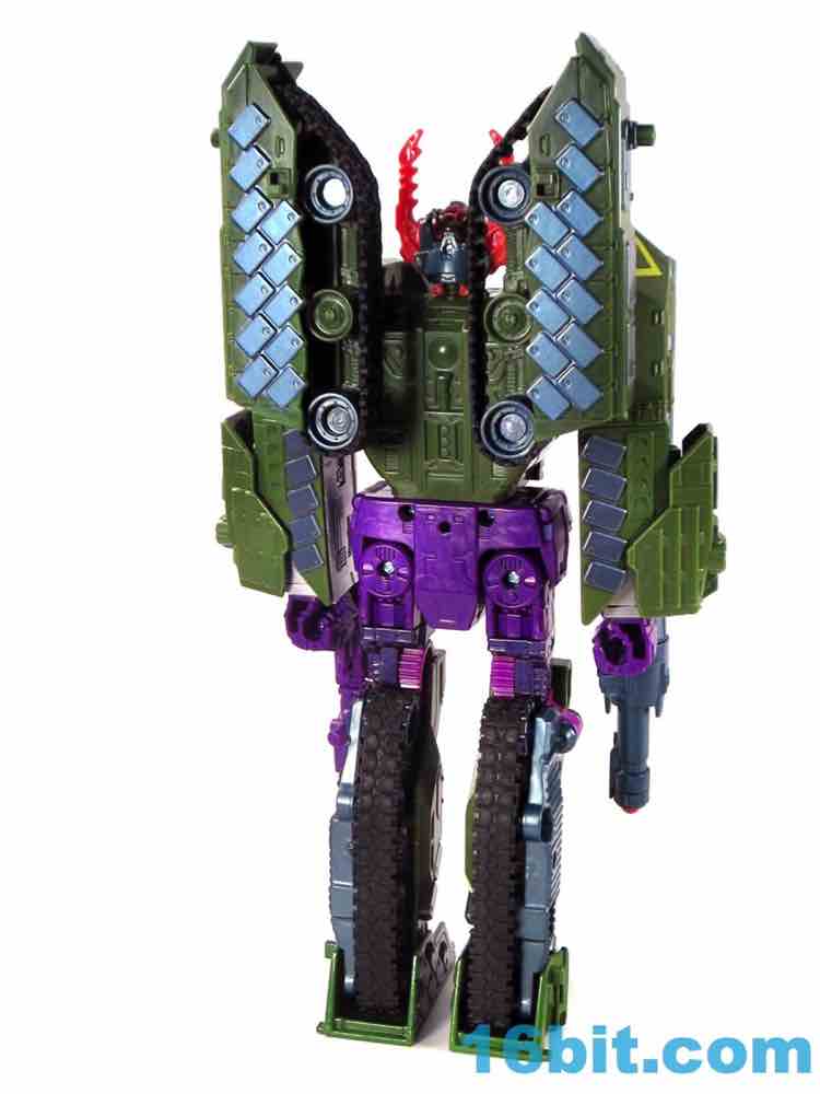 This tank looks better as a tank than G1 Megatron. The green plastic and chevrons are spiffy, hiding most of the purple and red other than the aforementioned crotch and his handguns. The telescoping cannon is a nice touch, and it seems to work better when fully extended. (Yes yes, I am sure that is what she said.) The sculpting is quite good and it looks similar to Revenge of the Fallen movie Bludgeon, minus the annoying tank tassels and bendy swords.