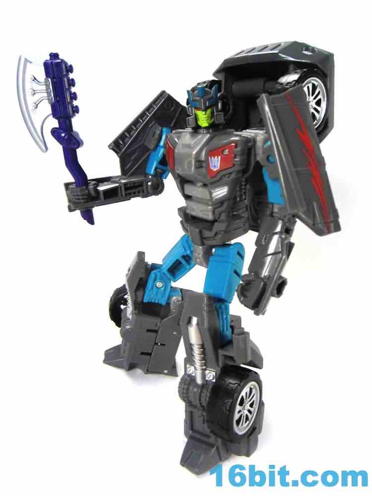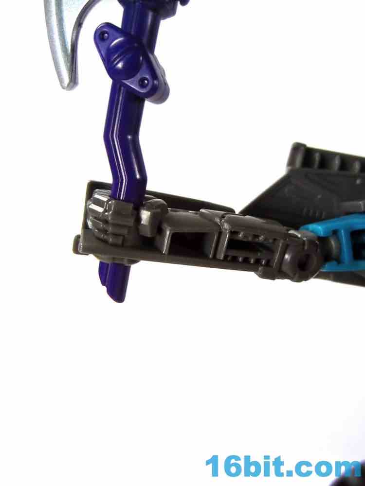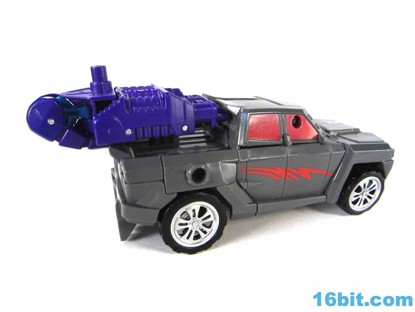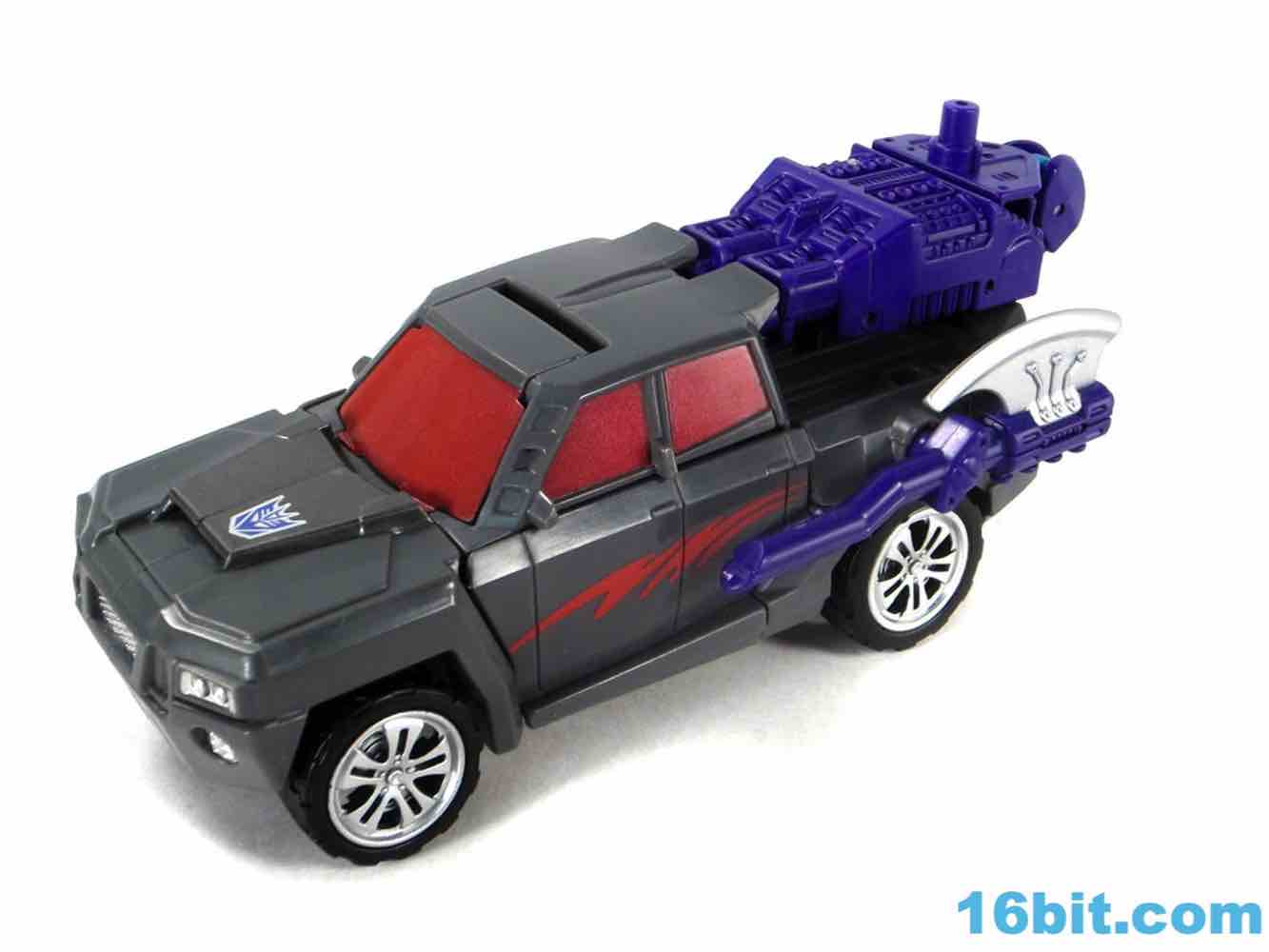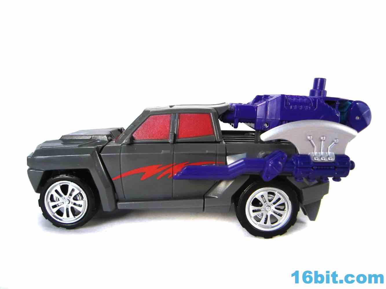 It's a truck! Of all the wave 2 Decepticons, his transformation is easiest. The legs open up and swallow the thighs, the arms fold in, and the truck hood covers the head. It's super simple and there's even a little ridge on the truck bed on which to mount the foot/hand piece. The axe plugs in the side of the truck thanks to a 5mm peg, and everything stays together nicely. As toys go this is a fun one - you don't even need to consider the whole limb thing for it to be decent.