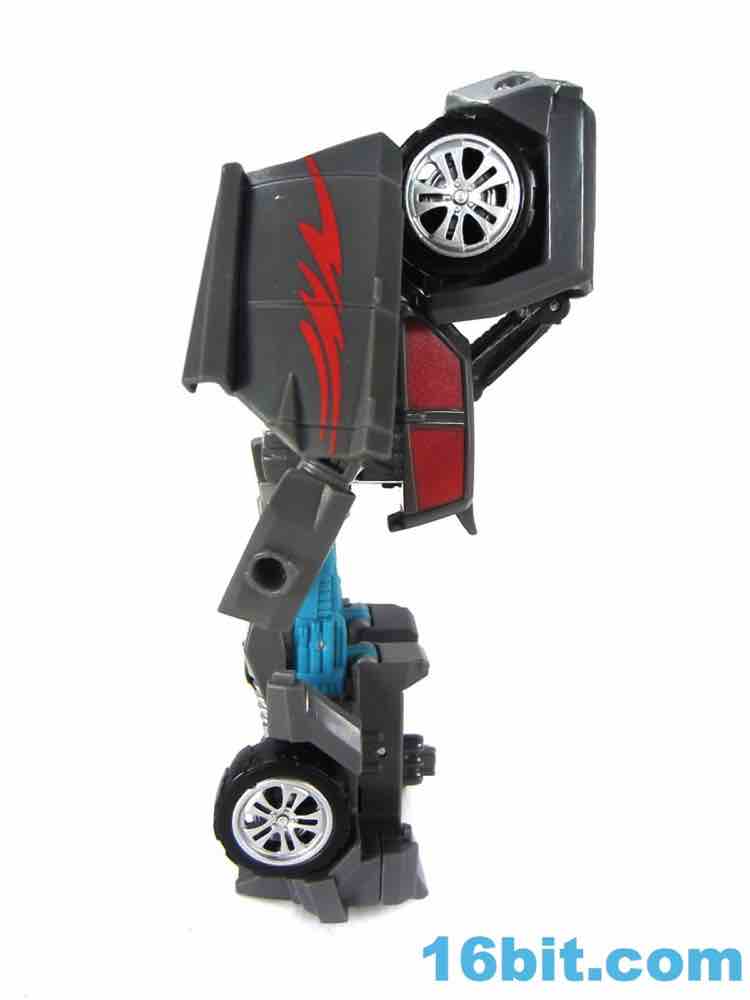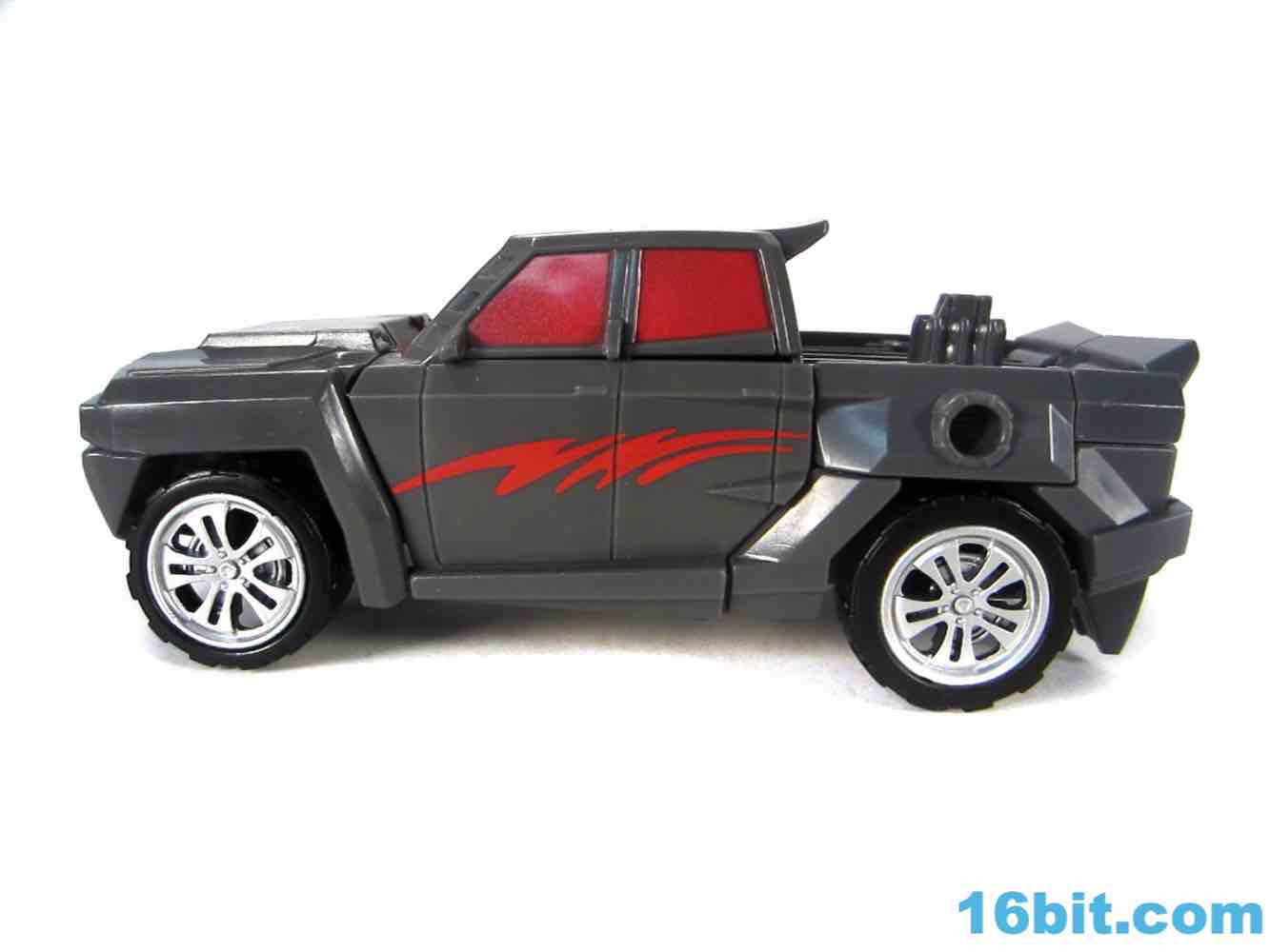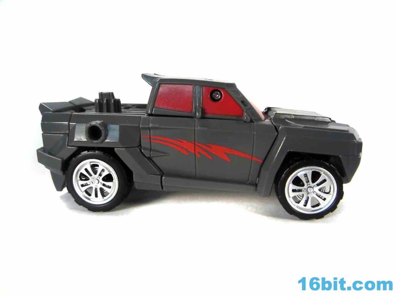 The truck has silver wheels, red squiggles on the doors, and red windows - basically, he's a Wildrider wannabe. The dark grey vehicle looks pretty decent with some silver highlights - and headlights - and absolutely nothing on the back end. They were clever about what got paint where, resulting in a superior robot and a pretty good truck... depending on how you look at it, that is.