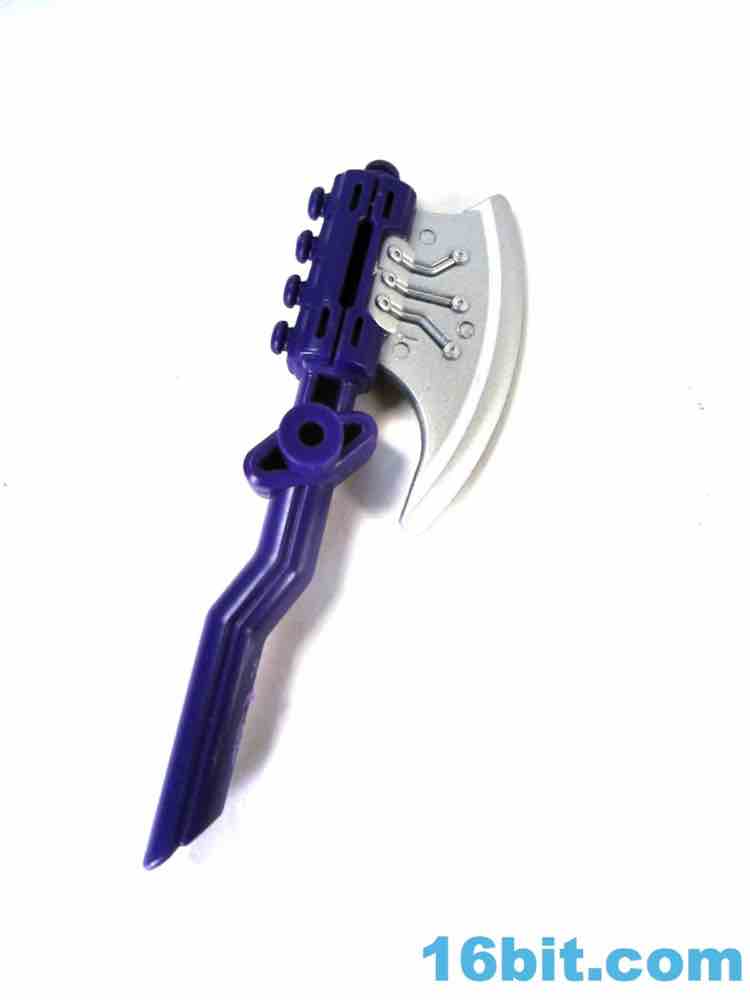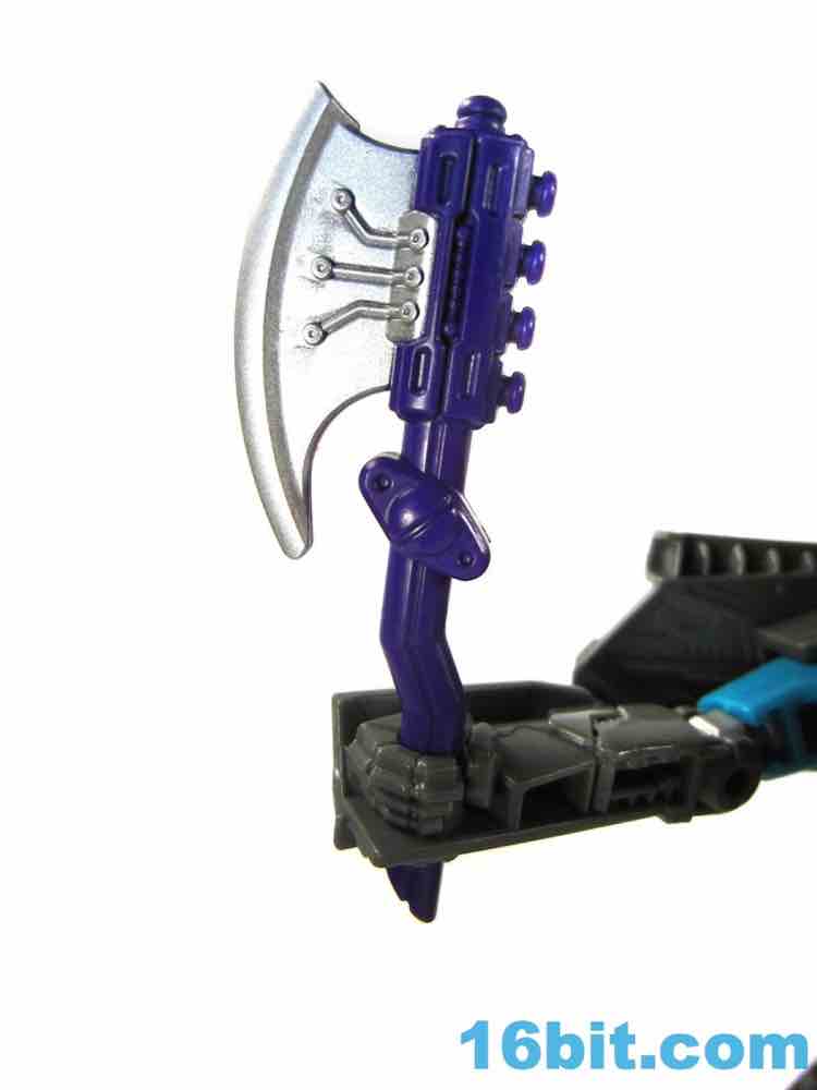 According to TFWiki, the head is an update of Ruckus and at one point this toy could've been Ruckus. Because of trademarks and other issues, we got a new guy instead and I'm totally fine with that. This figure looks great with a grey truck shell, blue interior limbs, and a sickly green face making it stand out from a lot of other recent toys. A purple axe with a silver blade fits in his closed fists, which have sculpted fingers on the inside. There's even a Decepticon sigil on his red chest, making this a fairly colorful character for someone we never met before a recent comic book.