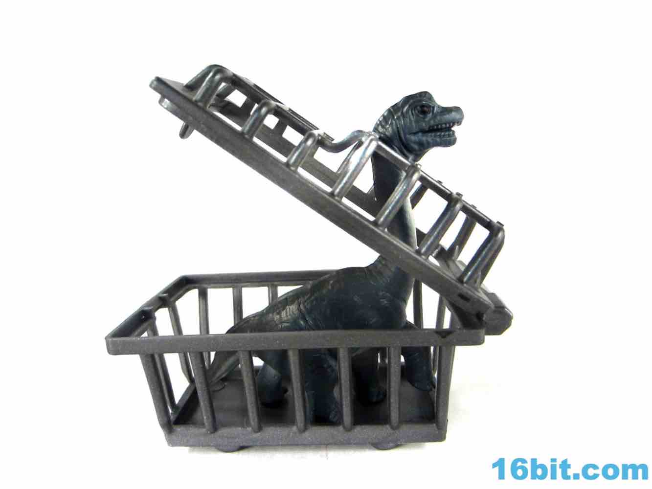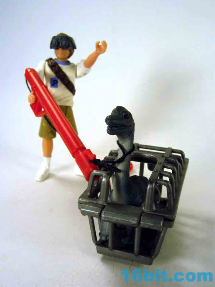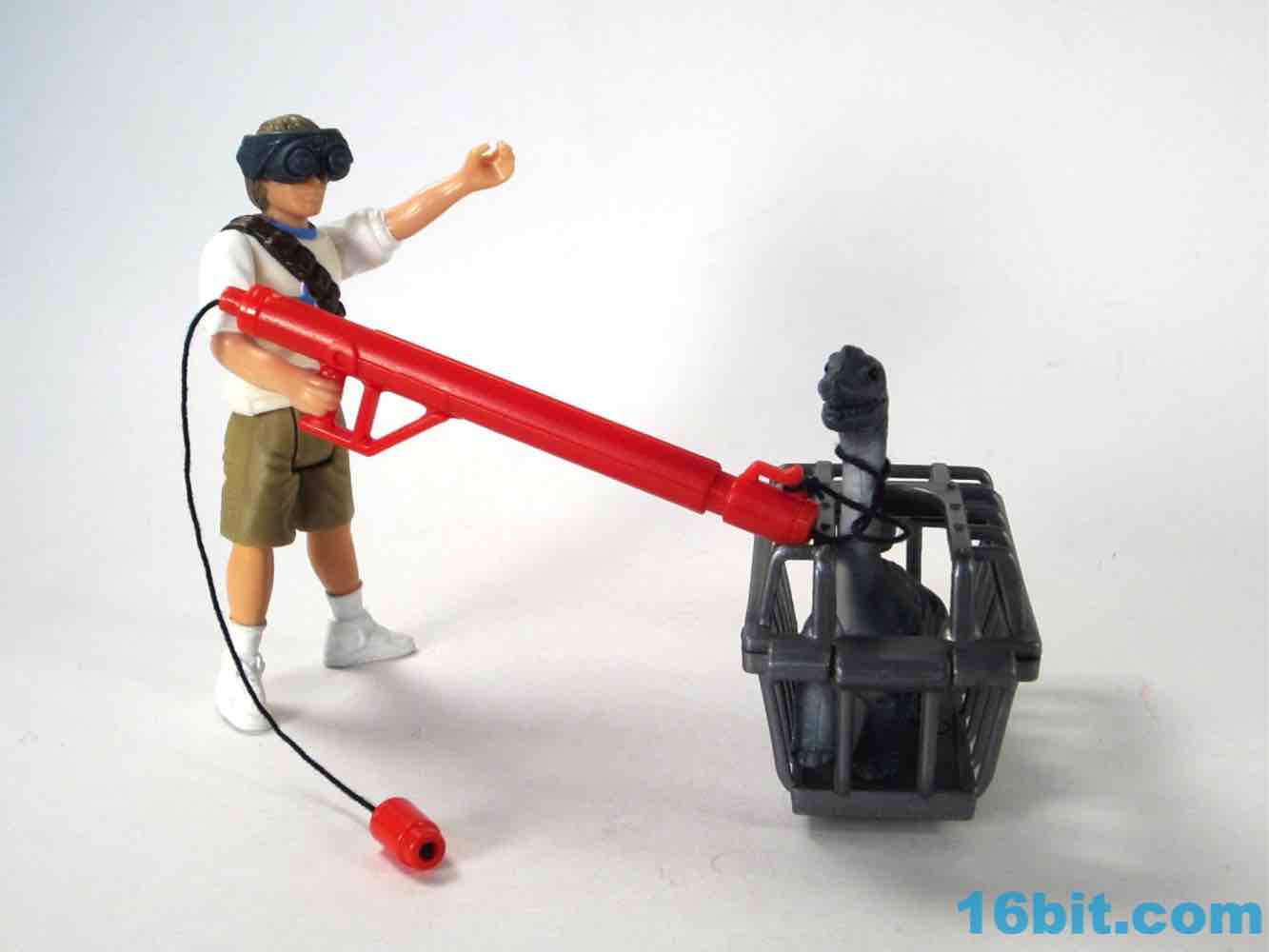 Tim has no problems holding the big, red snare which can be activated by pulling out a cap on the end of it. It's a pretty good "third leg" for the figure, helping prop him up so he doesn't fall under the weight of his accessory. A silver cage opens up and has a big opening for the baby Brachiosaurus' neck, which is all sorts of awful. The dinosaur hatchling is quite nice, particularly when compared with other dinosaur toys of the era. He has a white "JP" brand, black eyes, and a white belly - and no articulation. He's an impressive little fellow and the only sauropod toy to be made for the first movie's toy line, not counting the die-cast metal figures, as nobody counts those. Other than a redeco, the long-necked dinosaurs didn't get much love for those first two movies and no larger toys were made for any of the films so far.