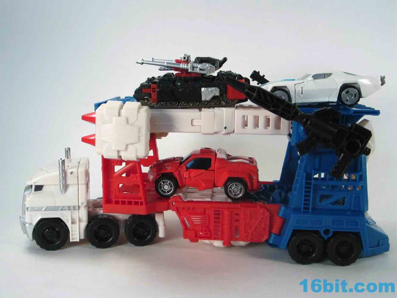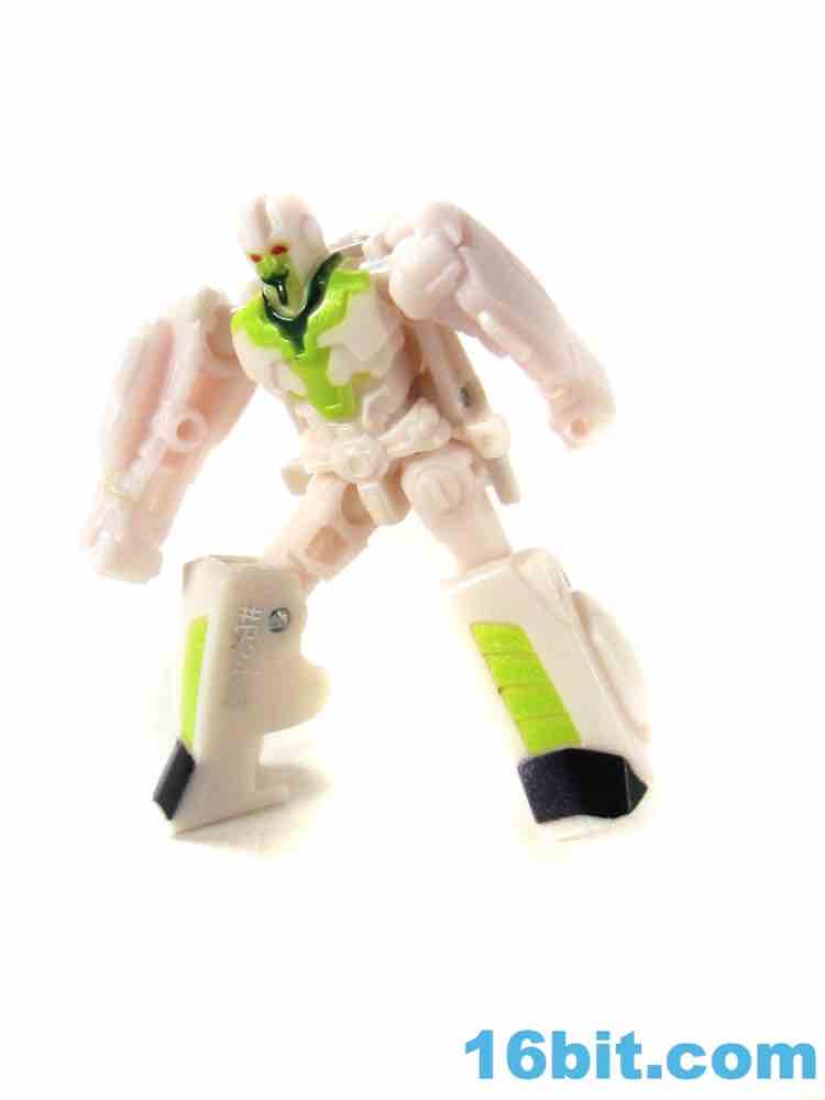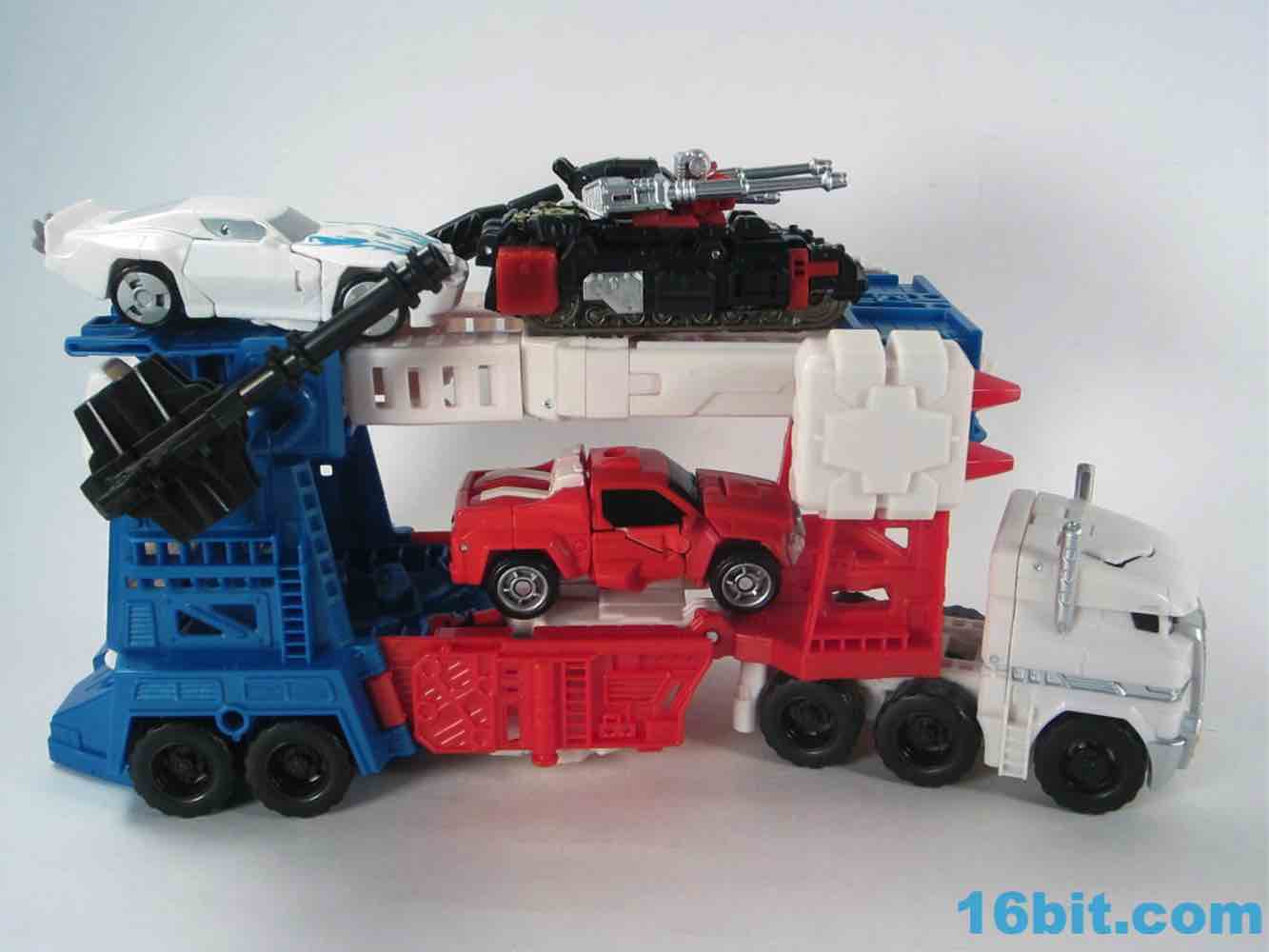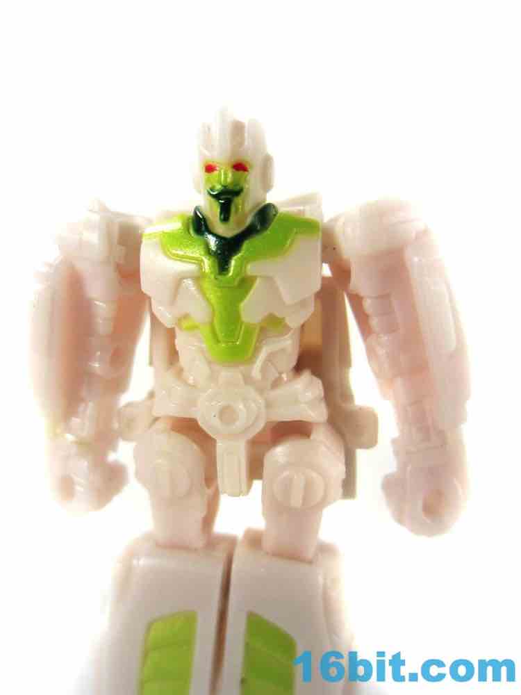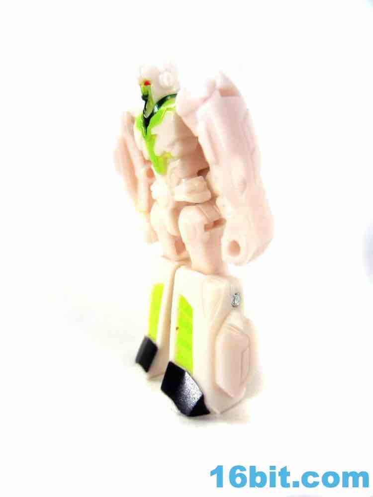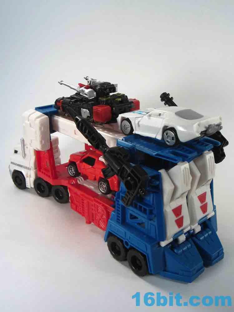 Minimus Ambus is basically the size of the "Micromaster" sidekicks from a couple of years back, a tiny toy with great paint and no wheels. The hovercar turns into a robot, which fits in Magnus' chest perfectly. The little car doesn't really fit on the car carrier mode, but it does have painted windows and just enough green to be interesting. The fake facial hair amused co-workers to no end, and it's a fun twist to the tradition of the armored white Optimus Prime. For five bucks, you'd probably happily buy one of these - but with no wheels or accessories, he's not a lot of fun without the bigger toy. The paint on mine is perfect, and the figure's transformation is simple and intuitive. There's not a lot of detail here, but it's worth mentioning that the head sculpt and deco is exceptional for the size. I expected more slop, and did not get it.