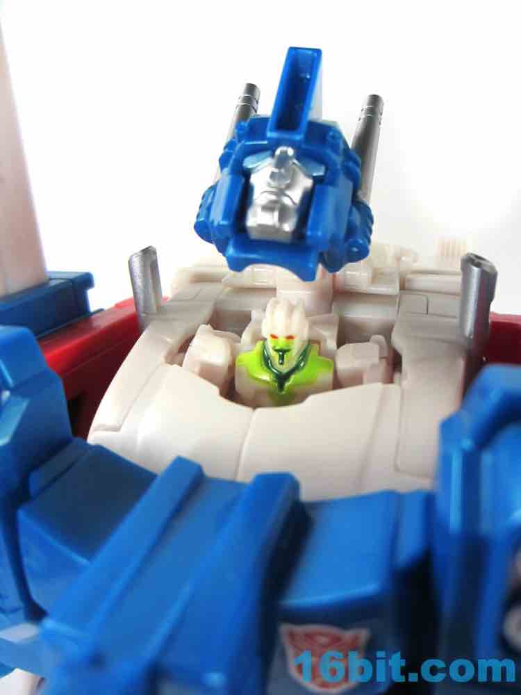 If you've been reading the More Than Meets the Eye comics this isn't a spoiler - but if you haven't, tough, you should've been. In this series there are lots of fun reveals, like how Ultra Magnus is a sort of eternal, legendary, indestructible lawman. Many have held the mantle, and currently it's a little guy named Minimus Ambus who has the power to basically power a larger body from within. This is directly illustrated with the toy's opening chest revealing a tiny control room complete with screens and joysticks for our bearded white and green hero. The little Minimus Ambus is barely a couple of inches tall, while the full Ultra Magnus stands 9-inches high at the top of the helmet. Interestingly, Ambus isn't necessary for a complete robot mode, nor can he fit inside the cab while transformed as a vehicle.