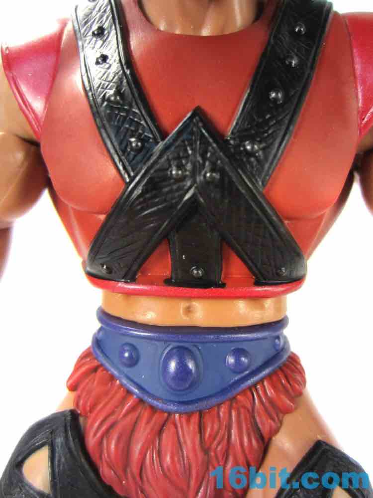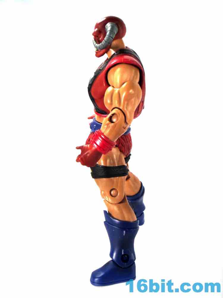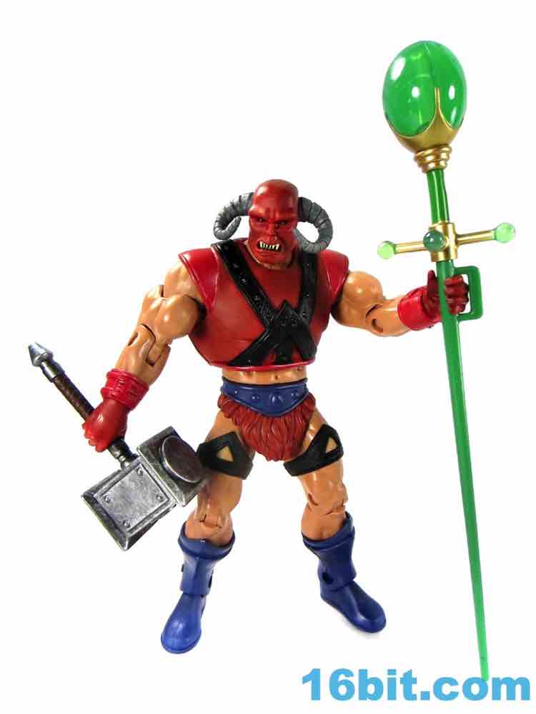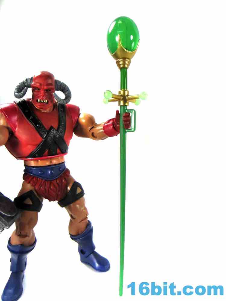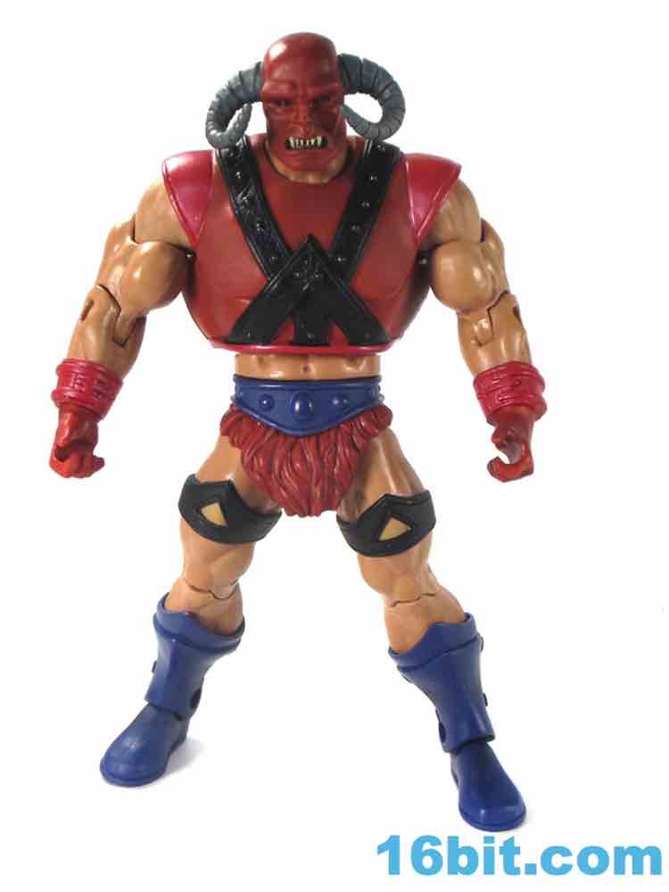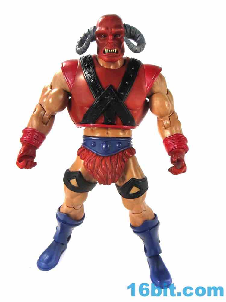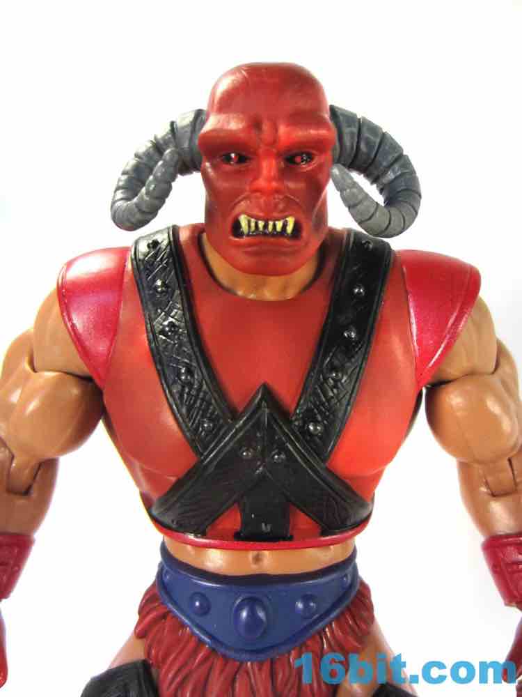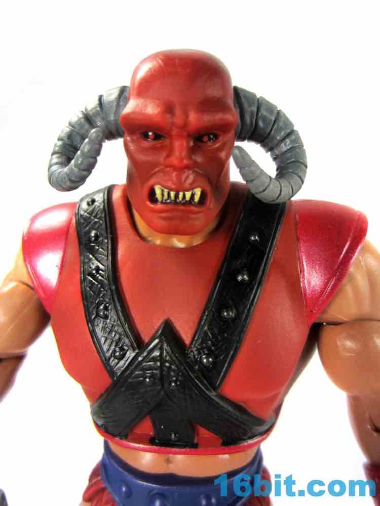 The head itself is somehow both very plain and very cool with black eyes, big white teeth, and giant horns coming out of what is either a mask or an unfortunate sunburn. Given that his flesh is of the pale European stock, I have to assume it's a costume - but I don't have the book, so what do I know? It's pretty expressive and it's hard to imagine it looking particularly cool as a toy of the 1980s, but here it looks just fine and teeters close to feeling out of place with the rest of the range.