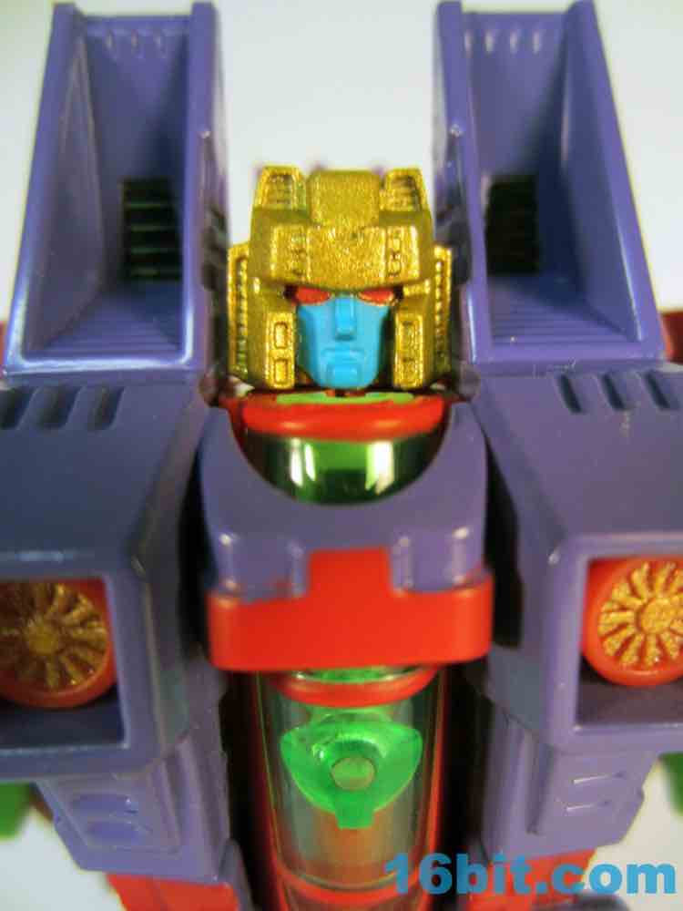 The jet has what can loosely be called retractable landing gear in the form of articulated air intake nipples. You can plug in the rocket launchers on each wing, and that's about all the jet does other than burn your eyes. You can see patches of color that really just don't work, which is sort of the charm. Bits of the gold robot head can be seen under the seating area, there are green and blue panels that shouldn't be there, but I will say the pink and purple bits largely go where they should. The border of the canopy glass is pink, and that does make for a slightly weird fit in an already strangely colored vehicle. There's really nothing bad to say that your own eyes can't tell you - it is what it is.