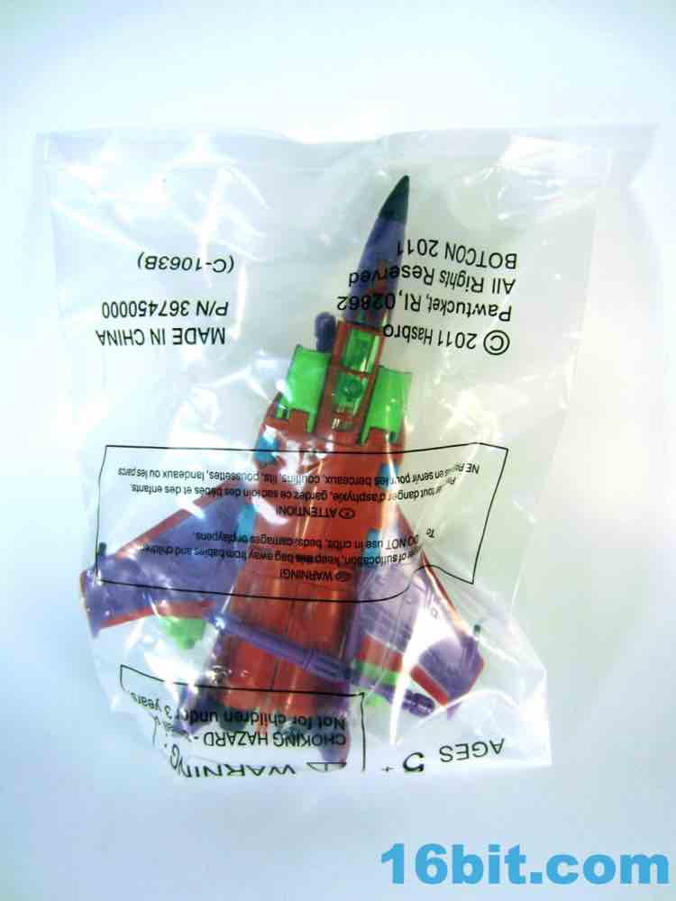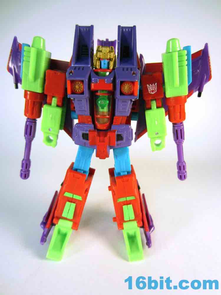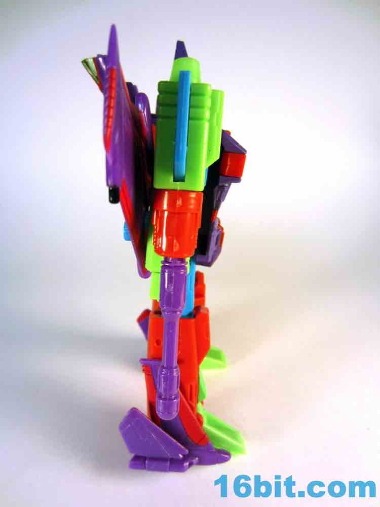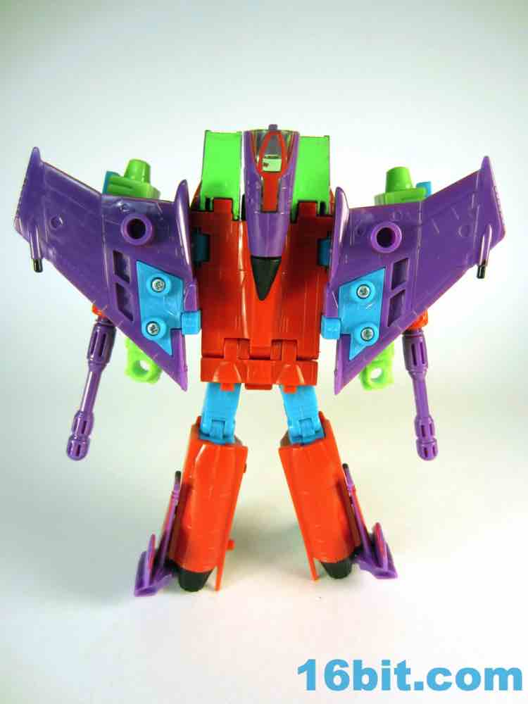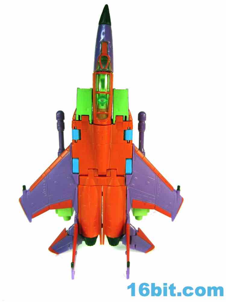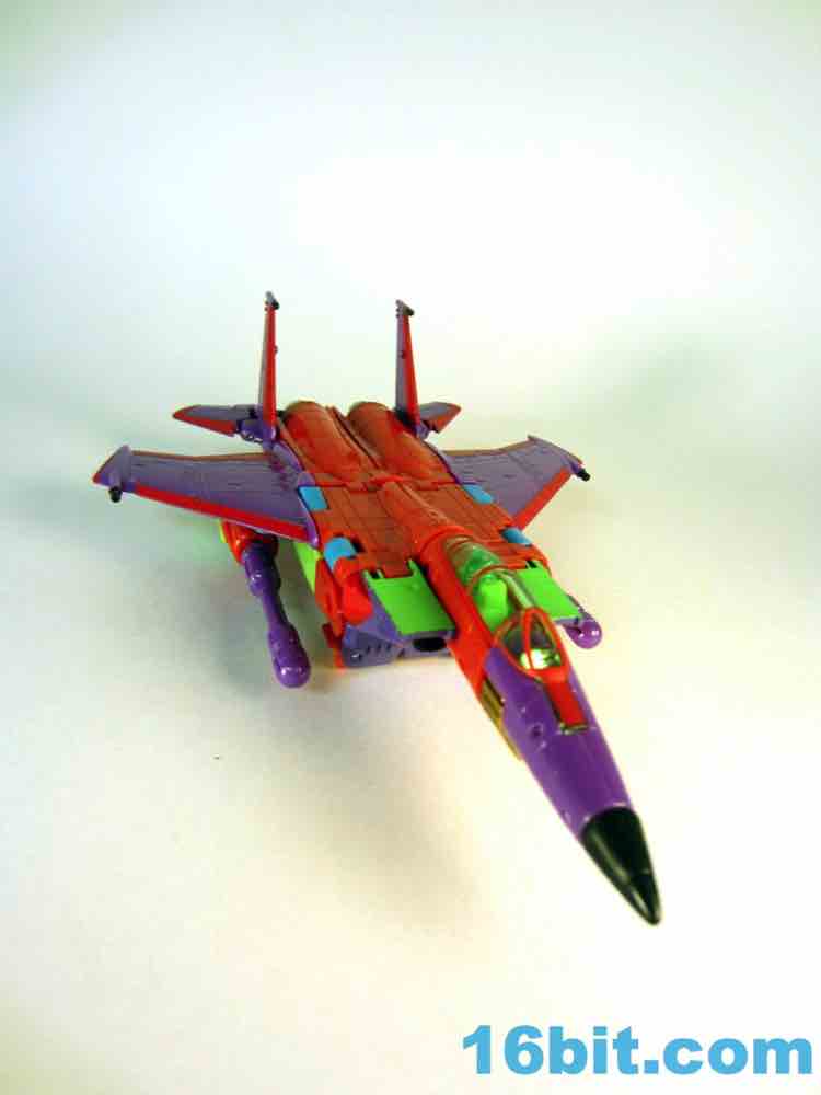 Transformation is nothing new - you've bought this mold by now and it's pretty good.< Slide the legs in, fold the nosecone up, rotate in some wings, and squeeze in the hands and arms to get a jet. While the robot is ugly, the jet has to service that design - and does so awkwardly./p>