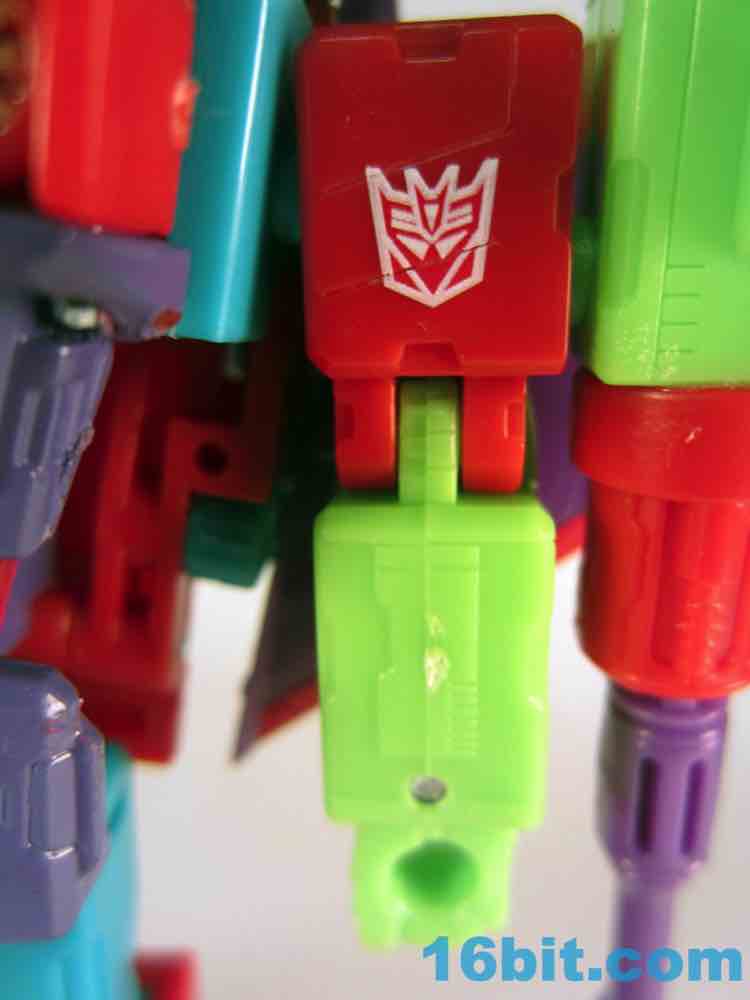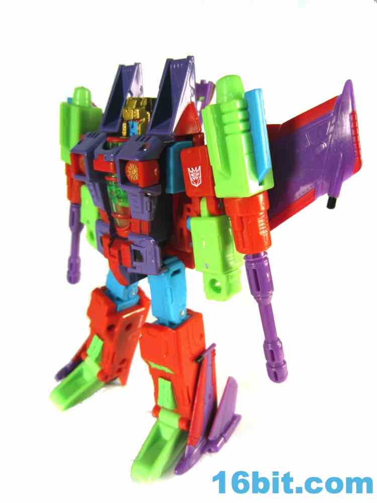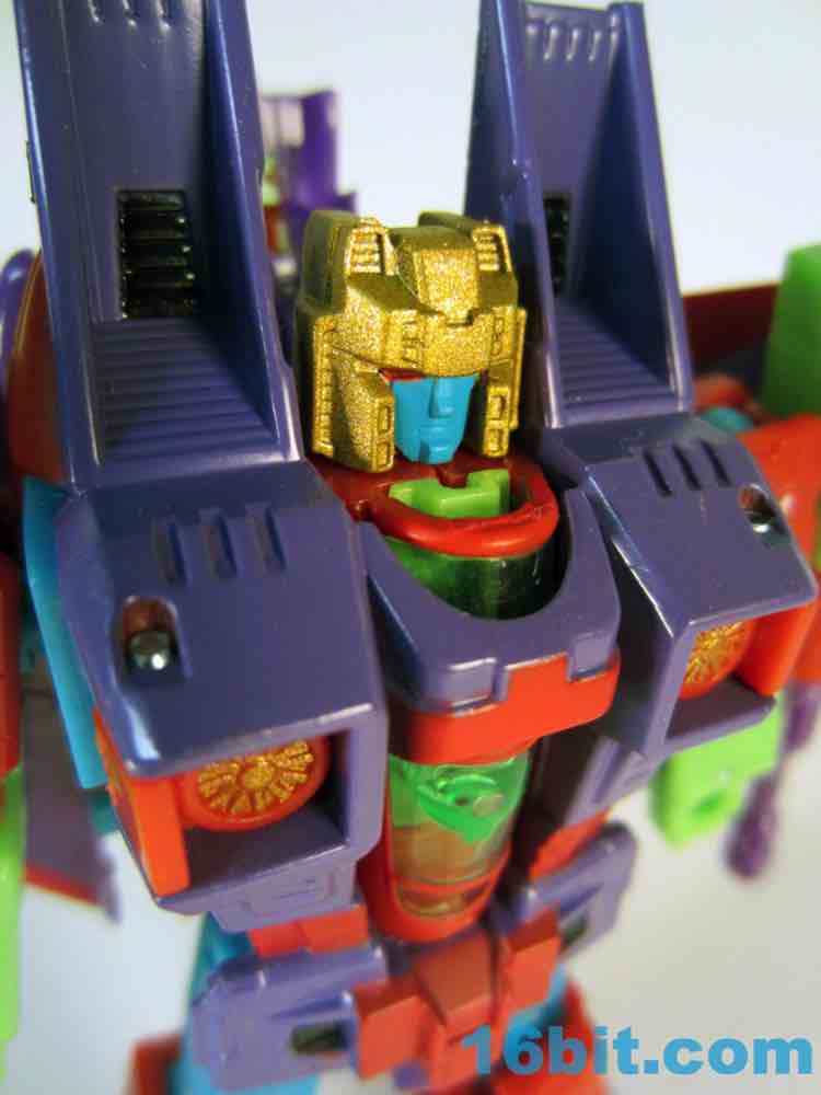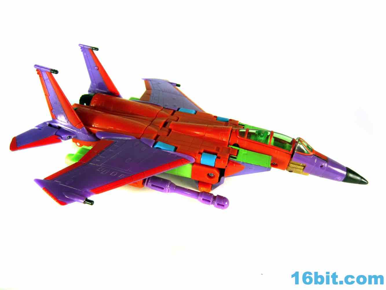 As a robot, this figure matches the paint job of the 1991 Action Masters non-transforming toy. This means it's gorgeous. A gold helmet on a blue face is hardly the most eye-searing deco choice as there are plenty of pink parts, purple pieces, and blue bits as well as green goodness all over. As a repaint of the 2006 Classics Starscream - arguably the repaint that's as loved as it is repainted - they did a bang-up job making a convincing update to that old robot mode. It's a great choice, we also saw how this "heroic" figure had a companion in Starscream... who was in Jetfire's colors. The clear, white-outlined Decepticon logo is a neat one-size fits all cheat because it's not really the purple Decepticon symbol from 1991, nor is it the heroic red "Shattered Glass" version of the symbol. They really did a great job straddling the fence here.
