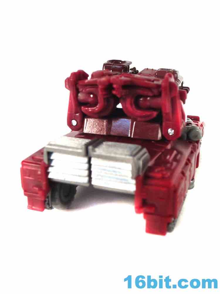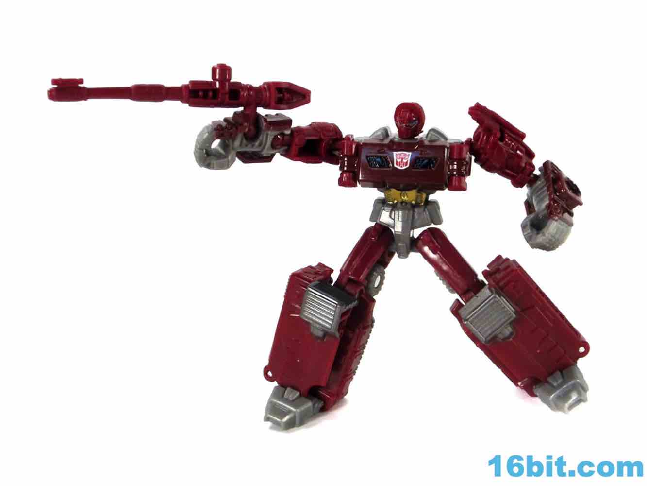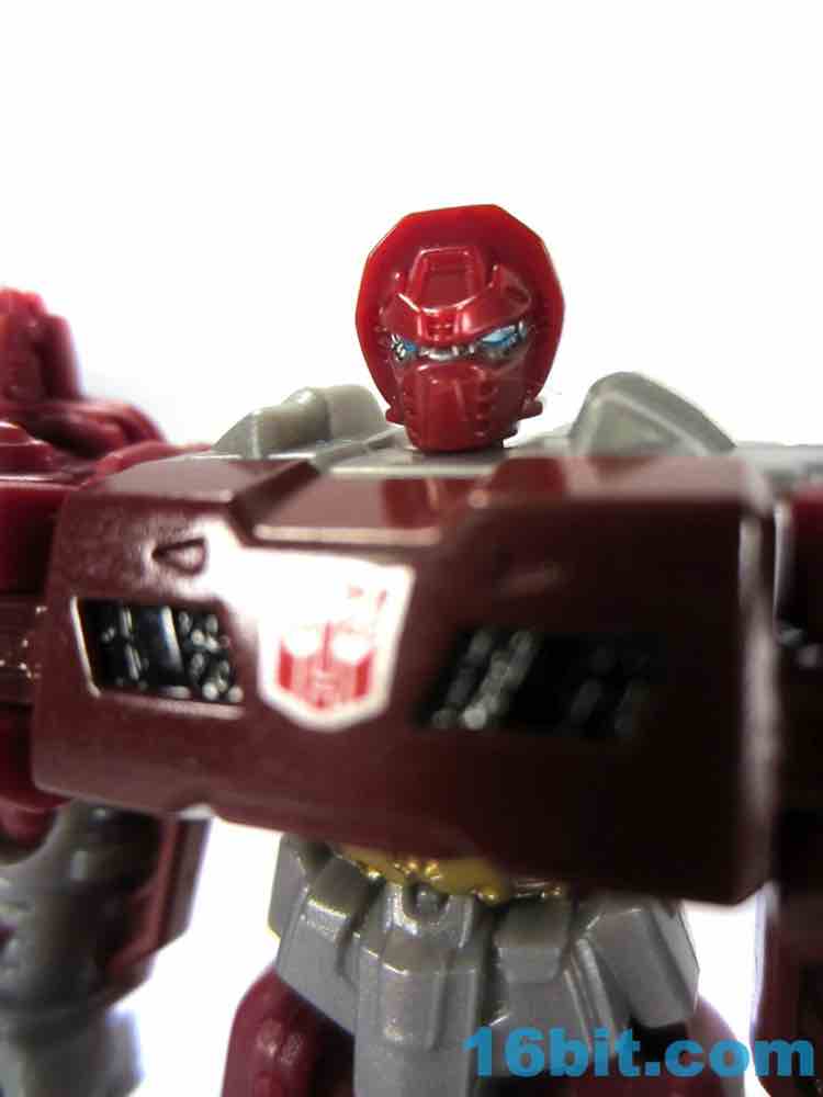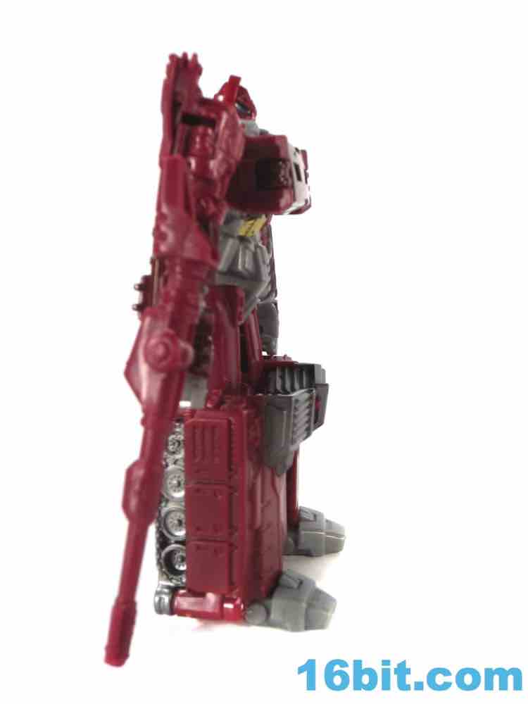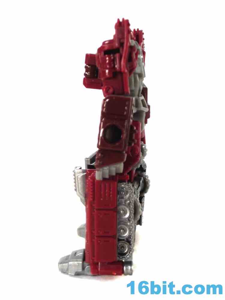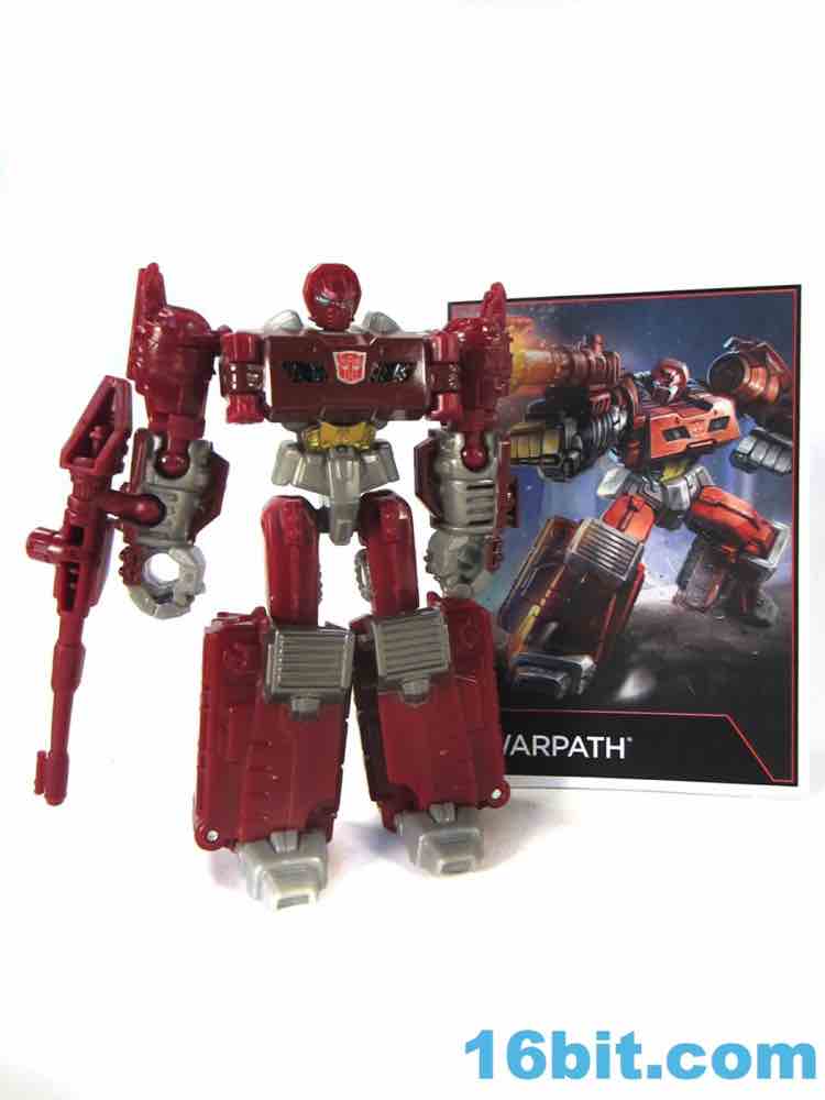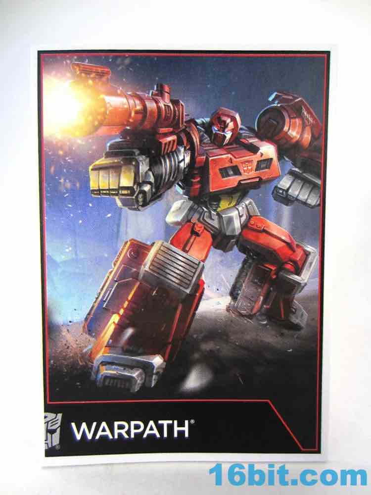 The deco is very Warpath-esque with new art on his trading card that actually resembles the new toy. The paint is what makes the figure - Warpath is mostly a dark red and all vestiges of the "caution" tape deco on Megatron are gone. He's not as colorful as there are only shades of red, black, and grey, but you can look at it and go "hey, that's Warpath! Where is his uni-nipple cannon?" One particularly nice detail on the head is that they actually squeezed quite a bit of color in there. Blue eyes are surrounded by traces of a silver face under a red mask, which is actually quite different from previous releases. This gives his relatively tiny face more personality, although it may be difficult to actually see it.