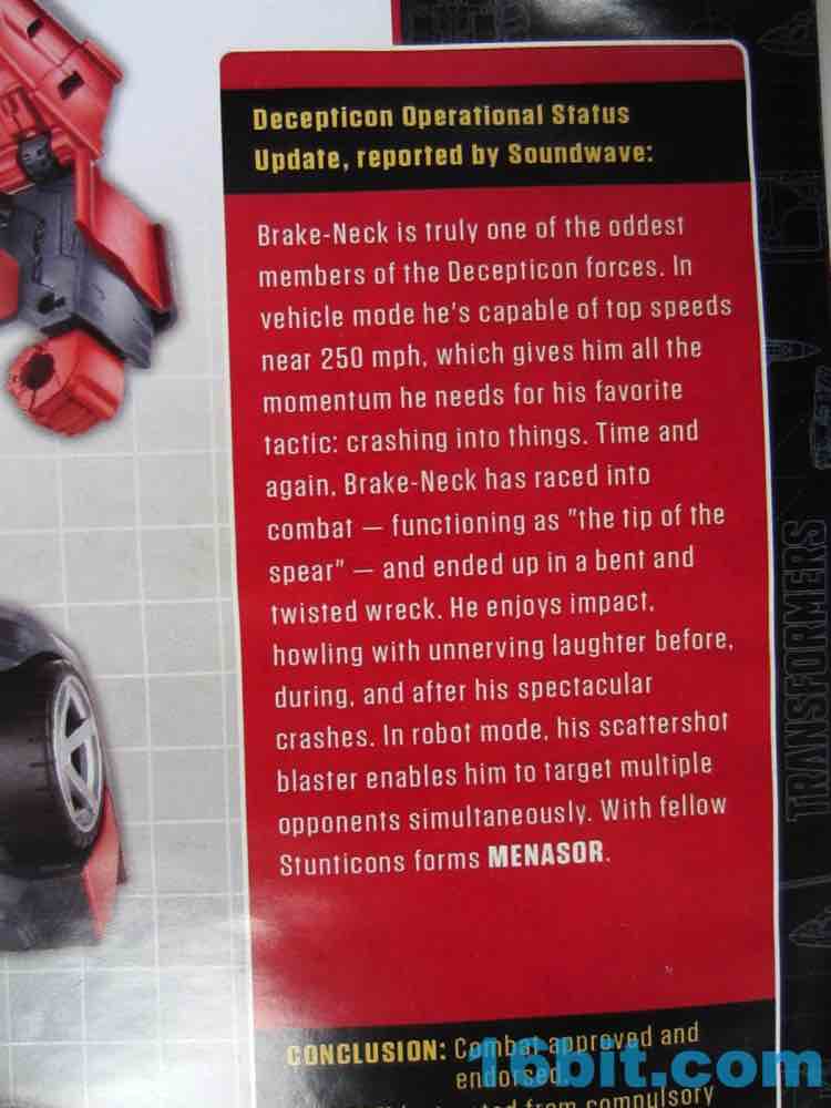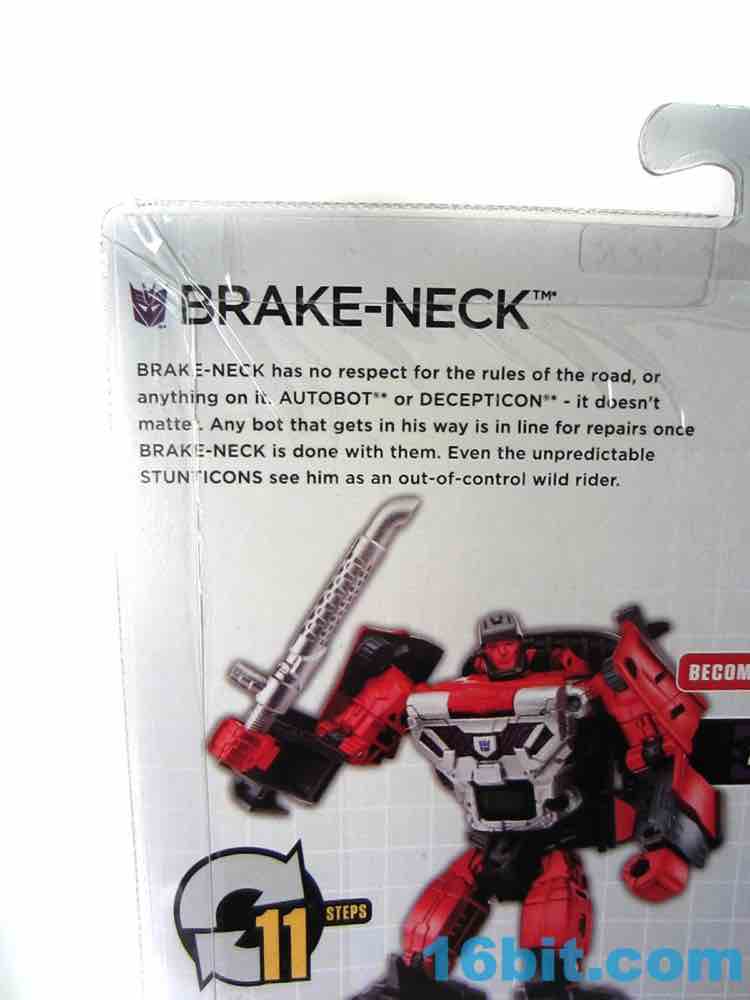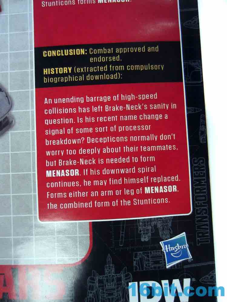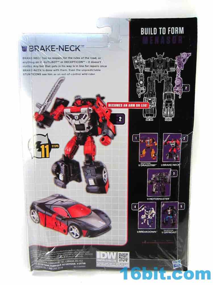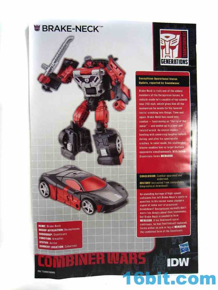 I kept spelling this character's name as "Break-Neck" rather than Brake-Neck until a friend pointed out that I was doing it wrong. I said "I guess that makes more sense." He said "No it doesn't!" He's right. But this figure makes sense, mostly because we were clamoring for it as a community - while it isn't an all-new mold, it is the required-by-law G1 update of a combiner limb that, when serving as part of Menasor, performs the same function as Offroad in pretty much the exact same colors. For those that want IDW accuracy, you can have that. For those wanting G1 accuracy, go buy the vintage toy - or I guess this is a good substitute. Brake-Neck is a decent Wildrider substitute, and a fun toy in and of himself, but a limb's a limb. (Having said that, go buy this one.)