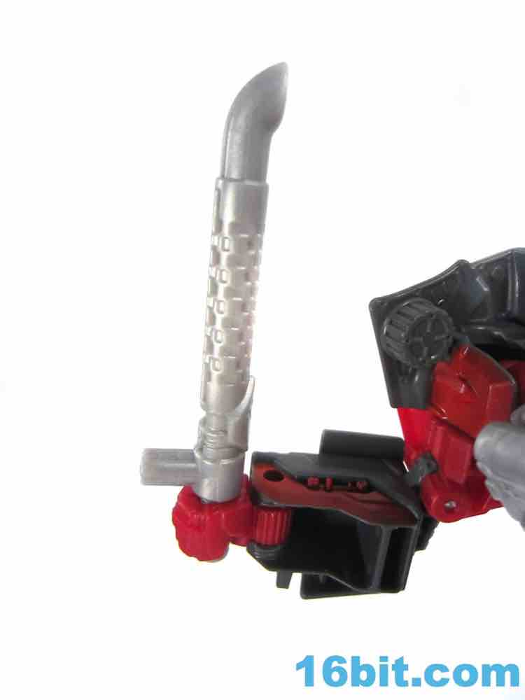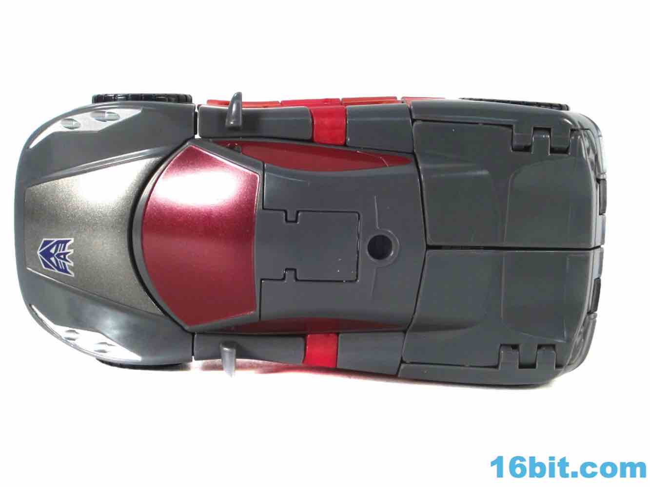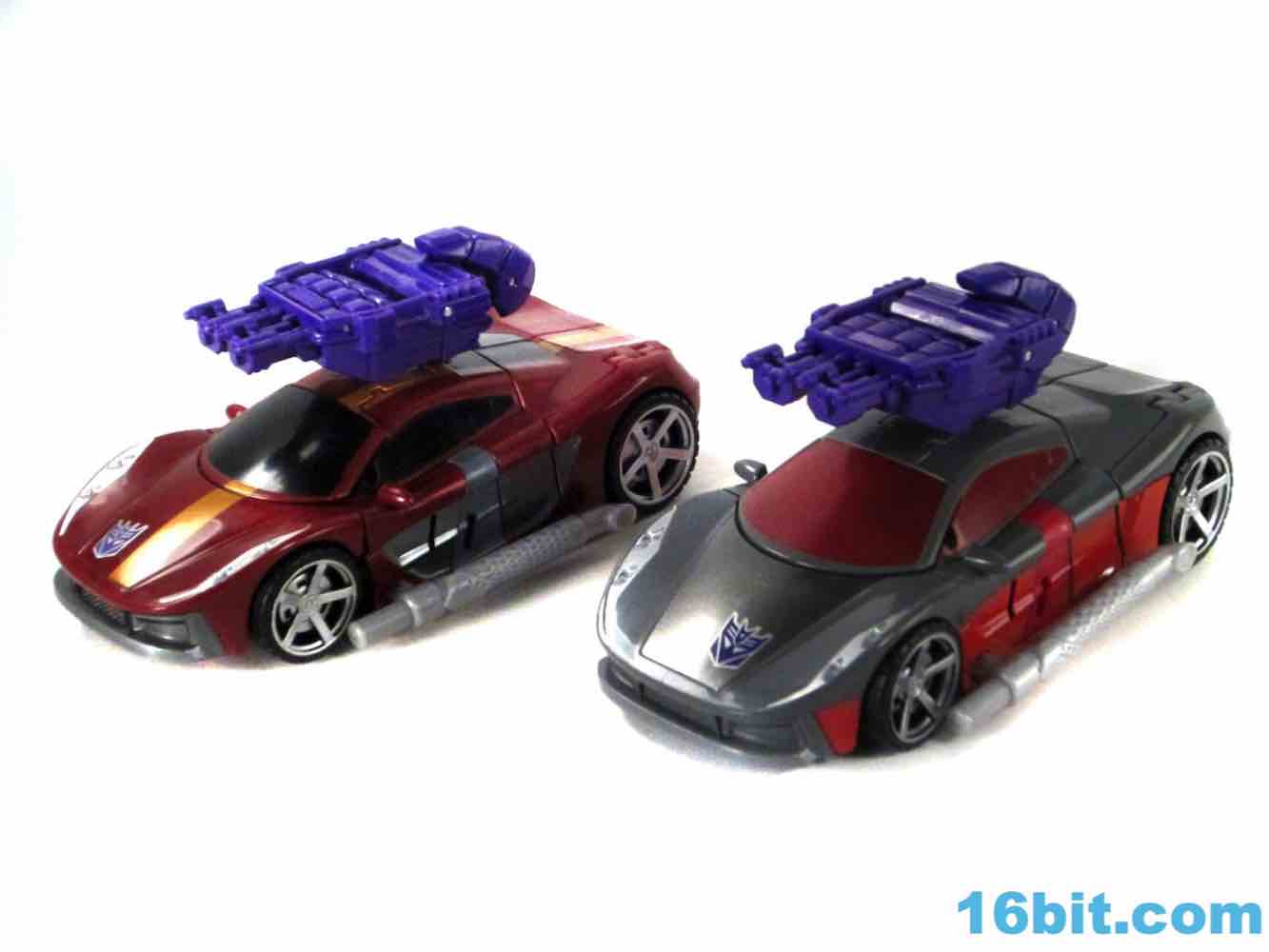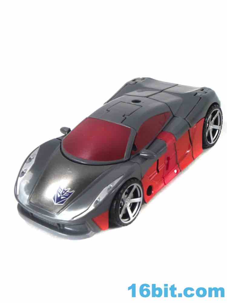 As a car, Brake-Neck works as a great combination of Offroad's colors on Dead End's chassis. No obvious mold changes were made for this car, but you do get niceties like painted wheels, headlights, and that silver hood for some reason. The red stripe of Offroad's, er, "bolts" is now an enormous red stripe which blends in with some unpaintable red plastic that is a bit of an eyesore in this mode, but it's not a problem from where I sit. The exhaust pipe weapon plugs in to the side of the car - it's the same one Dead End got - and the Decepticon symbol pops nicely as do the red windows. For a same-mold figure, it's a good one.
