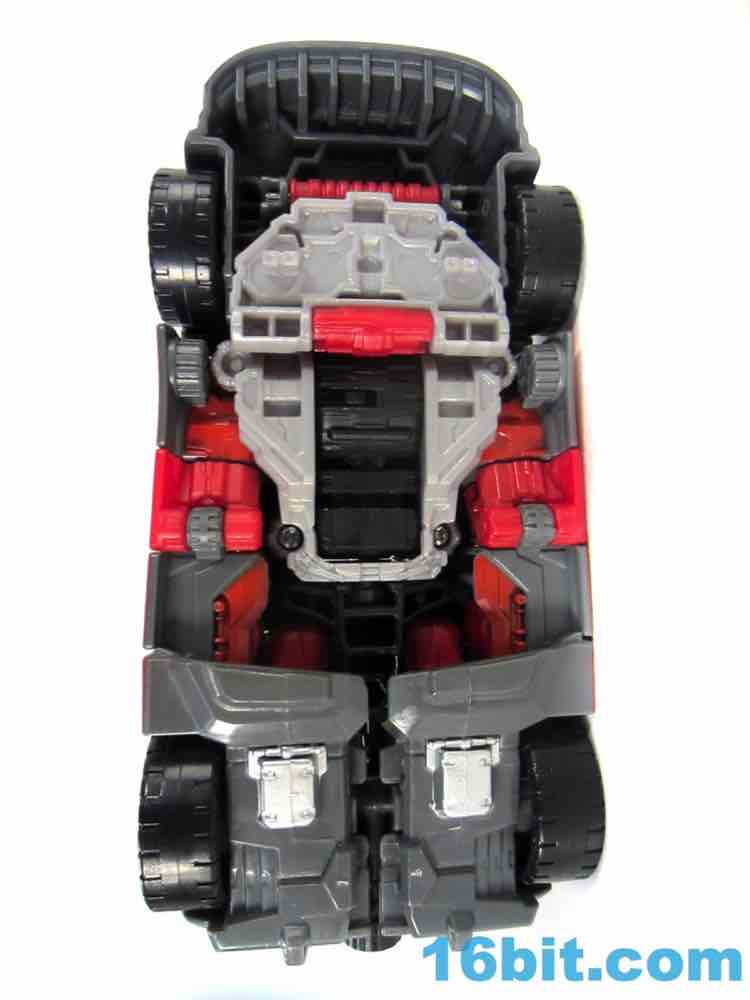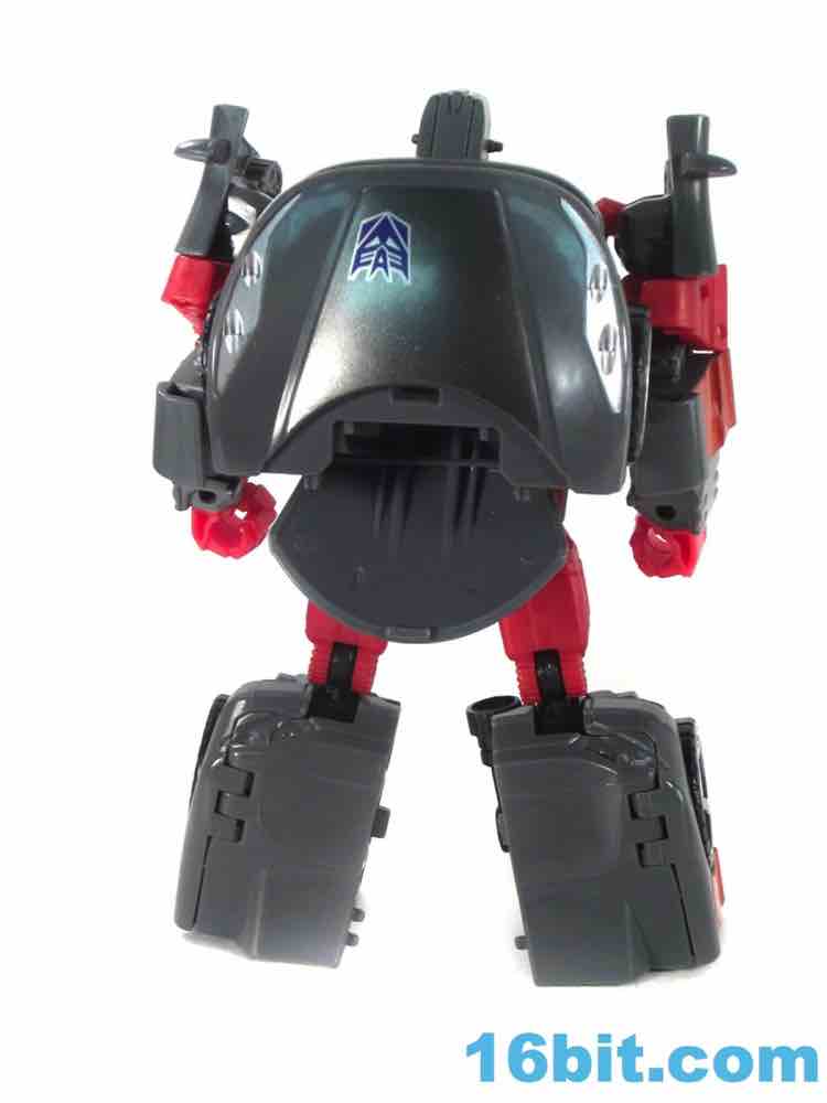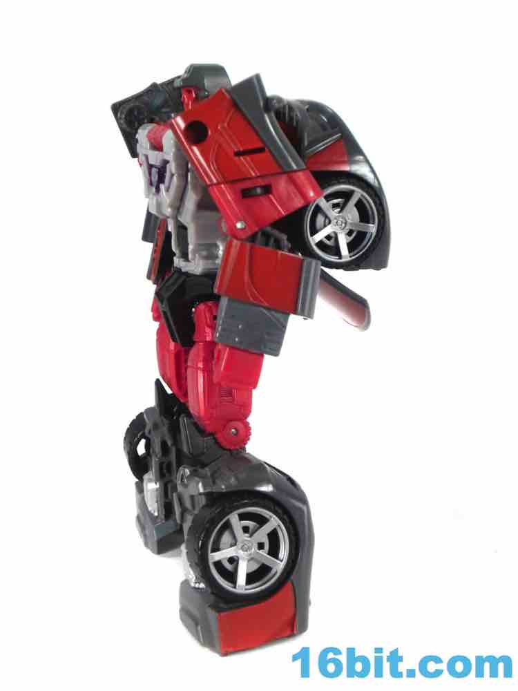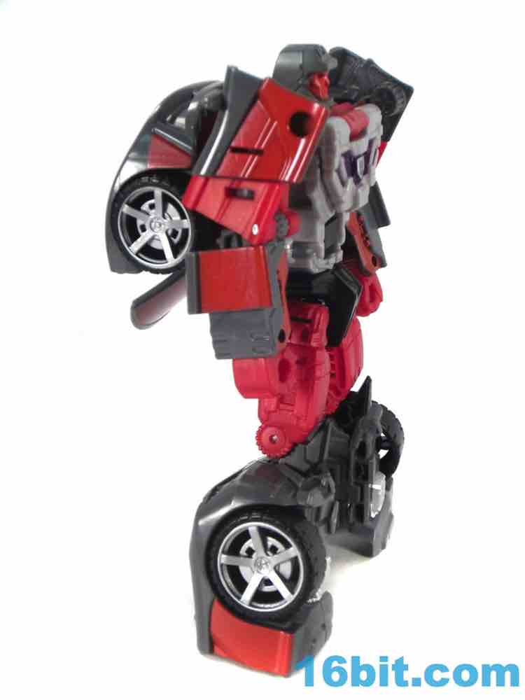 Transformation is identical to Dead-End and similar to the many other cars - with some twists. The exhaust pipe of sorts in the right leg folds up and down to allow you to plug in the wrist during super robot mode, and the hood of the car is somewhat complicated in its getting a few panels just right. It's satisfying when it works, but it - along with the Brakedown mold - isn't particularly "simple" like Dragstrip or the Aerialbots. You probably won't need instructions to figure out the vaguely tricky bits, and I like the clever element of the "shins" opening up to fold back and engulf the thighs. It works well.