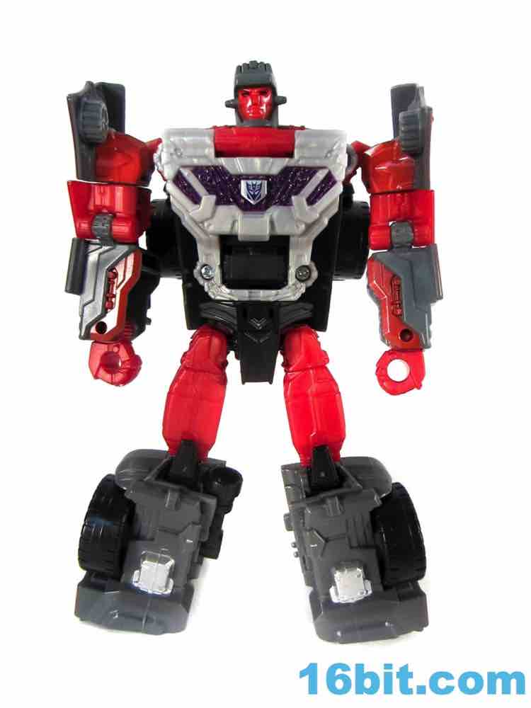 The 5 1/4-inch tall robot mode has about 18 points of articulation, bringing you pretty much everything you could want in a substitute for Offroad. Instead of a striking green face, the robot goes with a new head with a red one as well as red and purple highlights. The torso looks something like a face, and you get your Decepticon sigil front and center. Paint applications are very similar to Dead End, but you'll notice some key differences in the chest and... well, mostly the chest and shoulders. They're pretty similar otherwise, Brake-Neck has the edge in terms of visible paint and a gaping maw belly button. It's a charming figure who probably has more personality than intended thanks to the deft use of paint.